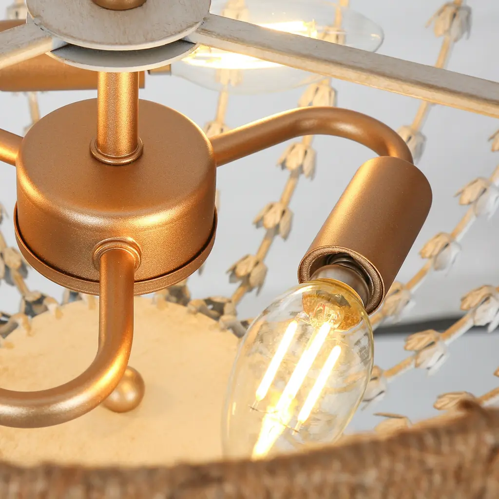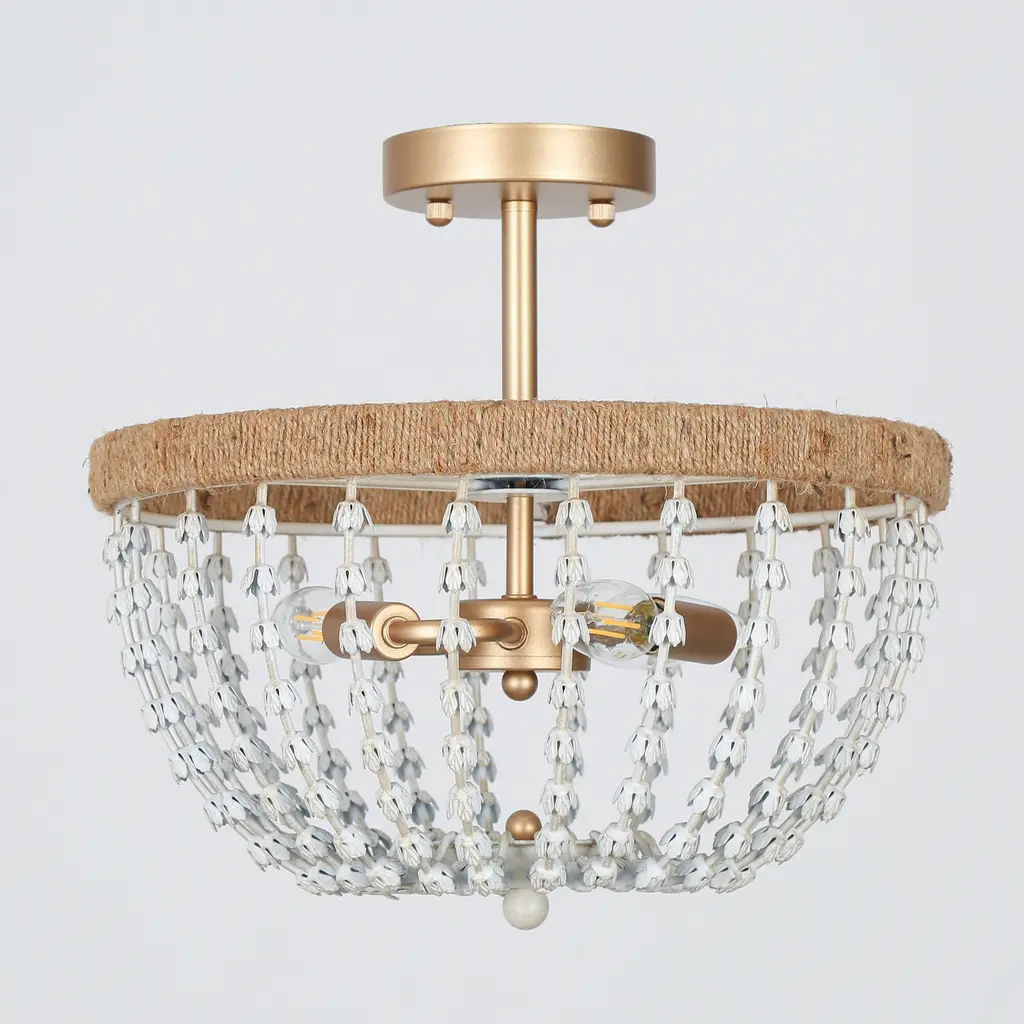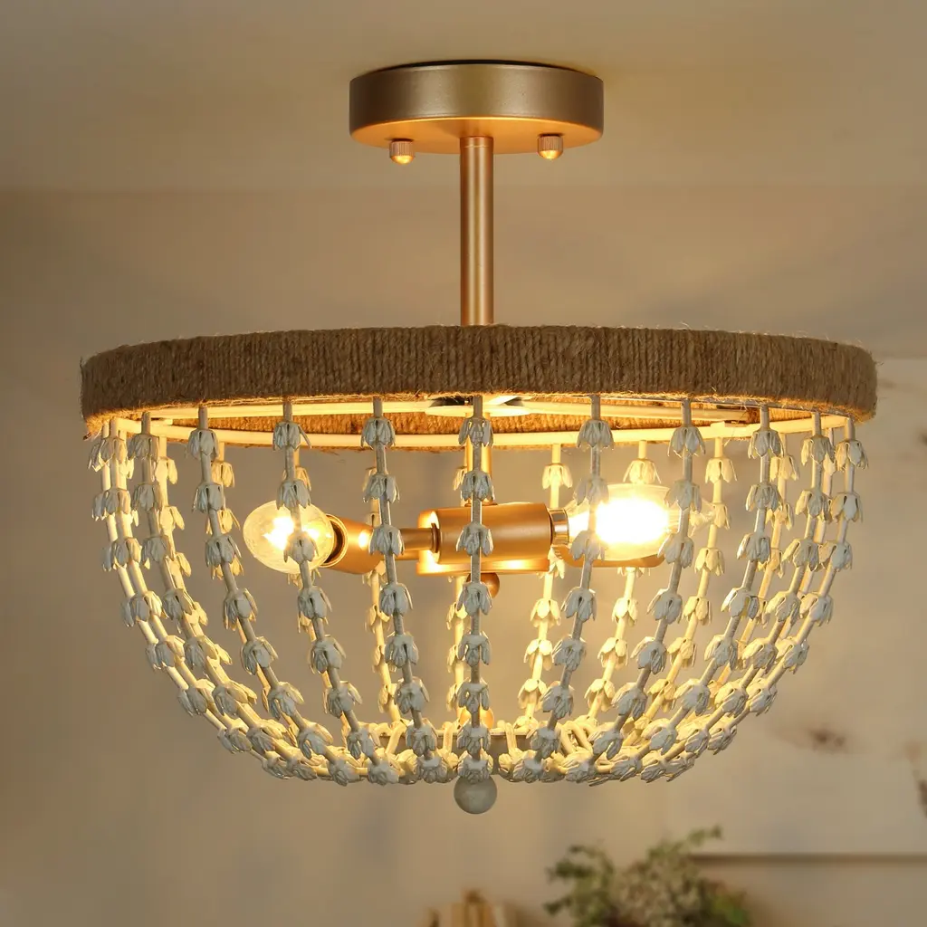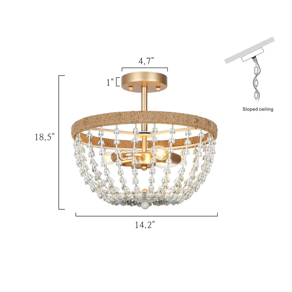 Multiple rows of graduated faux white wood beads grace the gold metal frame of this elegant and contemporary chandelier. This coastal semi-flush mount ceiling light features a gold frame twined by handcrafted jute rope, which endows it with a light natural feel. With 3 lights to provide sufficient charming light for your living room, dining room, bedroom, and foyer. Click to view coastal chandelier in this series Specification: Color: Gold, distressed whiteMaterial: Metal, Fabric RopeThe Lamp Size: D14.2" x H18.5" Canopy Size: D4.7" x H1"Weight: 5.3 lbsLights Qty: 3Bulb Requirement: E12 base/ Max 40W (BULBS NOT INCLUDED) Bulb Type: / LED/ EdisonDimmable: Compatible with dimmer switchInstallation: EasyCertificate: UL listed for safe useWarranty: 1-year Limited Manufacturer
