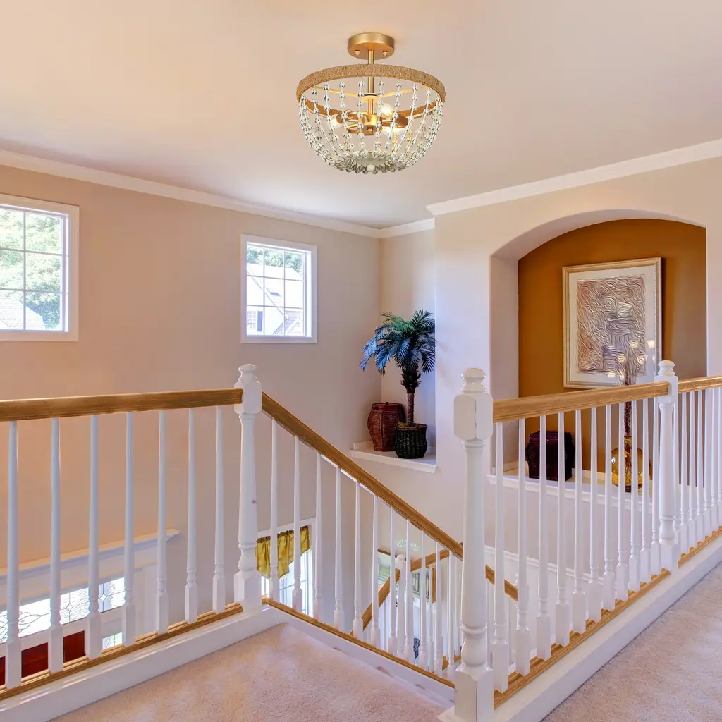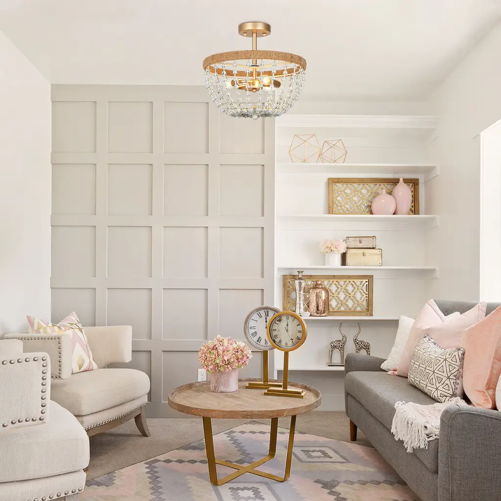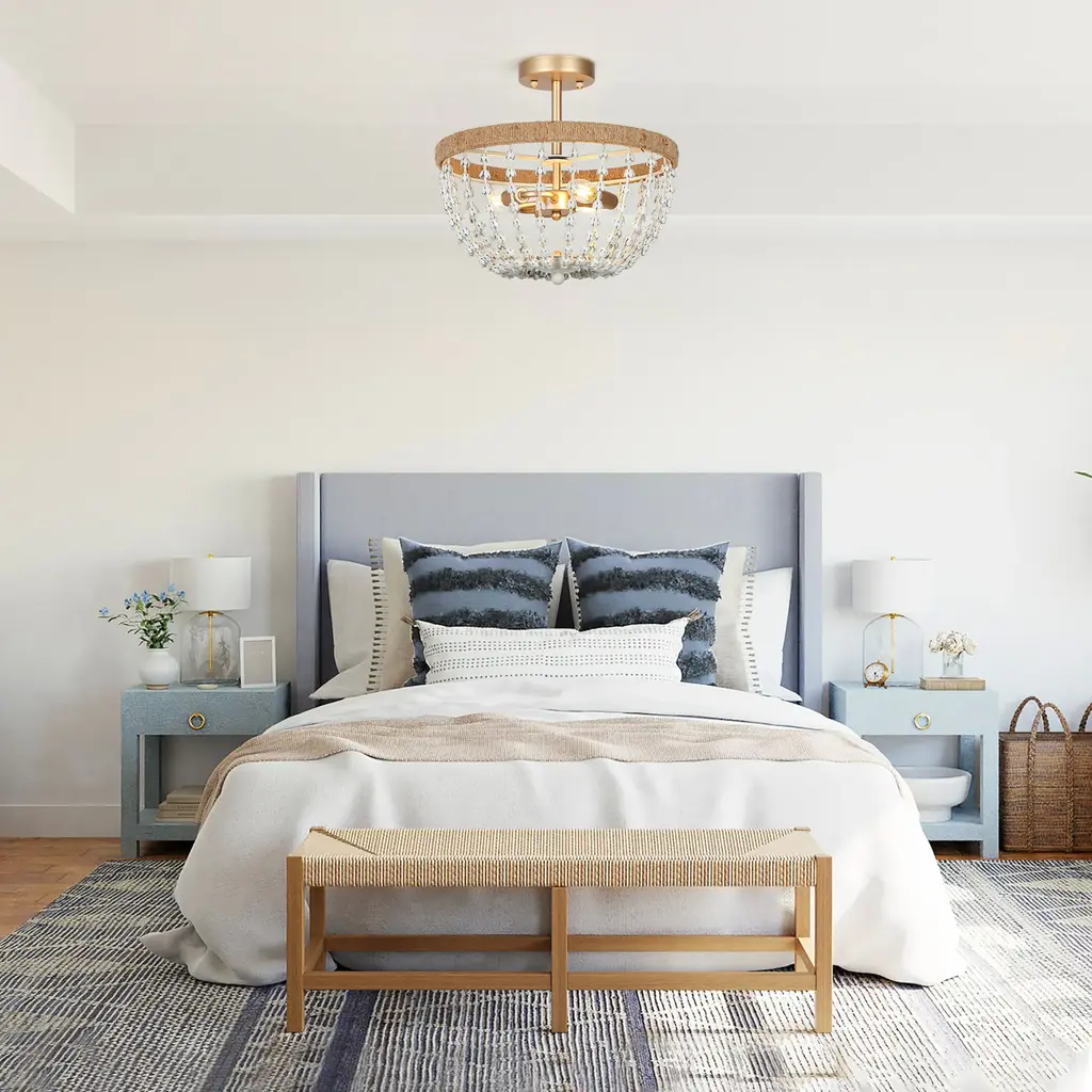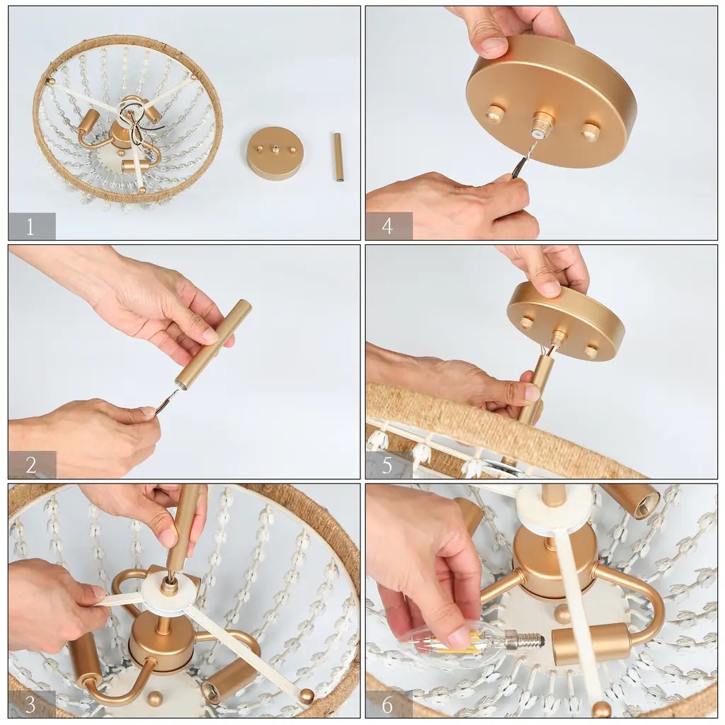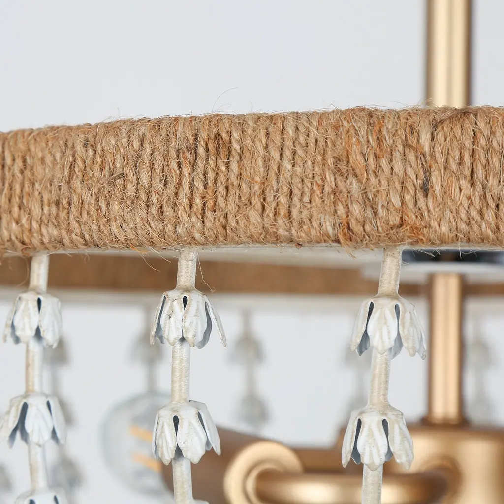Multiple rows of graduated faux white wood beads grace the gold metal frame of this elegant and contemporary chandelier. This coastal semi-flush mount ceiling light features a gold frame twined by handcrafted jute rope, which endows it with a light natural feel. With 3 lights to provide sufficient charming light for your living room, dining room, bedroom, and foyer. Click to view coastal chandelier in this series Specification: Color: Gold, distressed whiteMaterial: Metal, Fabric RopeThe Lamp Size: D14.2" x H18.5" Canopy Size: D4.7" x H1"Weight: 5.3 lbsLights Qty: 3Bulb Requirement: E12 base/ Max 40W (BULBS NOT INCLUDED) Bulb Type: / LED/ EdisonDimmable: Compatible with dimmer switchInstallation: EasyCertificate: UL listed for safe useWarranty: 1-year Limited Manufacturer
