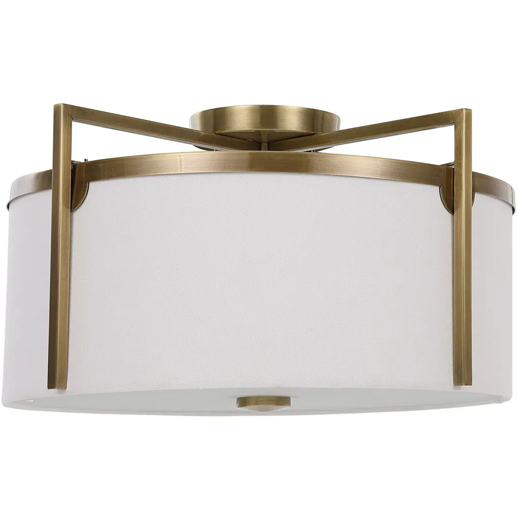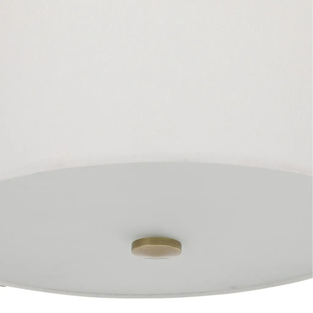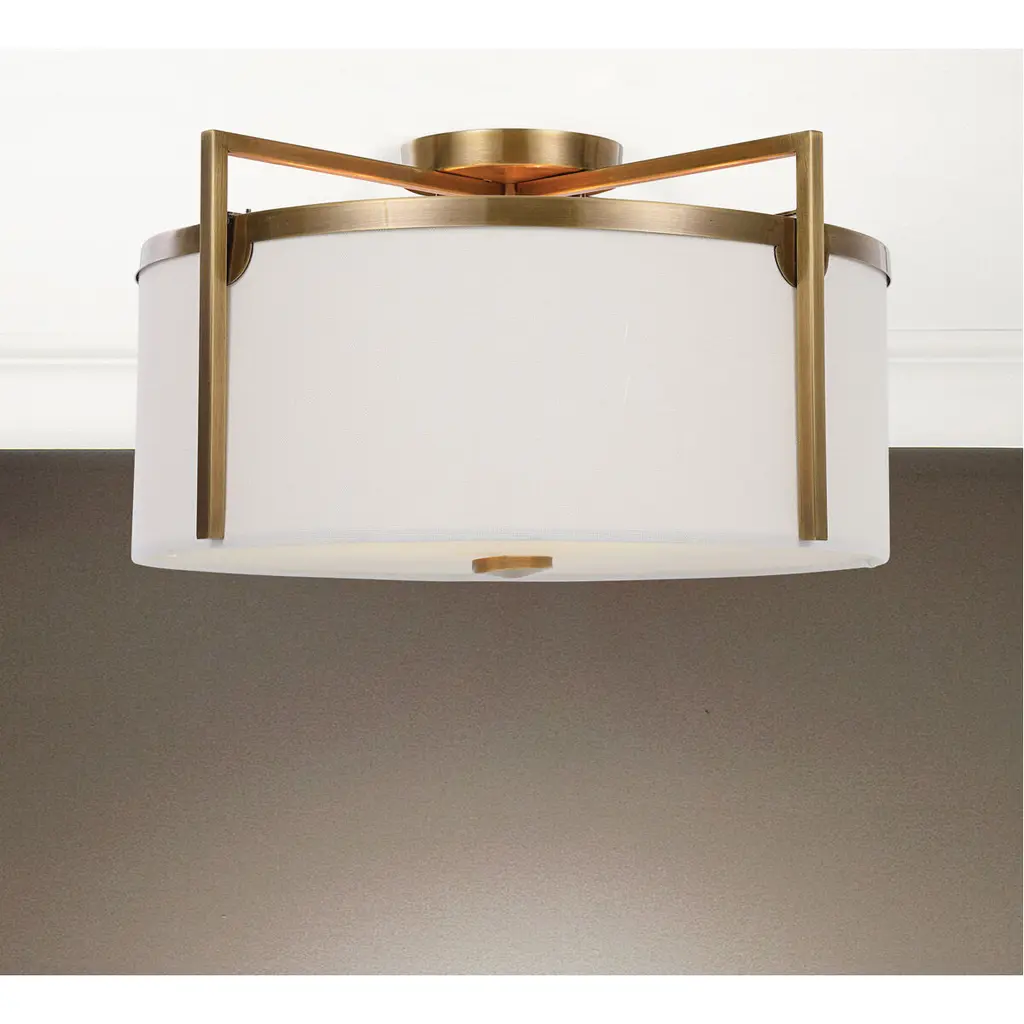 Chic And Versatile With Clean Lines This 3 Lt. Semi Flush Mount Features An Antique Brass Finish With Off White Linen Hard Back Shade With A Central Frosted Glass Diffuser. 3-100 Watt Max Edison Sockets.