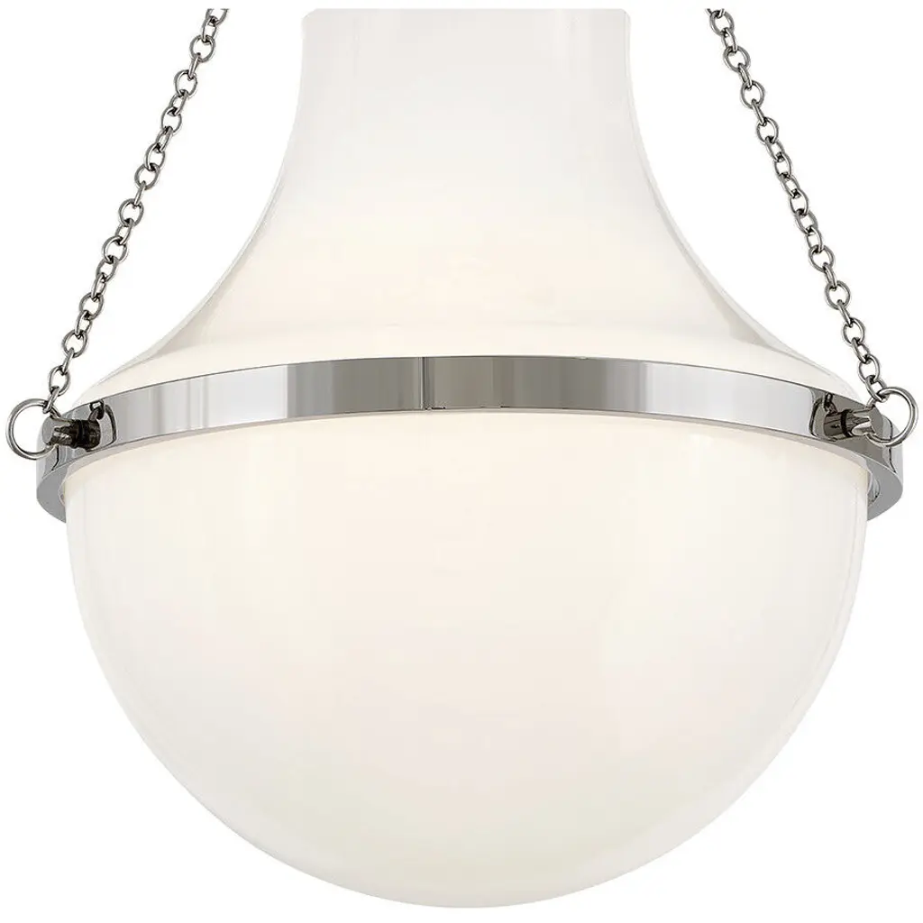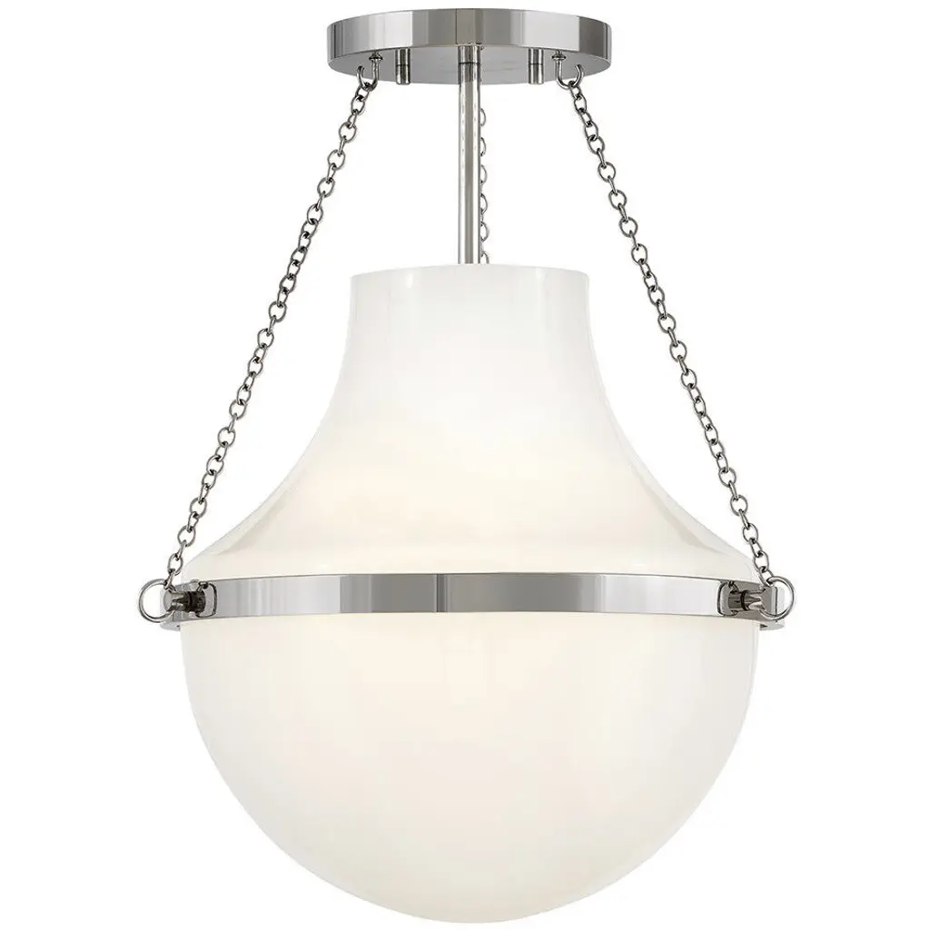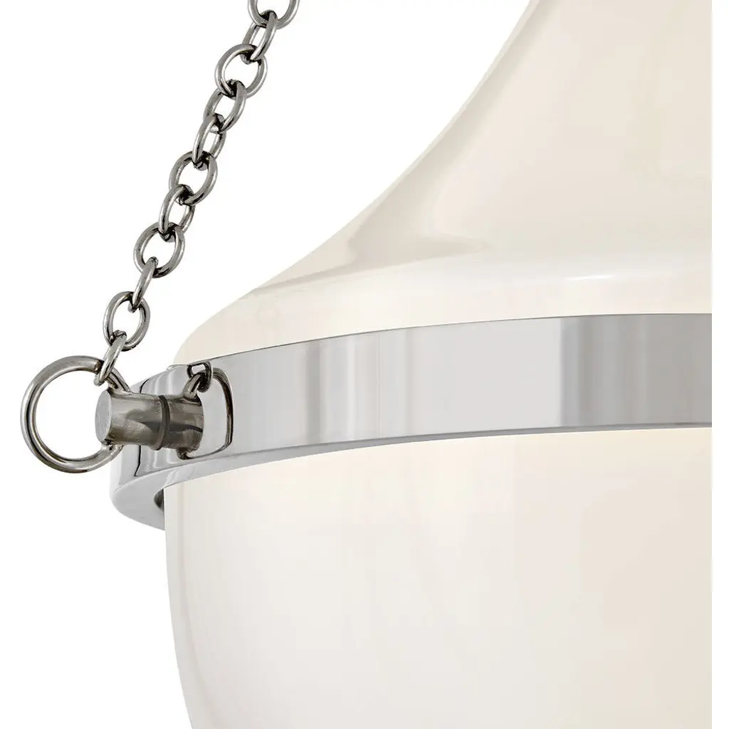 Fusing a sculpted, modern form with classically styled details, Collins features a transitional teardrop shade crafted from blown, cased opal glass. A central metal band and delicate chain uprights are available in Black Oxide, Heritage Brass, or Polished Nickel finishes.