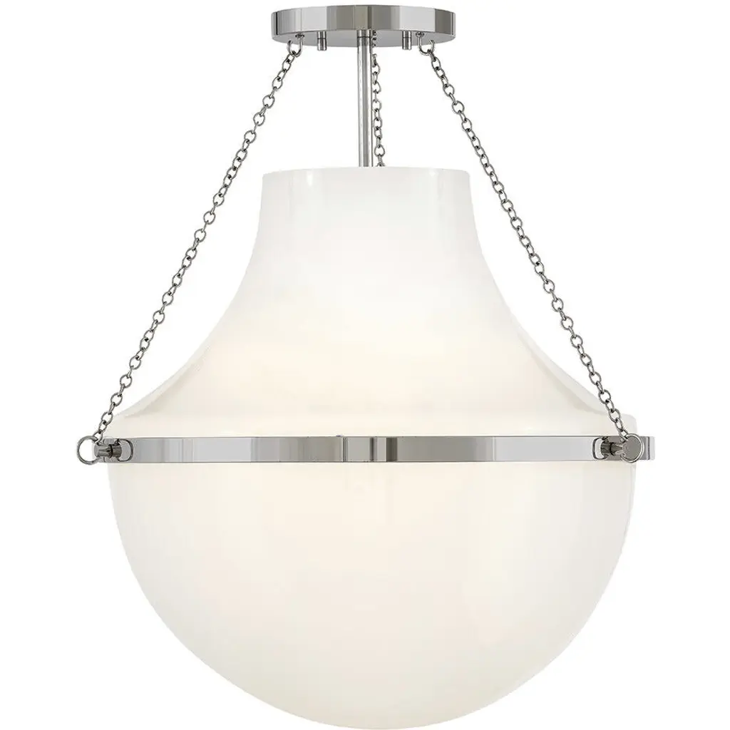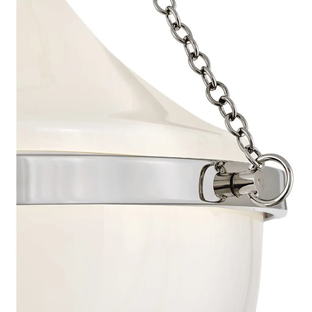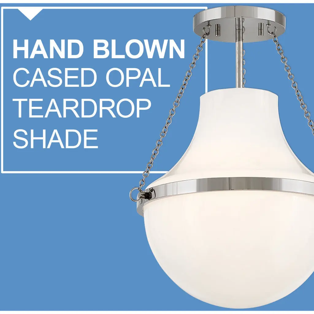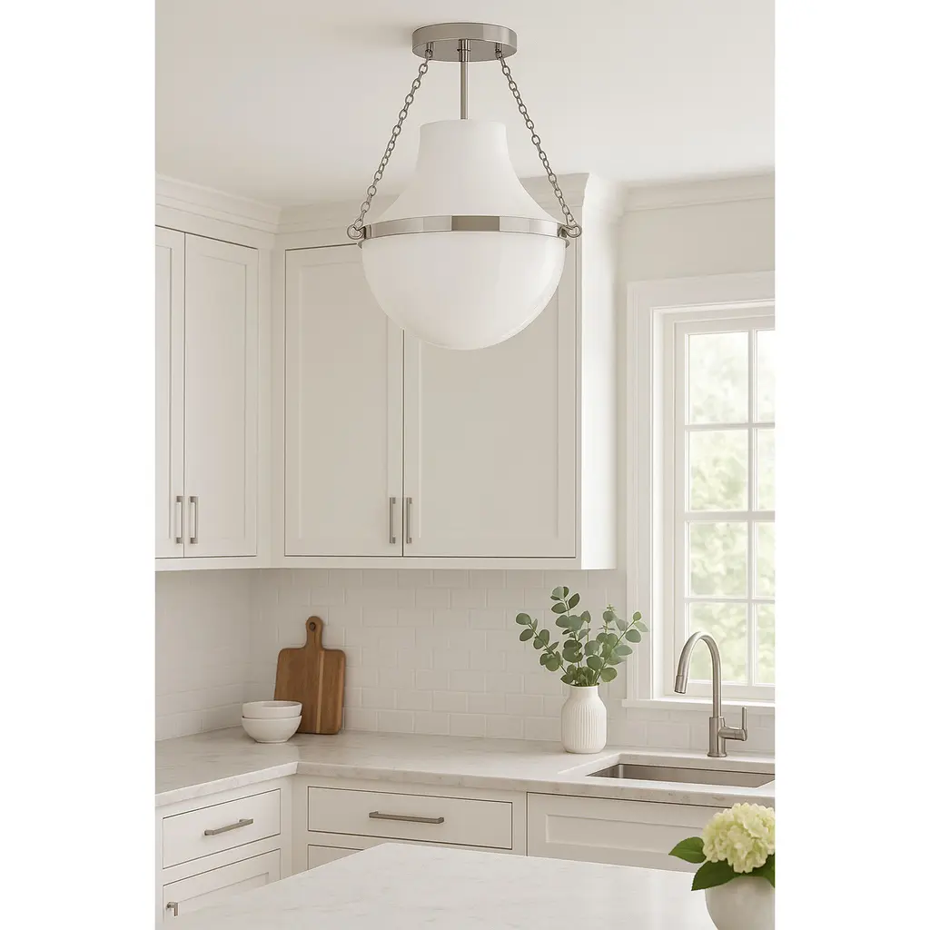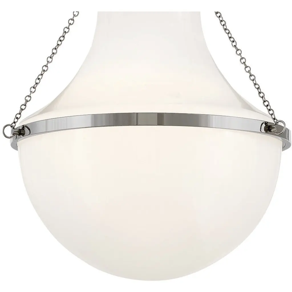 Fusing a sculpted, modern form with classically styled details, Collins features a transitional teardrop shade crafted from blown, cased opal glass. A central metal band and delicate chain uprights are available in Black Oxide, Heritage Brass, or Polished Nickel finishes.