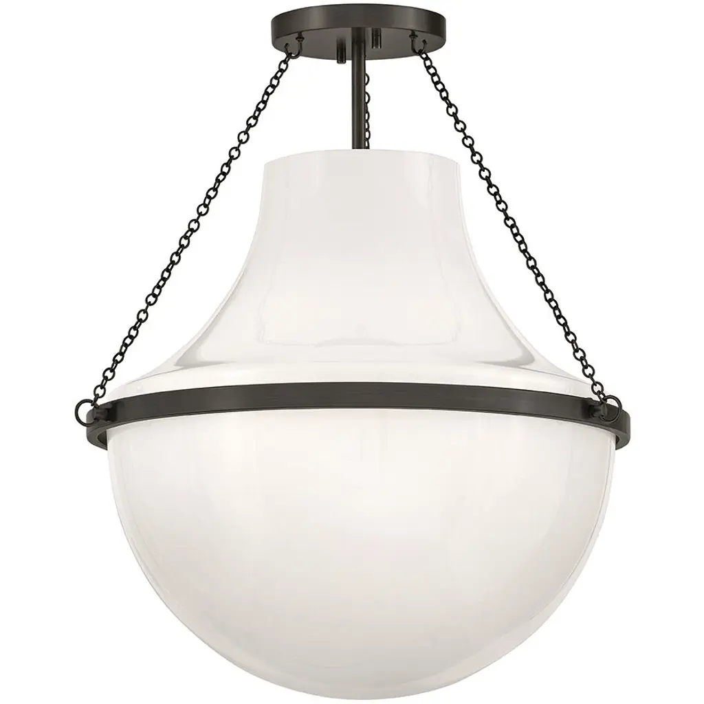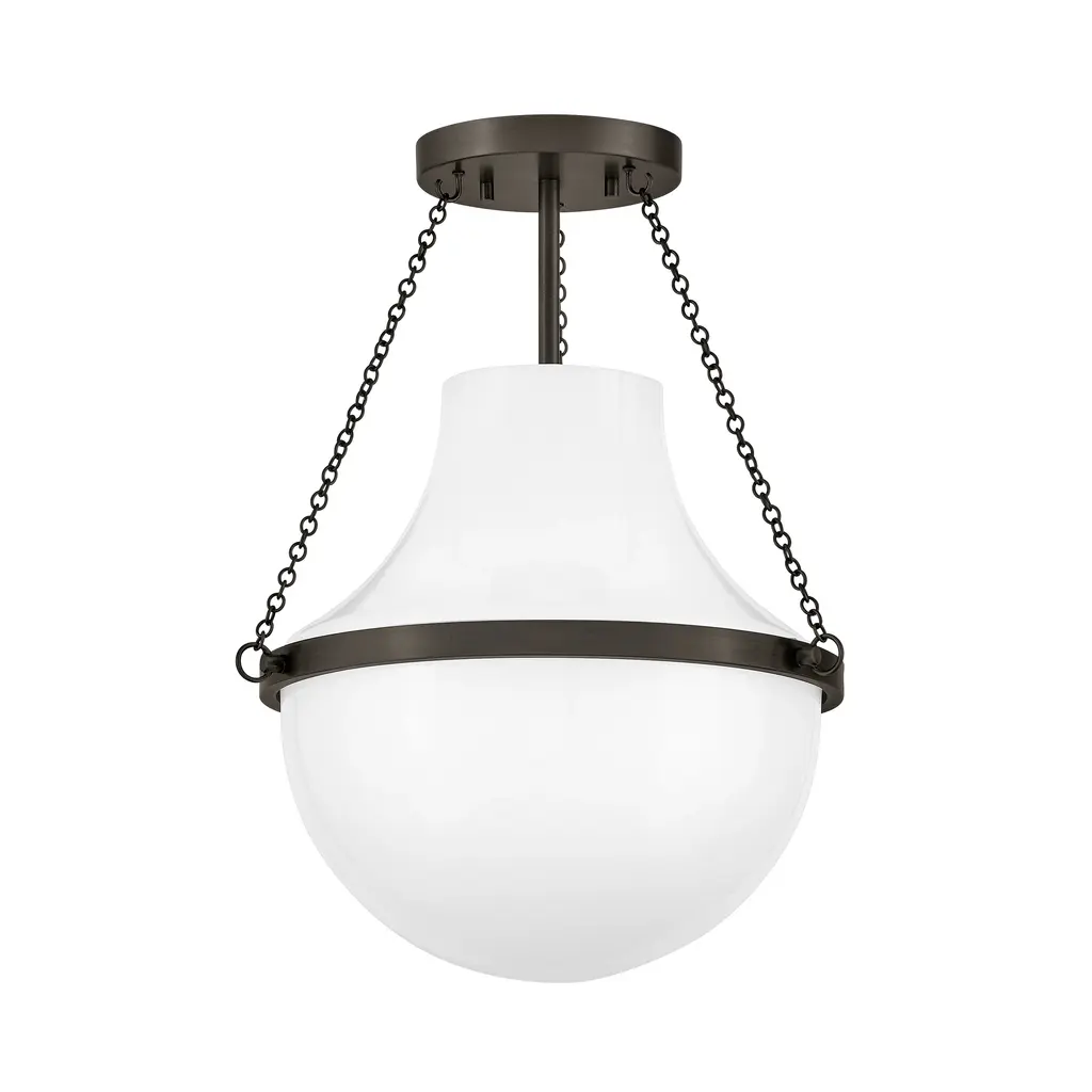 A beautiful fusion of modern form and classic detail, the Collins Semi Flush Mount from Hinkley offers a sophisticated, transitional look. This elegant fixture is defined by its sculpted, teardrop-shaped shade, crafted from hand-blown, cased opal glass for a soft and uniform glow. The shade is accented with a central metal band and suspended by delicate chain uprights, adding a touch of jewelry-like character. A perfect blend of sculpted glass and refined hardware, it brings balanced, timeless style to any space. Highlights:
