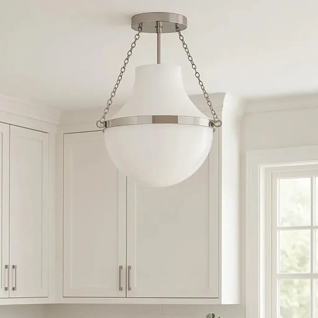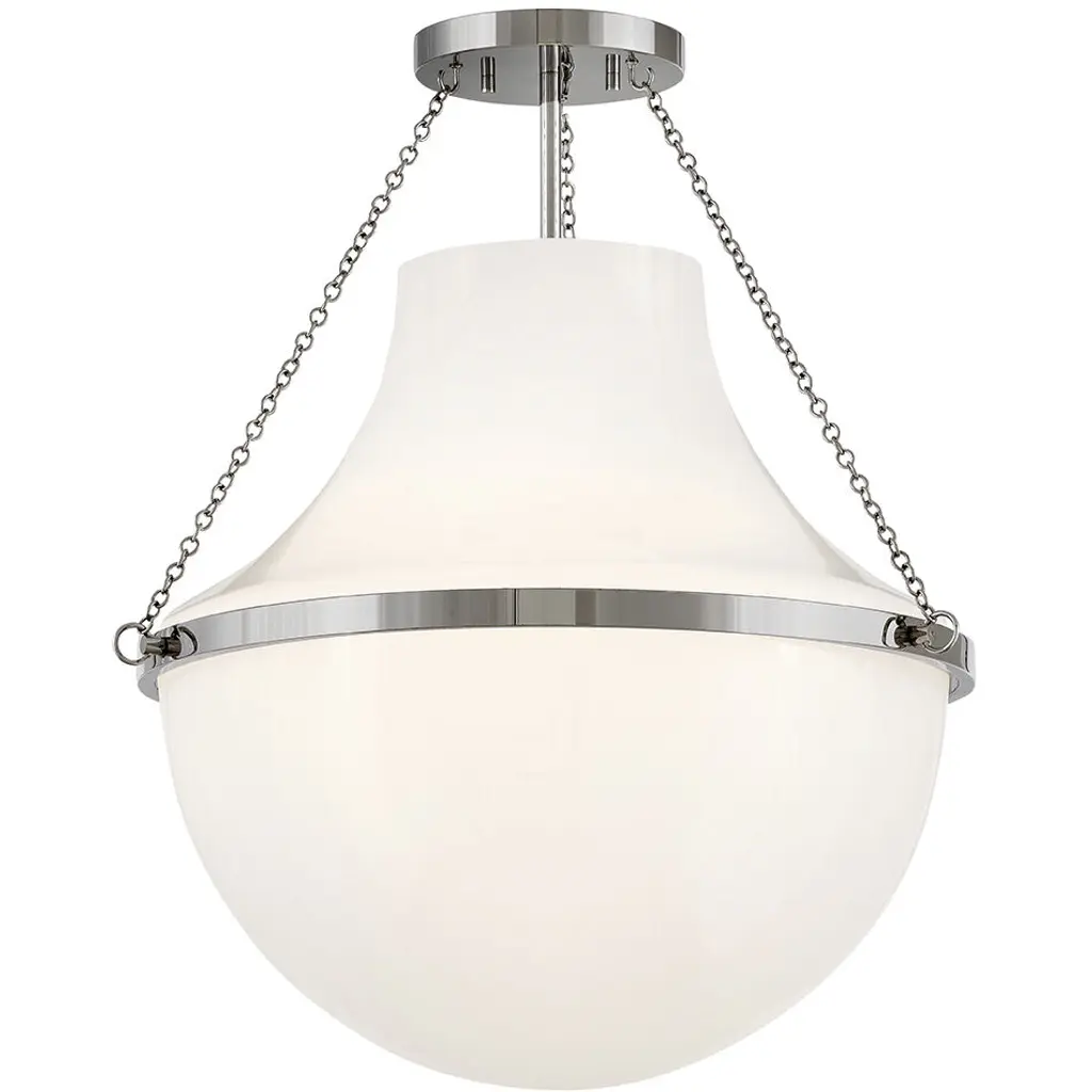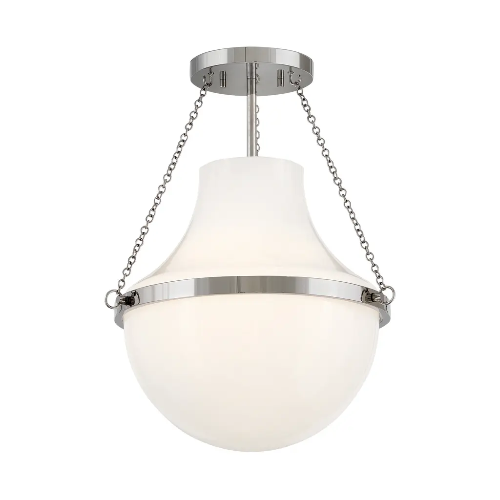 A beautiful fusion of modern form and classic detail, the Collins Semi Flush Mount from Hinkley offers a sophisticated, transitional look. This elegant fixture is defined by its sculpted, teardrop-shaped shade, crafted from hand-blown, cased opal glass for a soft and uniform glow. The shade is accented with a central metal band and suspended by delicate chain uprights, adding a touch of jewelry-like character. A perfect blend of sculpted glass and refined hardware, it brings balanced, timeless style to any space. Highlights: