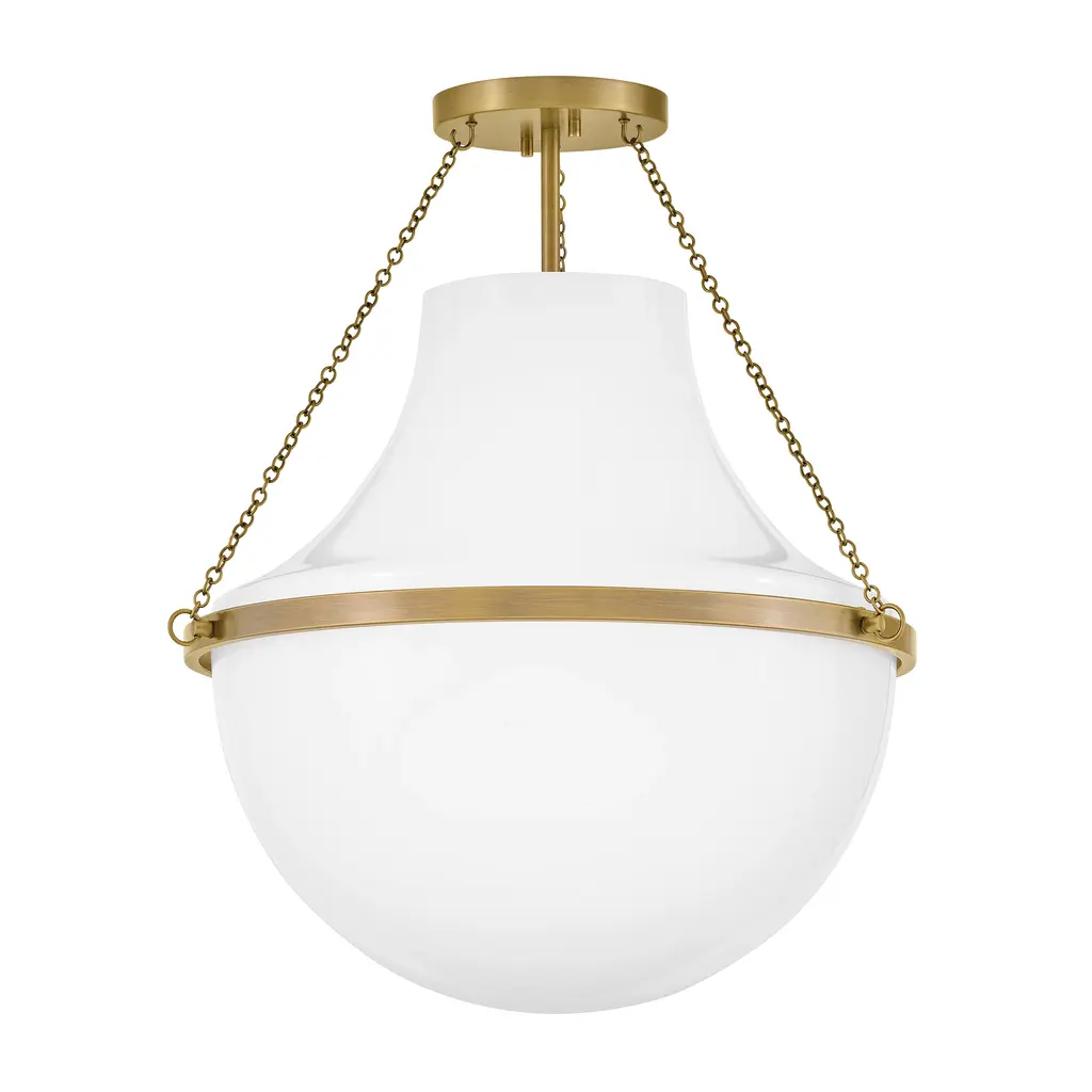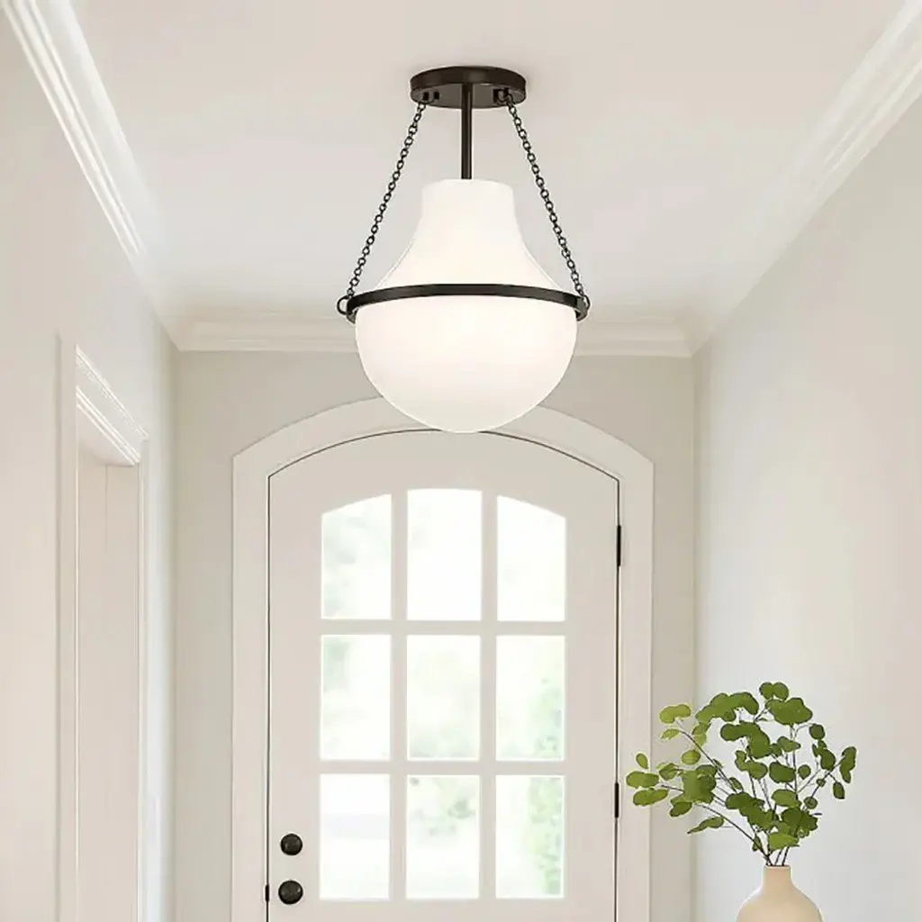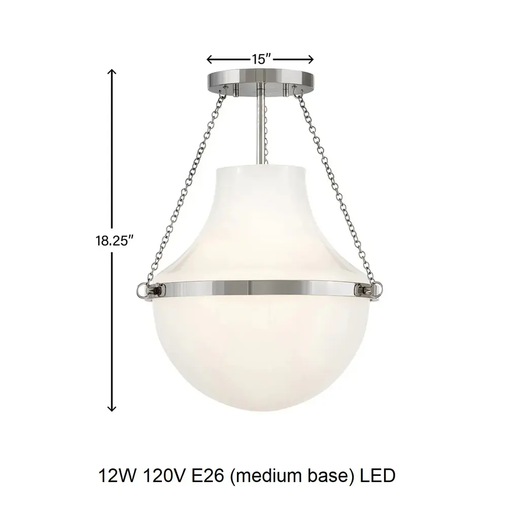 A beautiful fusion of modern form and classic detail, the Collins Semi Flush Mount from Hinkley offers a sophisticated, transitional look. This elegant fixture is defined by its sculpted, teardrop-shaped shade, crafted from hand-blown, cased opal glass for a soft and uniform glow. The shade is accented with a central metal band and suspended by delicate chain uprights, adding a touch of jewelry-like character. A perfect blend of sculpted glass and refined hardware, it brings balanced, timeless style to any space. Highlights: