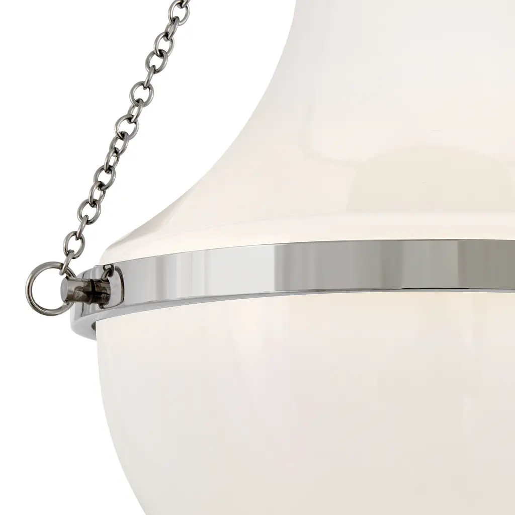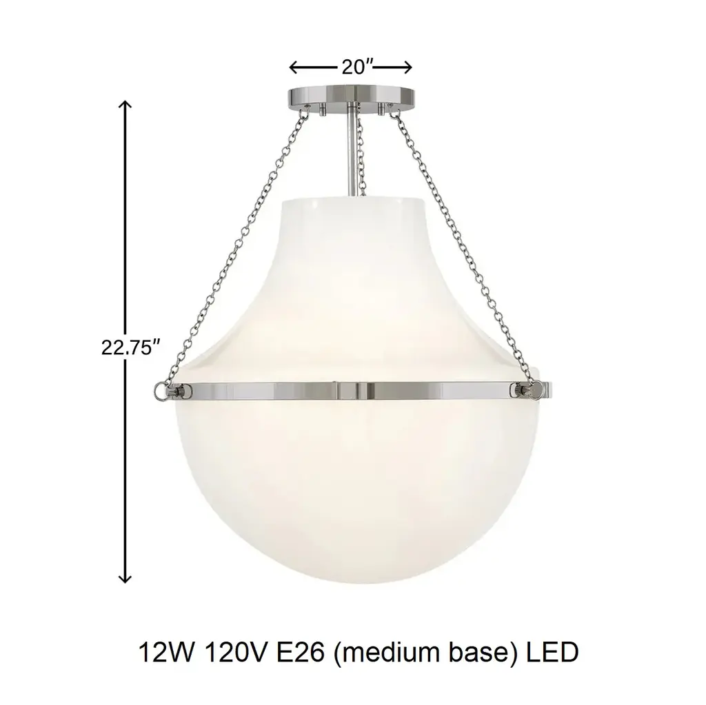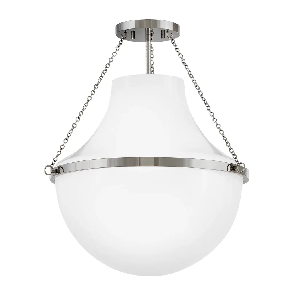 A beautiful fusion of modern form and classic detail, the Collins Semi Flush Mount from Hinkley offers a sophisticated, transitional look. This elegant fixture is defined by its sculpted, teardrop-shaped shade, crafted from hand-blown, cased opal glass for a soft and uniform glow. The shade is accented with a central metal band and suspended by delicate chain uprights, adding a touch of jewelry-like character. A perfect blend of sculpted glass and refined hardware, it brings balanced, timeless style to any space. Highlights: