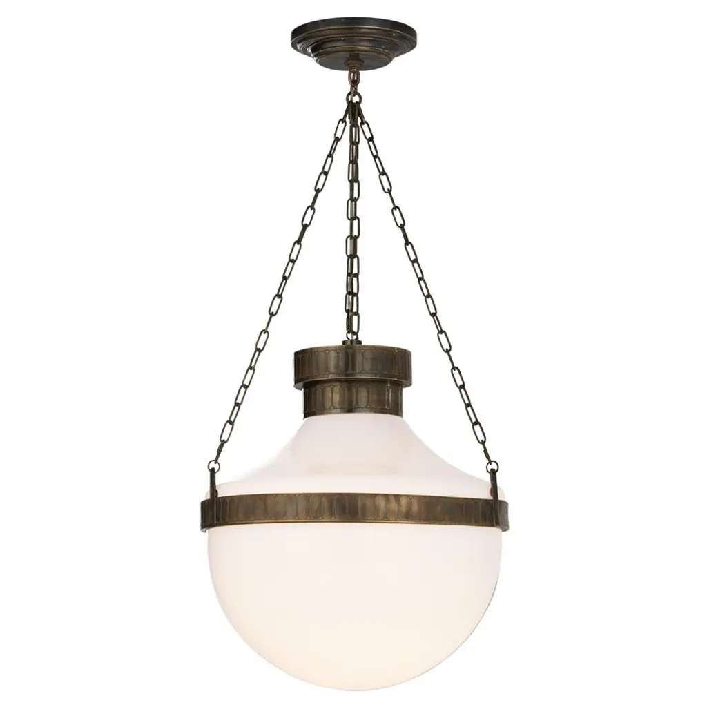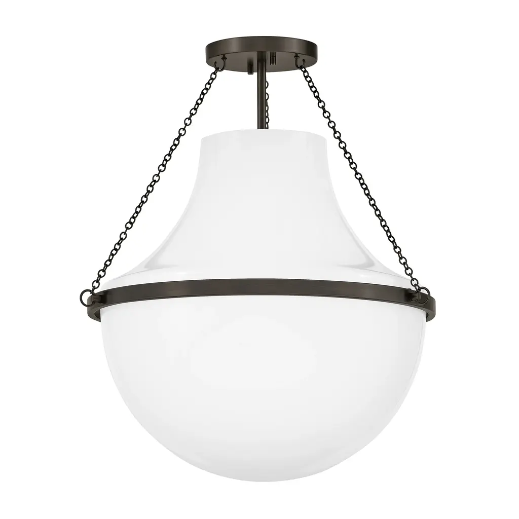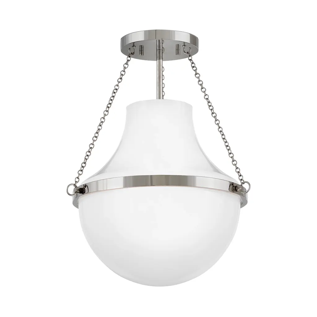 A beautiful fusion of modern form and classic detail, the Collins Semi Flush Mount from Hinkley offers a sophisticated, transitional look. This elegant fixture is defined by its sculpted, teardrop-shaped shade, crafted from hand-blown, cased opal glass for a soft and uniform glow. The shade is accented with a central metal band and suspended by delicate chain uprights, adding a touch of jewelry-like character. A perfect blend of sculpted glass and refined hardware, it brings balanced, timeless style to any space. Highlights: