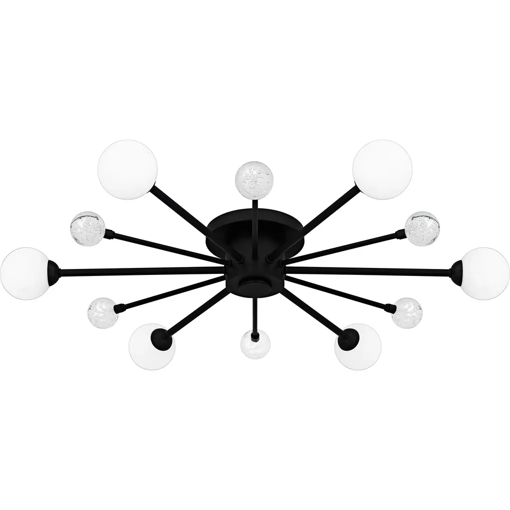 The Combe semi-flush mount light adds a modern touch to any room with its updated Sputnik design. Crystal balls accent the opal etched glass globes, creating a striking visual appeal and enhancing the overall elegance of the piece. Available in brushed gold or matte black finishes, Combe effortlessly blends contemporary style with a hint of sophistication. Perfect for living rooms, bedrooms, or entryways, Combe provides both functionality and a stylish statement.