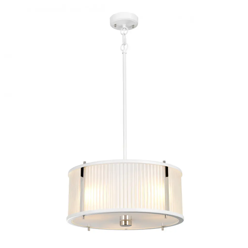 Corona is a versatile glass pendant range that works equally well as a pendant, semi flush or flush ceiling light. It's frosted side glass panels subtly diffuse the light, and a large opal white glass diffuser helps to create a clean well illuminated space. Finished in White Polished Nickel