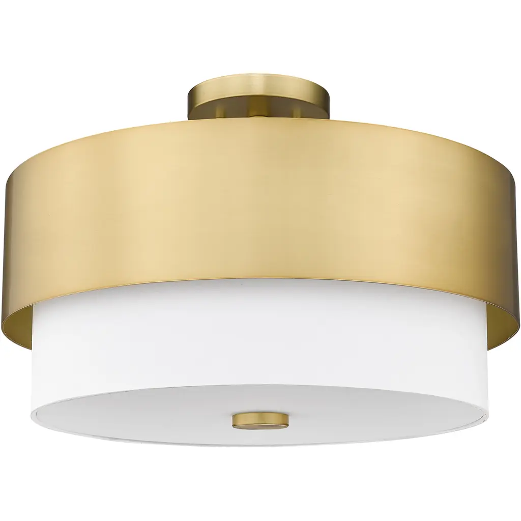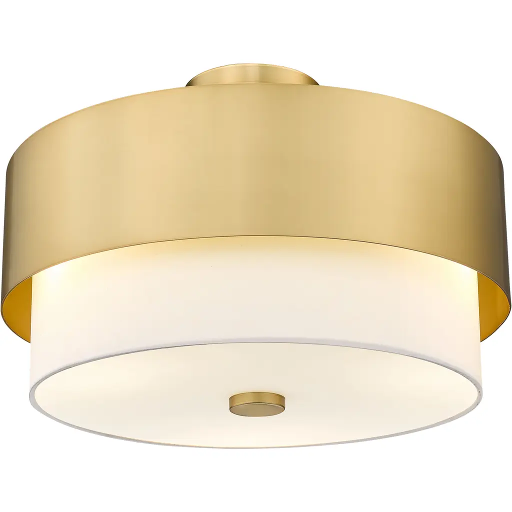 A stylish mix of Mid-Century Modern and industrial ambiance speaks to versatility and an easy, laid-back look with a light fixture that defines basic yet elegant simplicity. Embrace the modern gold finish metal framing and white fabric shade of this semi-flush mount ceiling light from the Counterpoint collection that brings a kick to a contemporary or transitional space. Ideal for dining rooms, living areas, and foyers, this circular semi-flush mount light invites an equally expressive design scheme.