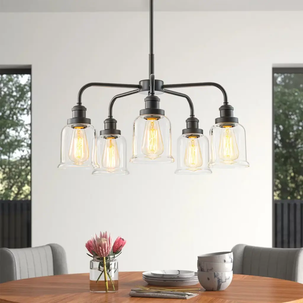 Clean lines, clear glass with a subtle nod to industrial make the Foxwood an ideal choice equally at home in a transitional or traditional setting. Clear Glass Shades (included) Requires 3 E27 base, 60 watt bulbs (not included). 1 Year Canopy Included: Yes Shade Included: Yes Canopy Diameter: 5.51 x 1.65 x 5.51