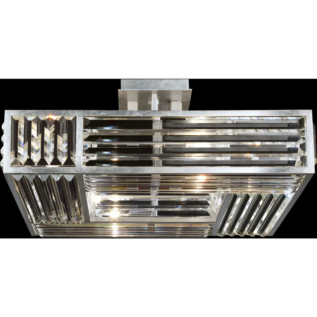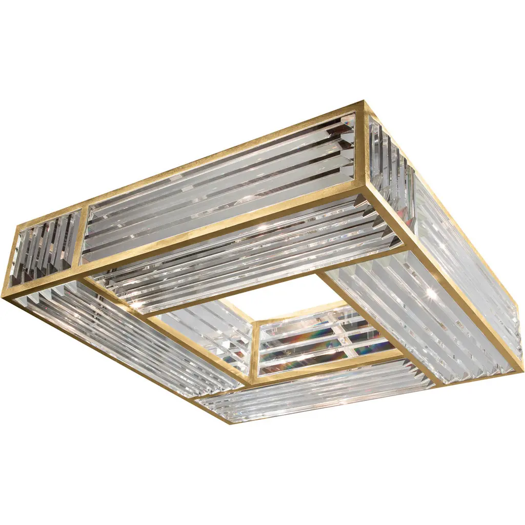 Semi Flush in a modern design of multi-faceted crystal panels, set in gold leaf metal frames that refract light and create an enchanting aura highlighting appointments and transforming a space with extraordinary effect. Also available in silver leaf.