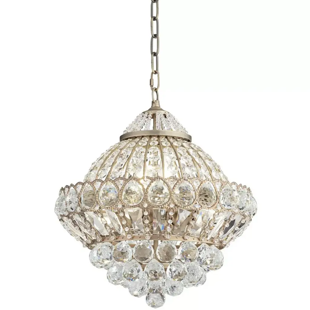 The Palla Ring chandelier is fitted with different sized round, hand-pinned, organic, and naturally textured Capiz shells, creating a unique texture and sparkle that play with the interplay of light and shadow. Faceted cut crystal jewels nestled within overlapping metal circles offer depth and dimension, elevating the chandelier into a work of art. Its open-ring design at the top directs light upward, creating a warm and inviting ambiance, and casts a gentle, downward glow. The same enchanting Capiz shells and crystal details that grace the fixture are mirrored on the canopy, ensuring that every aspect of the Palla Ring Chandelier exudes a sense of organic luxury and sophistication. Palla collection features a versatile farmhouse / rustic design. / A breezy, light-filled style that blends soft hues, natural materials, and nautical touches for a relaxed, seaside-inspired feel. / The intricate hand work associated with the Palla features metal rings fused together to create the overall