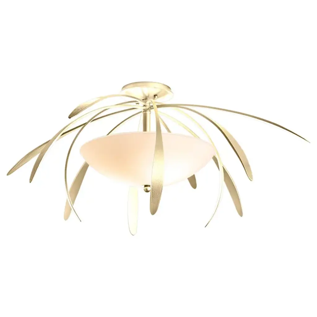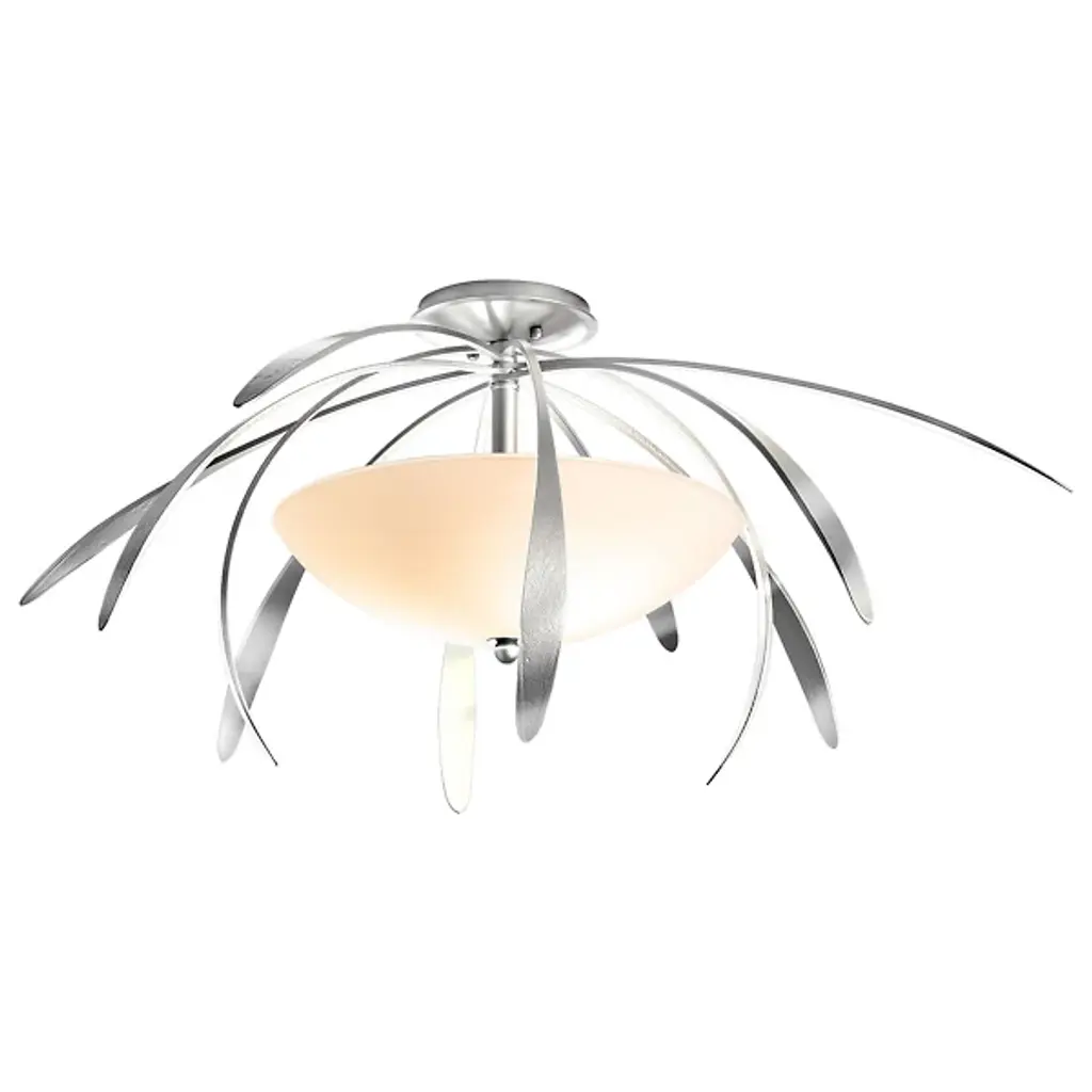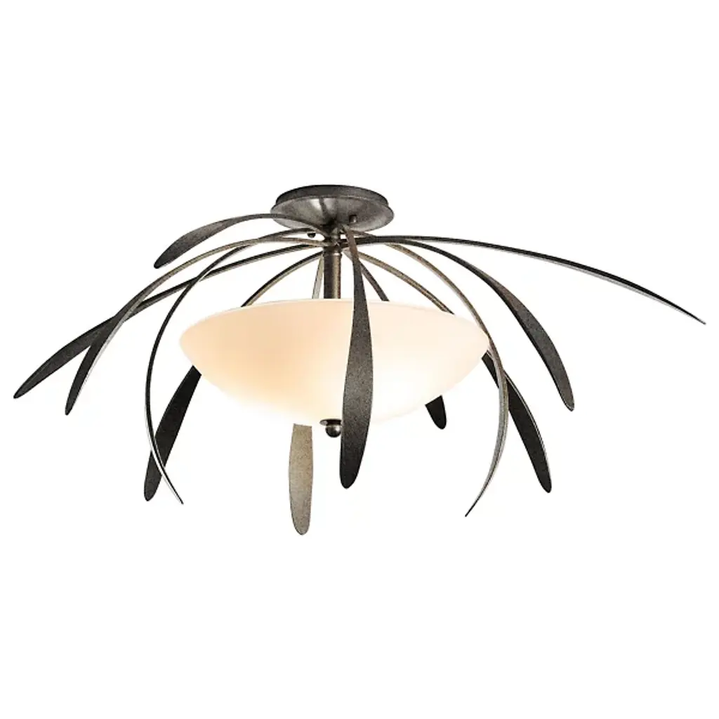 A graceful and elegant example of modern lighting design, the Dahlia Semi-Flushmount from Hubbardton Forge brings a natural touch of style to the surrounding décor. Mounting directly to the ceiling, this piece extends a brief downrod that leads to a dome-shaped, clear glass shade. Several slender arms grow from the base of the downrod, bending and resting at angles like long leaves on a branch. A pair of bulbs rest within the shade, expressing a bright and clean layer of light.
