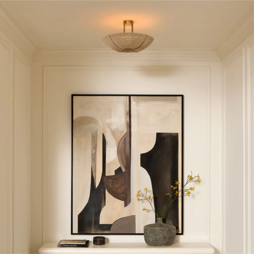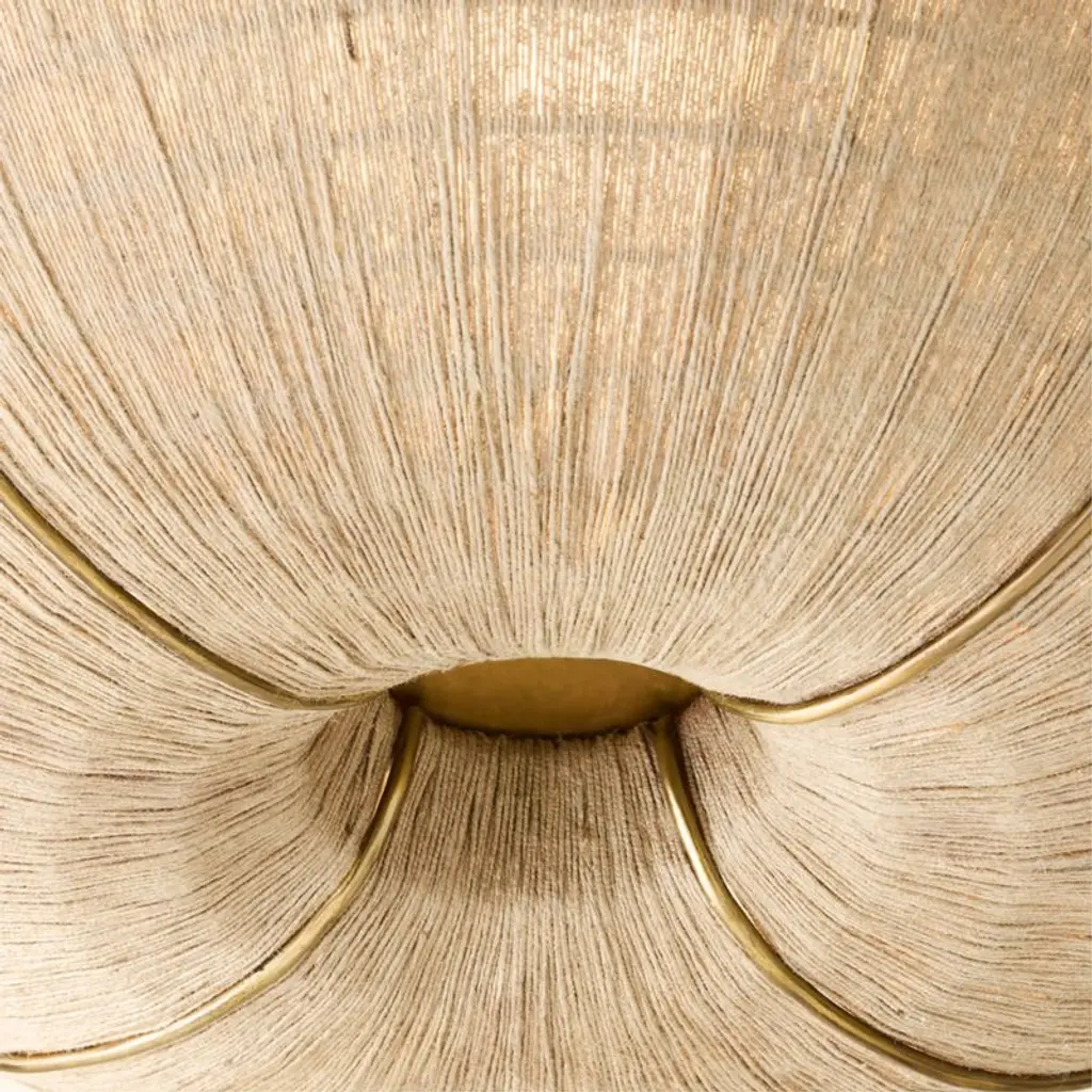 Natural jute flush mount by award-winning French design duo dach&zephir is inspired by vintage designs from France and Guadeloupe. The warm brass frame is aged by hand in a multistep process to bring out the metal's rich tonal highs and lows. Paired with a hand-wrapped natural jute shade that softly filters the light. CB2 exclusive.