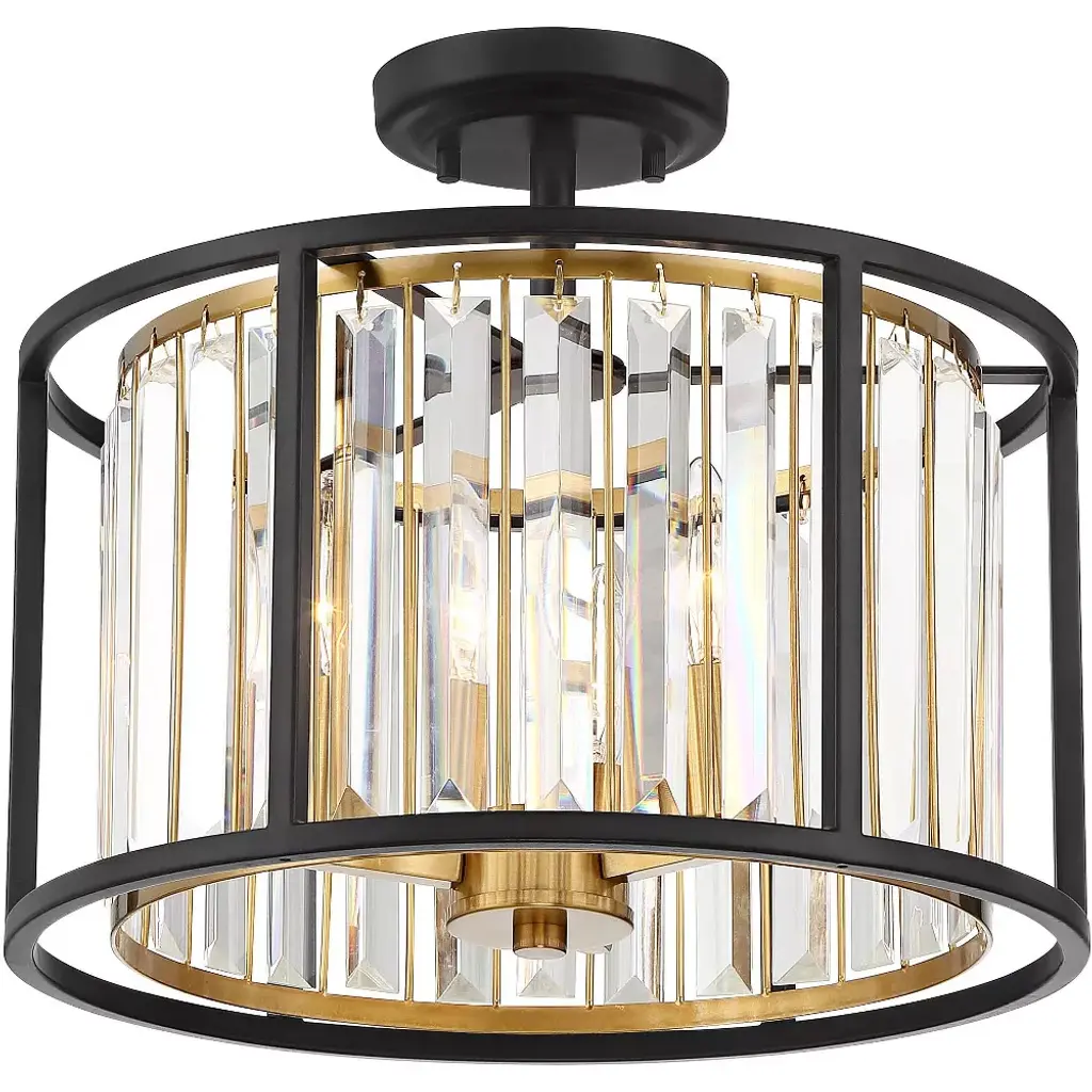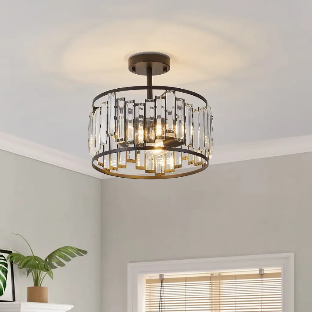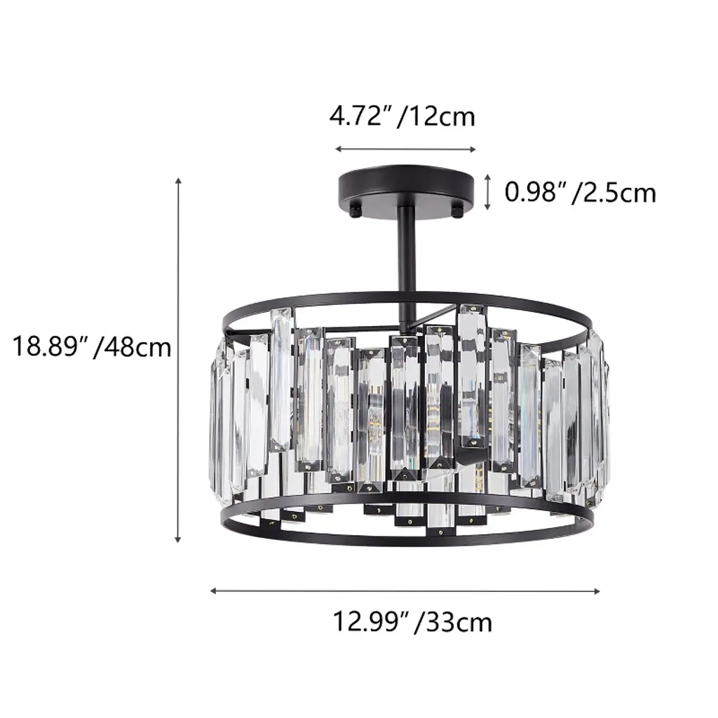 Dewdrop 3-light Semi Flush Mount Crystal Chandelier, Black And Clear Drum Ceiling Light Fixture For Living Room Foyer Entryway