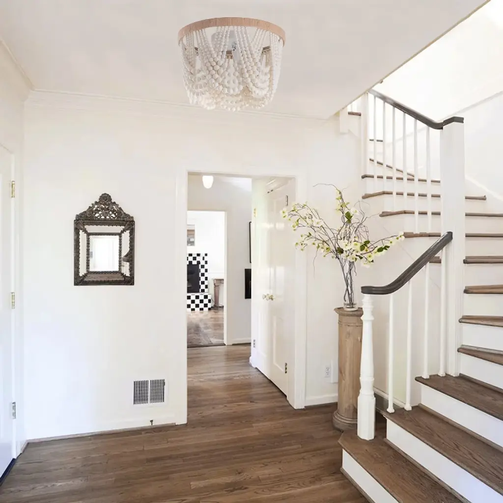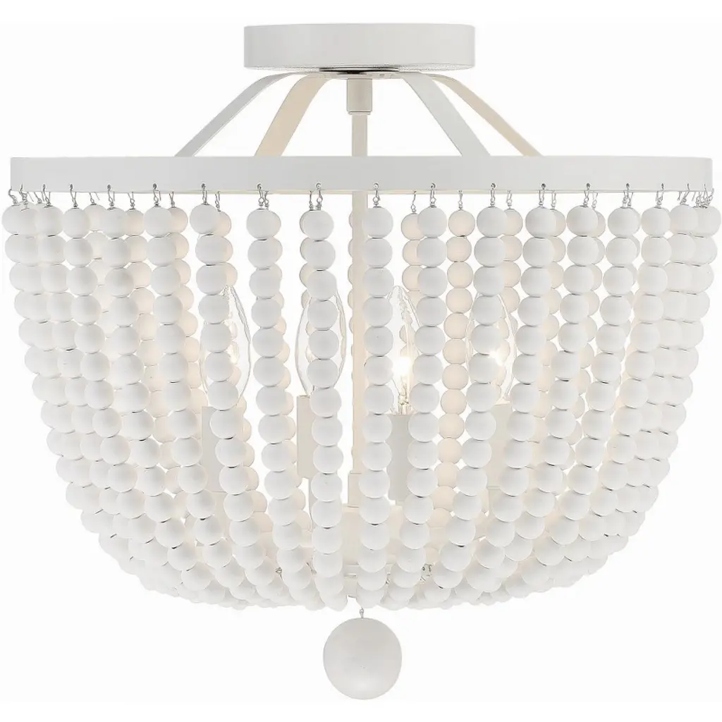 Dewdrop Boho Semi Flush Mount Ceiling Light, White Wood Bead Chandelier With Natural Wood Frame For Bedroom Hallway Entryway