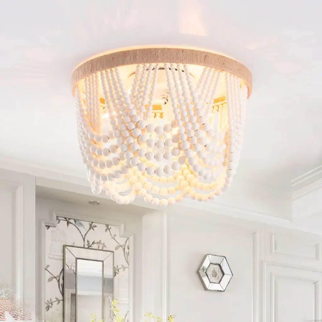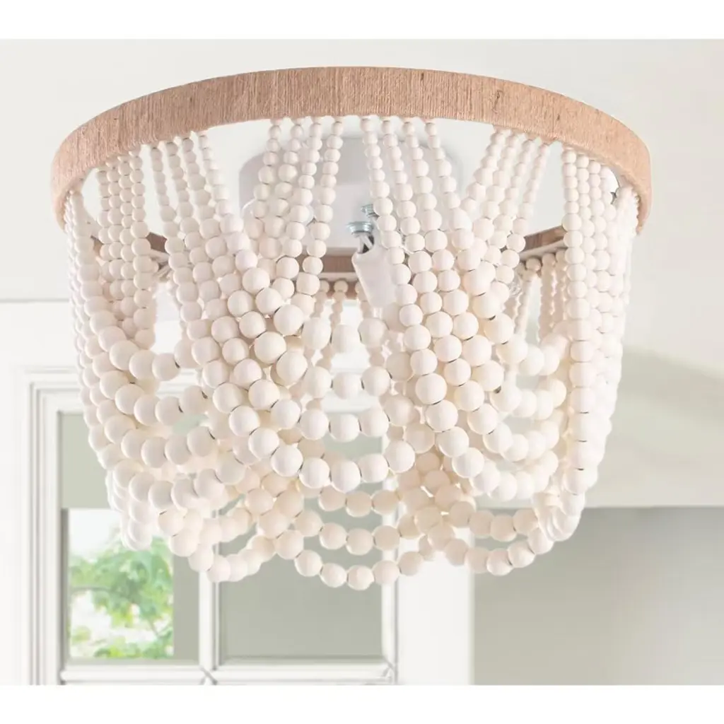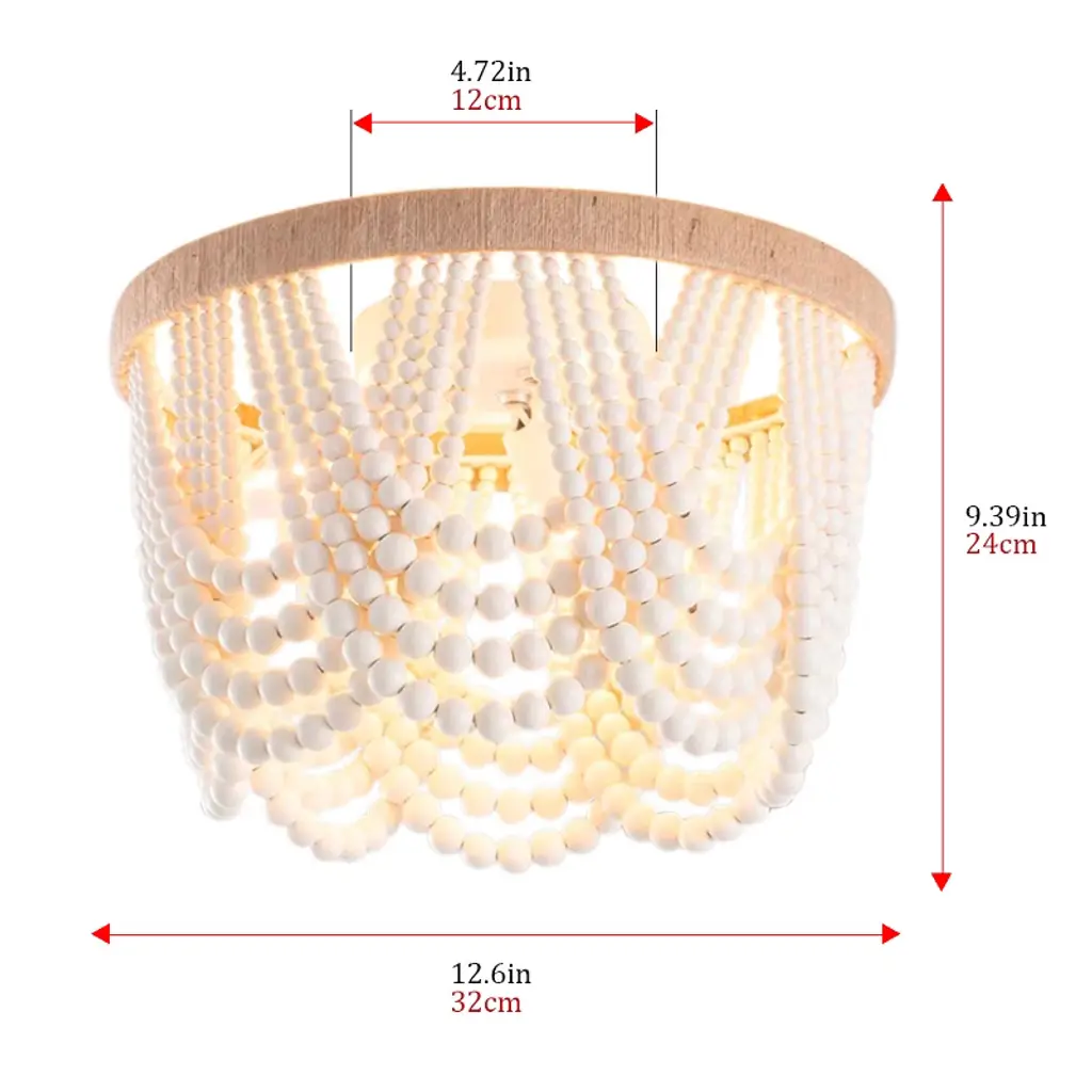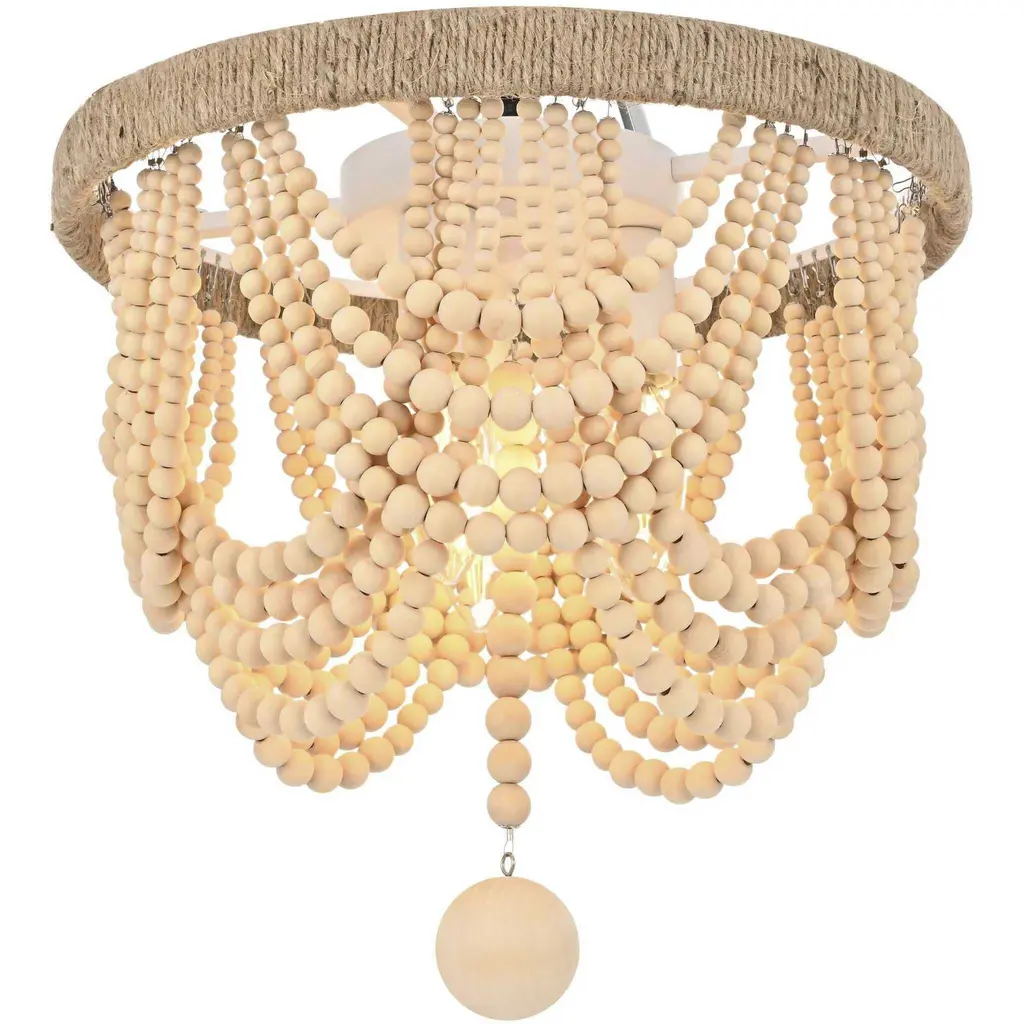 The Dewdrop boho wood bead semi flush mount ceiling light combines a matte white iron frame with cascading natural wood beads and hemp rope accents for a rustic farmhouse look. Featuring 3 ¡Á E12 sockets (LED 7W recommended, max 40W, bulbs not included), this ETL-certified ceiling light is safe, durable, and easy to install. Backed by a 2-year warranty, it's an ideal choice for bedrooms, dining rooms, hallways, and entryways.