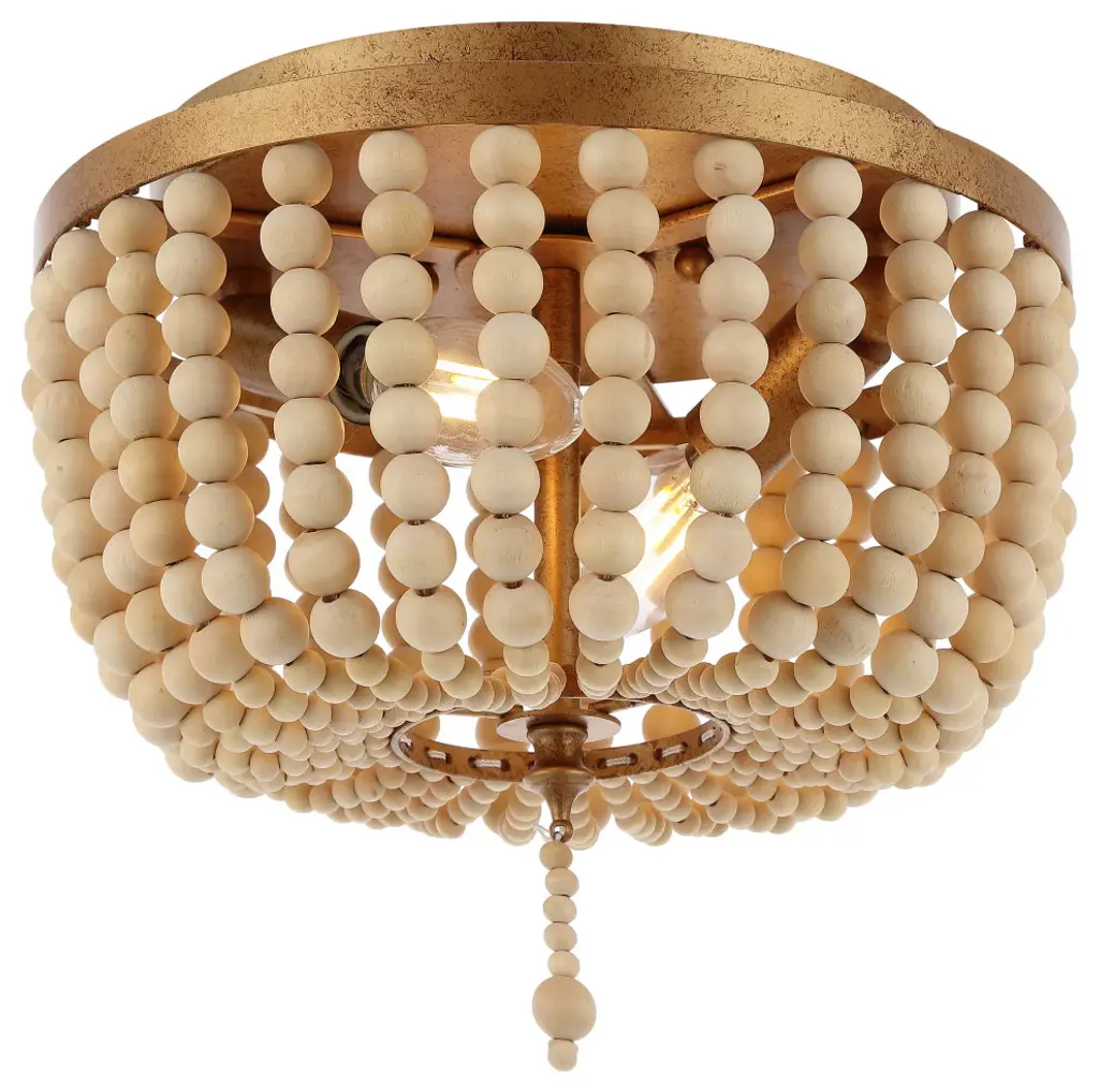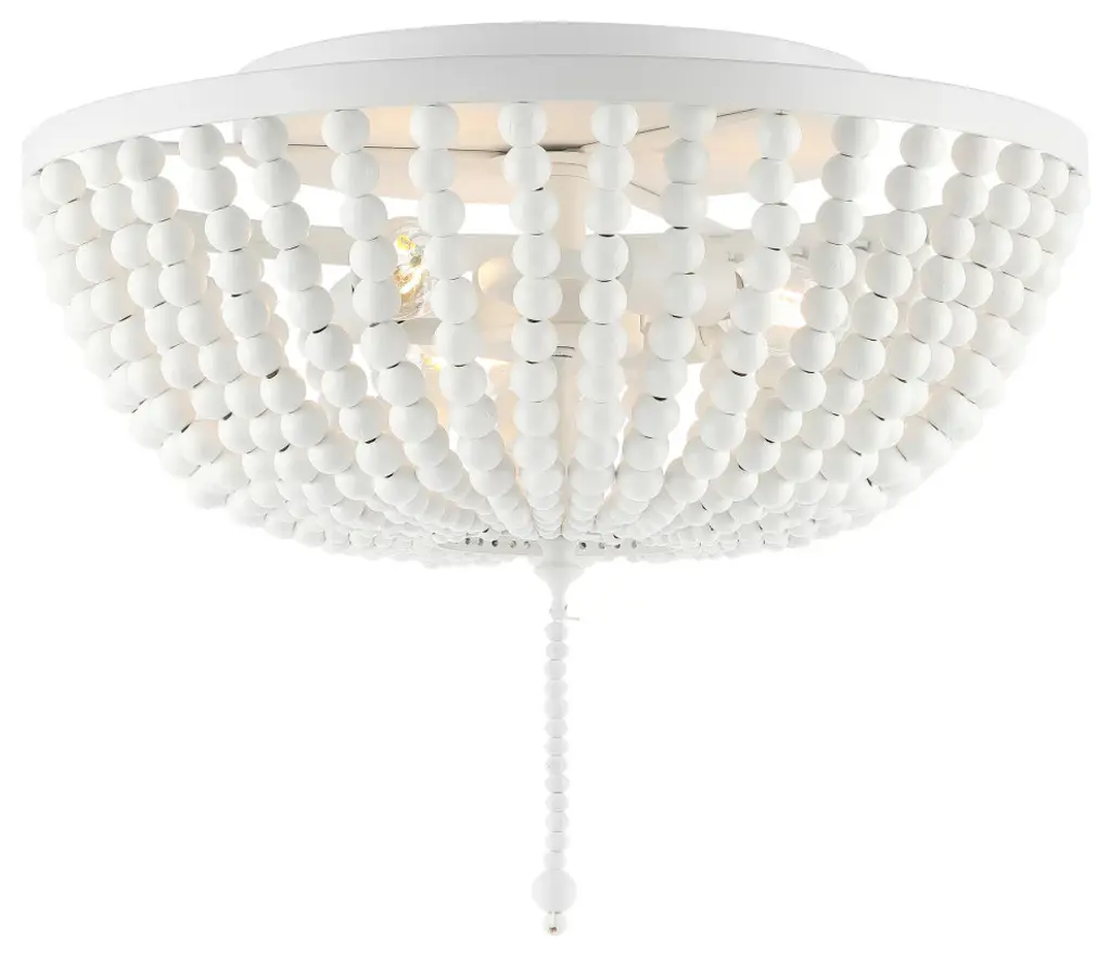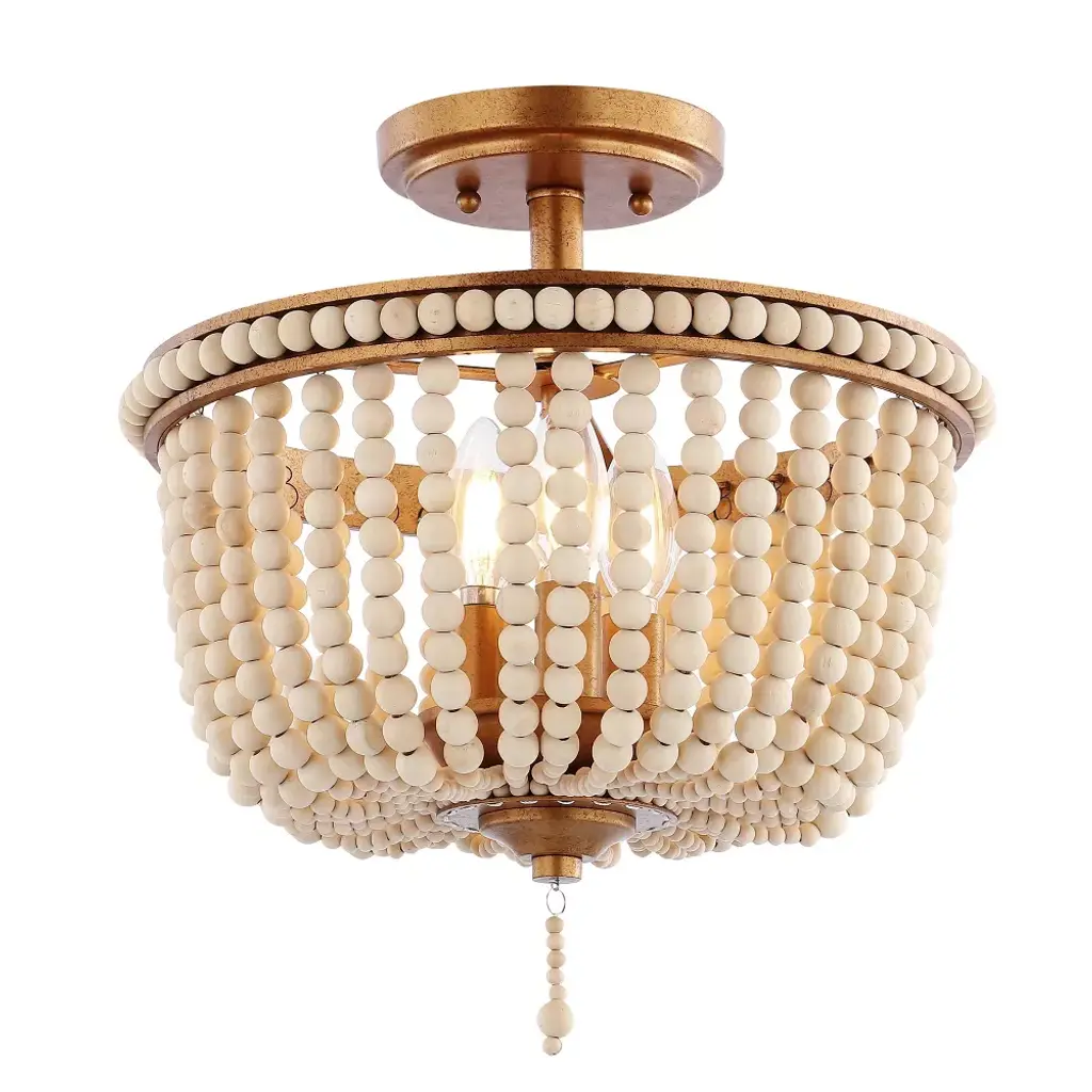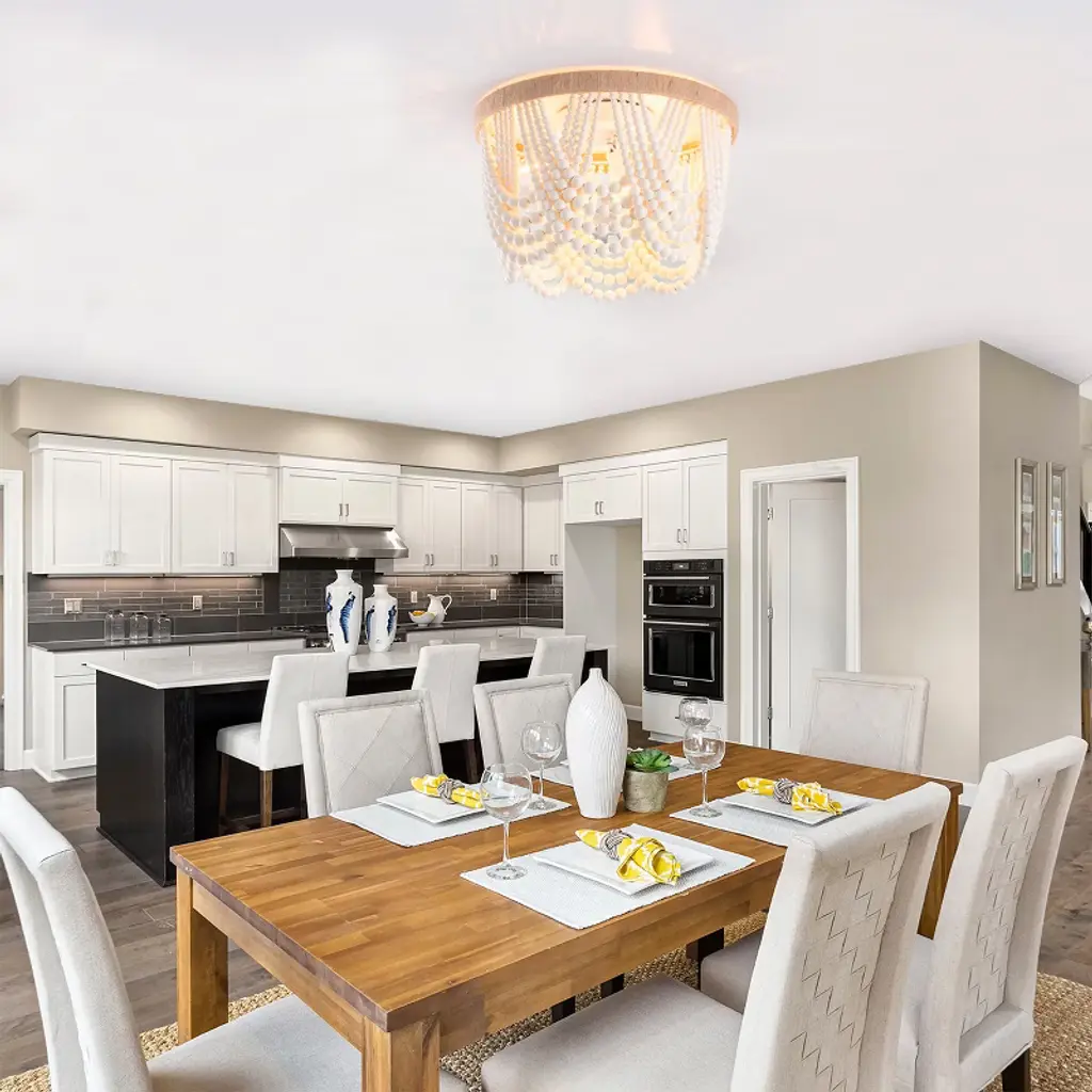 The Dewdrop boho wood bead semi flush mount ceiling light combines a matte white iron frame with cascading natural wood beads and hemp rope accents for a rustic farmhouse look. Featuring 3 ¡Á E12 sockets (LED 7W recommended, max 40W, bulbs not included), this ETL-certified ceiling light is safe, durable, and easy to install. Backed by a 2-year warranty, it's an ideal choice for bedrooms, dining rooms, hallways, and entryways.