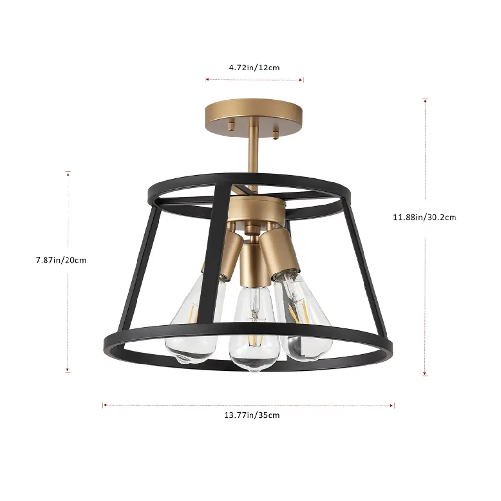 The Dewdrop 3-Light Semi Flush Mount Ceiling Light blends farmhouse charm with modern elegance. Made of sturdy iron with a matte black and deep gold finish, it adds style and durability. Designed with three E26 sockets (60W max, 120V), it works with LED, CFL, or incandescent bulbs for flexible lighting. This fixture is ETL certified and equipped with safe 18AWG wiring for reliable performance. Ideal for living rooms, bedrooms, kitchens, dining rooms, and hallways, it brings rustic industrial elegance to any home.