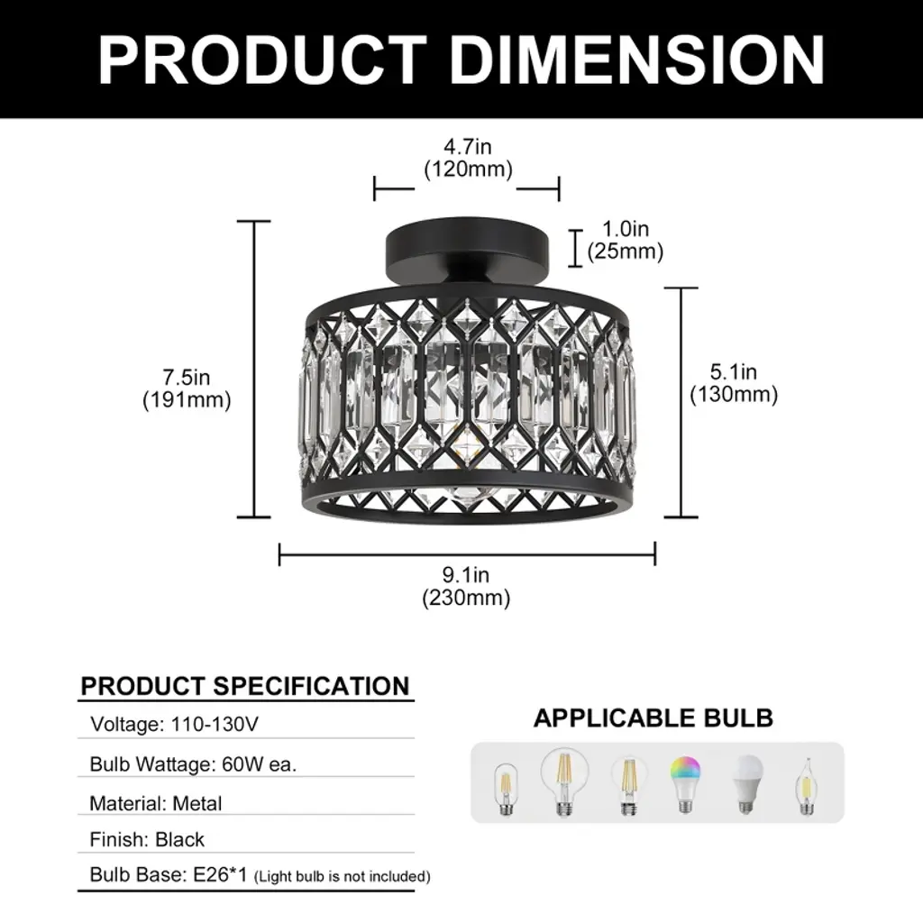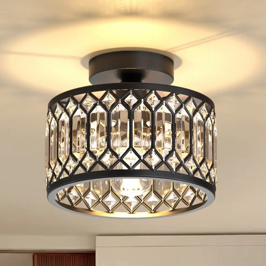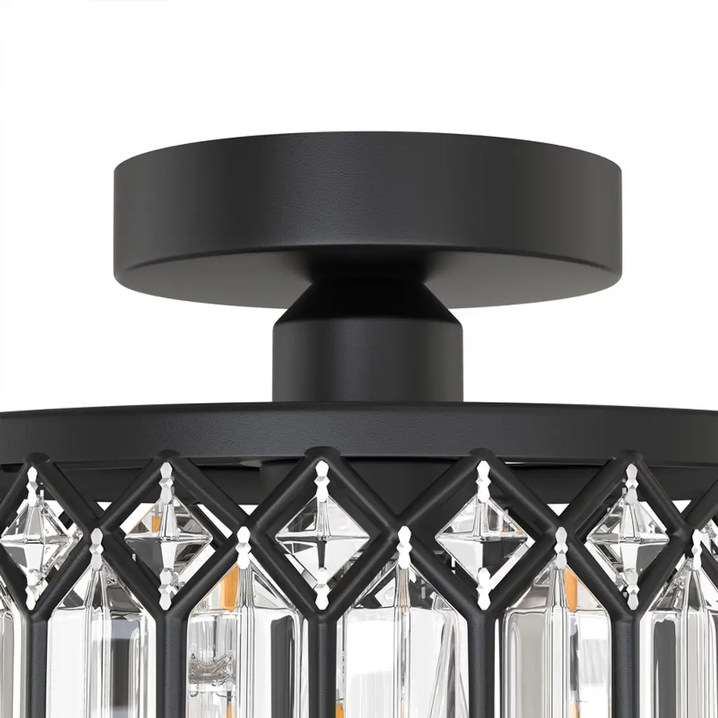 Elevate your interior with this elegant 1-light semi-flush mount ceiling fixture featuring matte black finish and striking triangular crystal accents. The drum-shaped shade adds a soft, diffused glow while highlighting the sophisticated design. Equipped with an E26 socket and non-integrated bulb setup (bulb not included), it allows easy bulb customization and replacement. Perfect for bedrooms, hallways, or living spaces seeking a blend of modern style and classic elegance.
