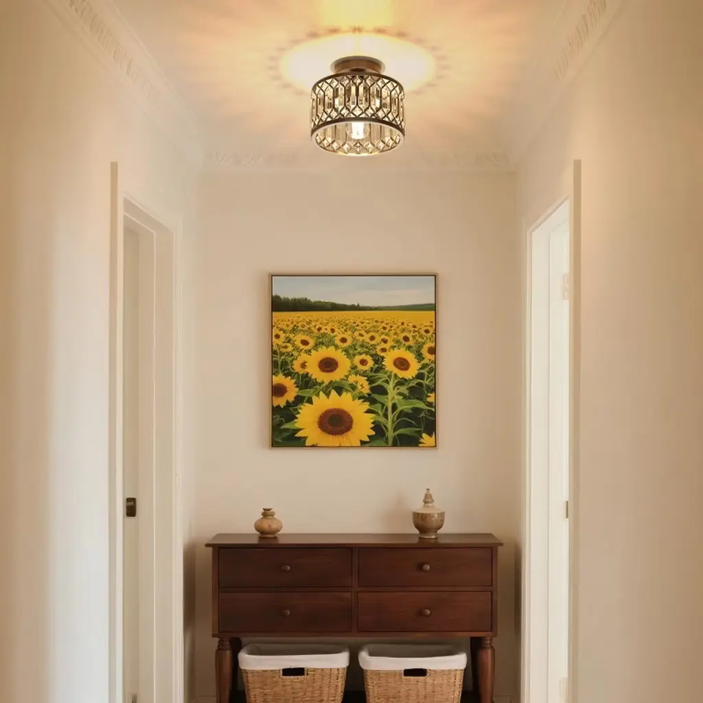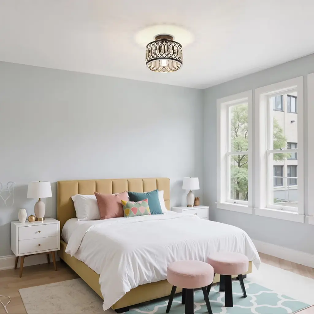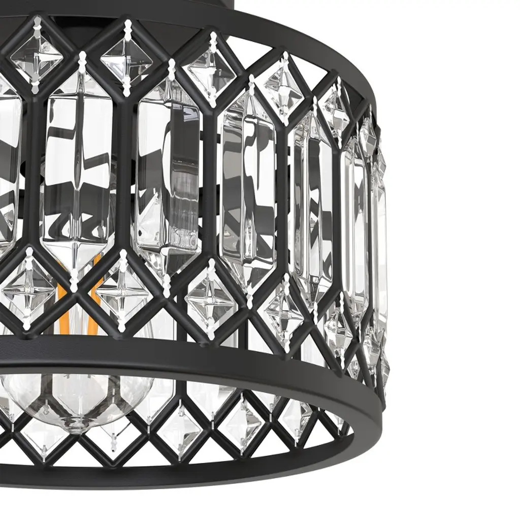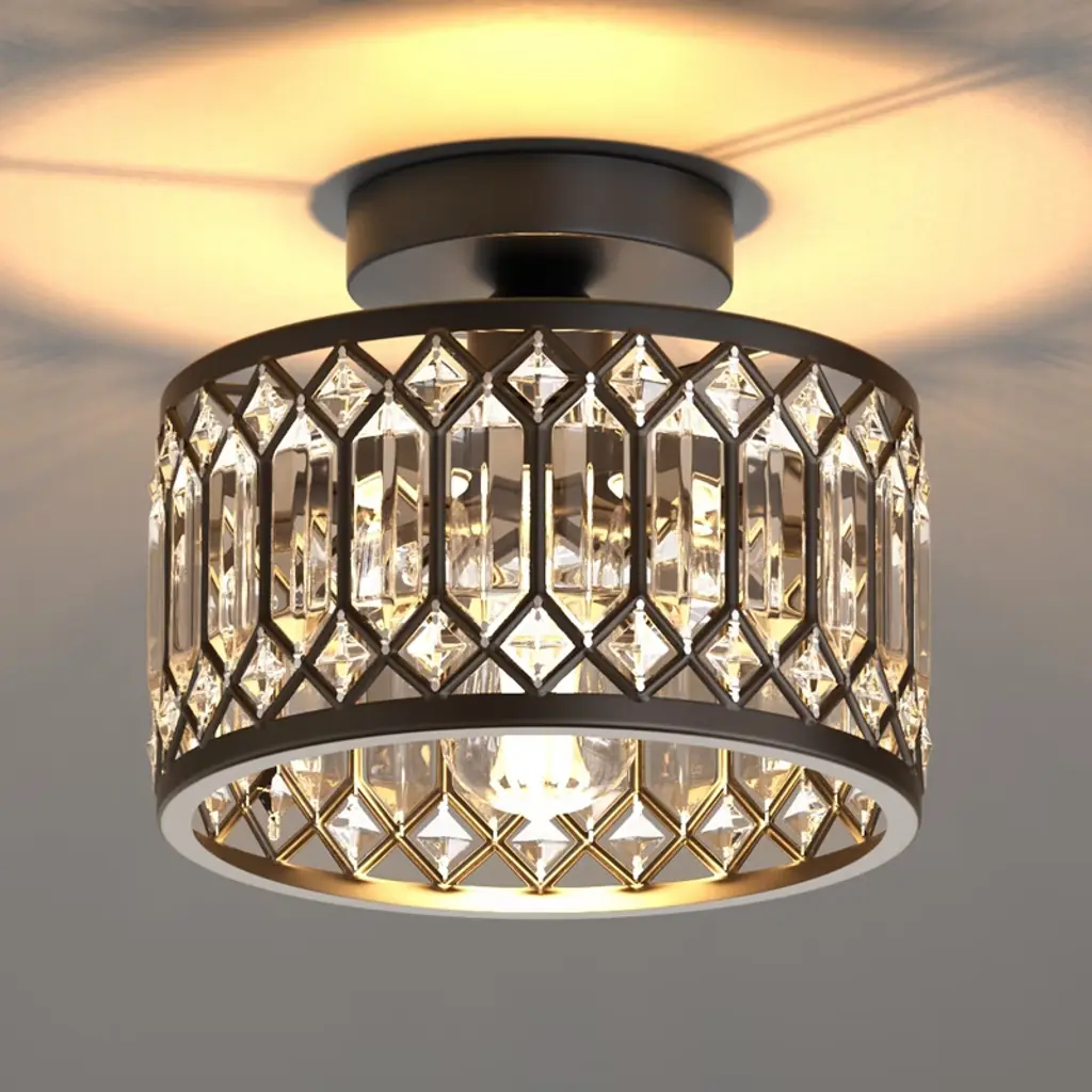 Elevate your interior with this elegant 1-light semi-flush mount ceiling fixture featuring matte black finish and striking triangular crystal accents. The drum-shaped shade adds a soft, diffused glow while highlighting the sophisticated design. Equipped with an E26 socket and non-integrated bulb setup (bulb not included), it allows easy bulb customization and replacement. Perfect for bedrooms, hallways, or living spaces seeking a blend of modern style and classic elegance.