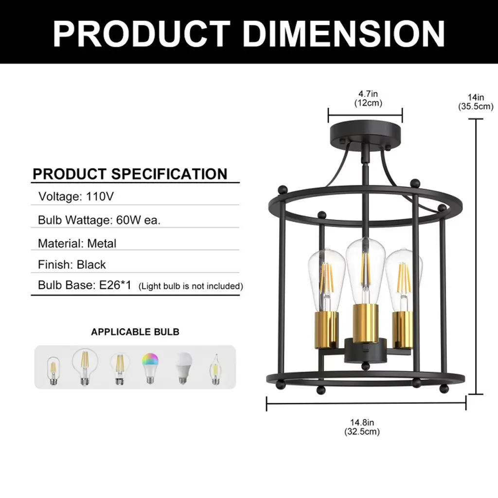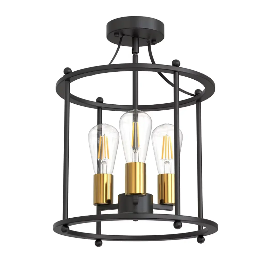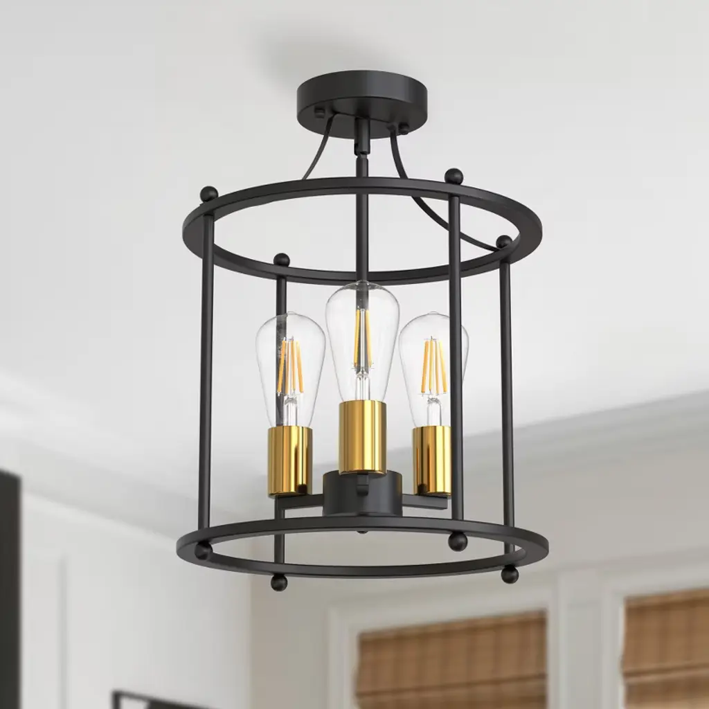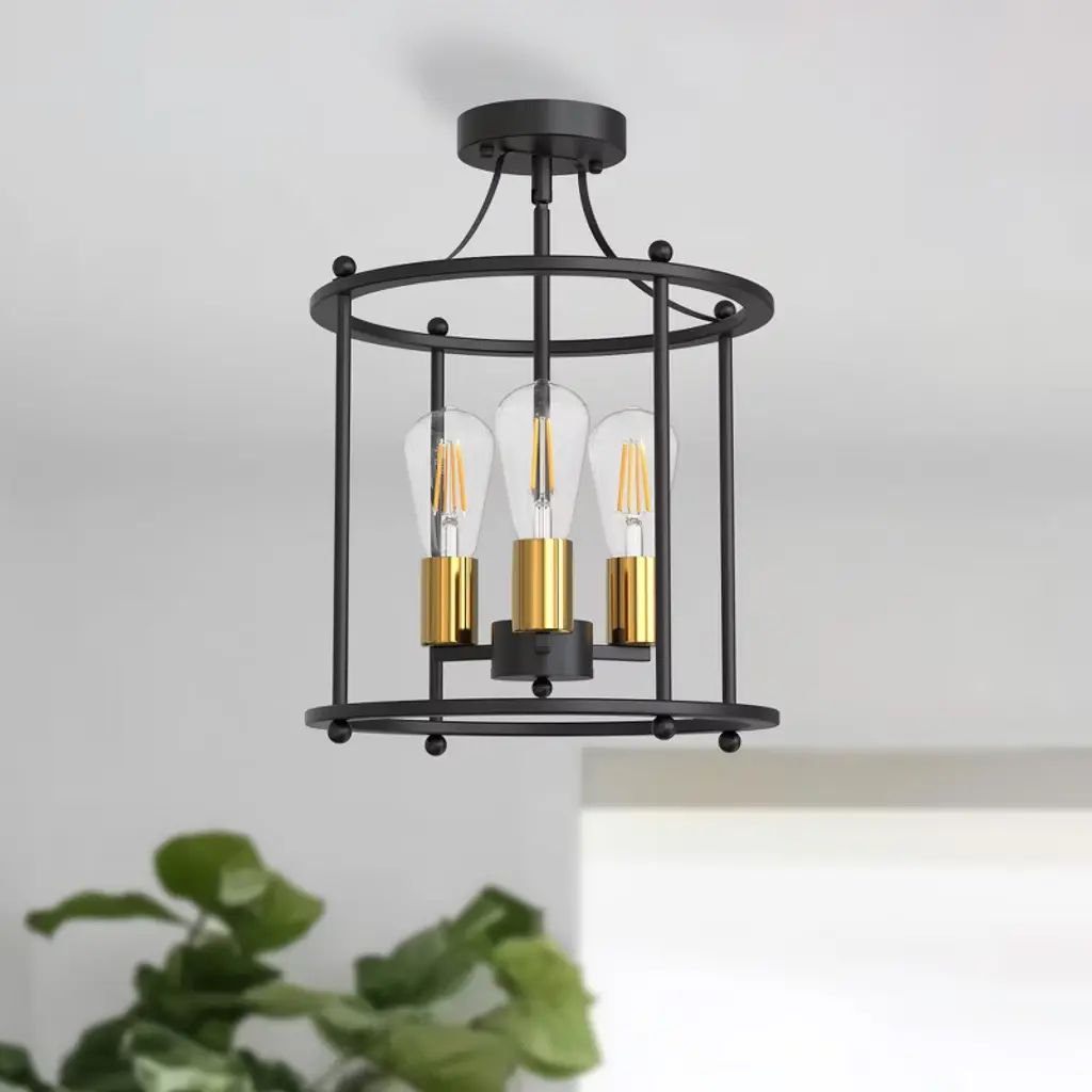 Enhance your living space with this stylish three-head semi-flush mount ceiling light. Featuring a sleek black body paired with elegant gold sockets, this fixture offers a modern yet sophisticated look. Equipped with E26 sockets, it allows you to select your preferred bulbs (not included) to create the perfect lighting ambiance. Ideal for kitchens, dining rooms, or living areas that need both functional and decorative lighting.