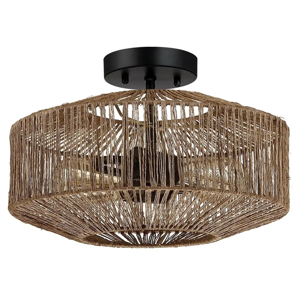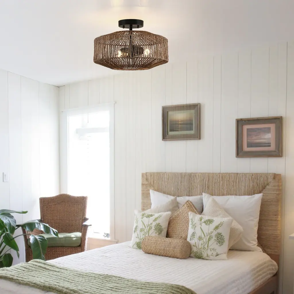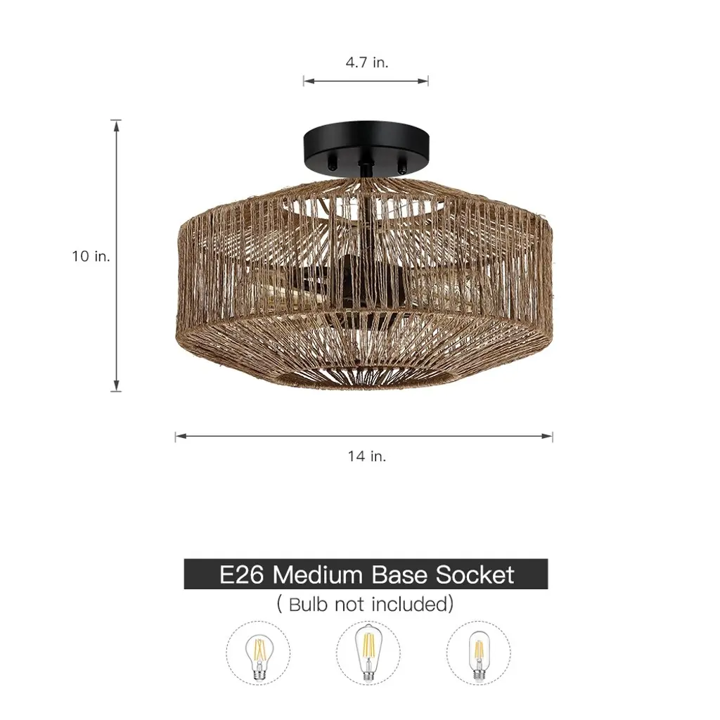 Coastal-inspired semi flush mount ceiling light fixture is crafted of natural rattan/hemp rope cage shade and matte black canopy, it's an unique blend of eclectic nautical and bohemian style. Filtering the light from within, each piece creates a play of light and shadow in a room, adding an inviting ambience. This collection can work with a variety of boho decors and even work in homes with coastal or farmhouse styling, which is an ideal selection for hallway, entryway, stairway, door way, or a foyer to bring warmth to a living room or bedroom