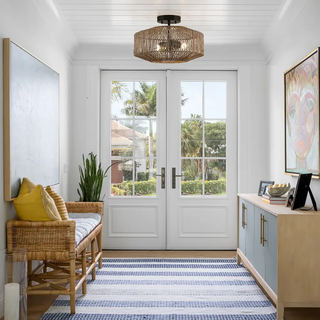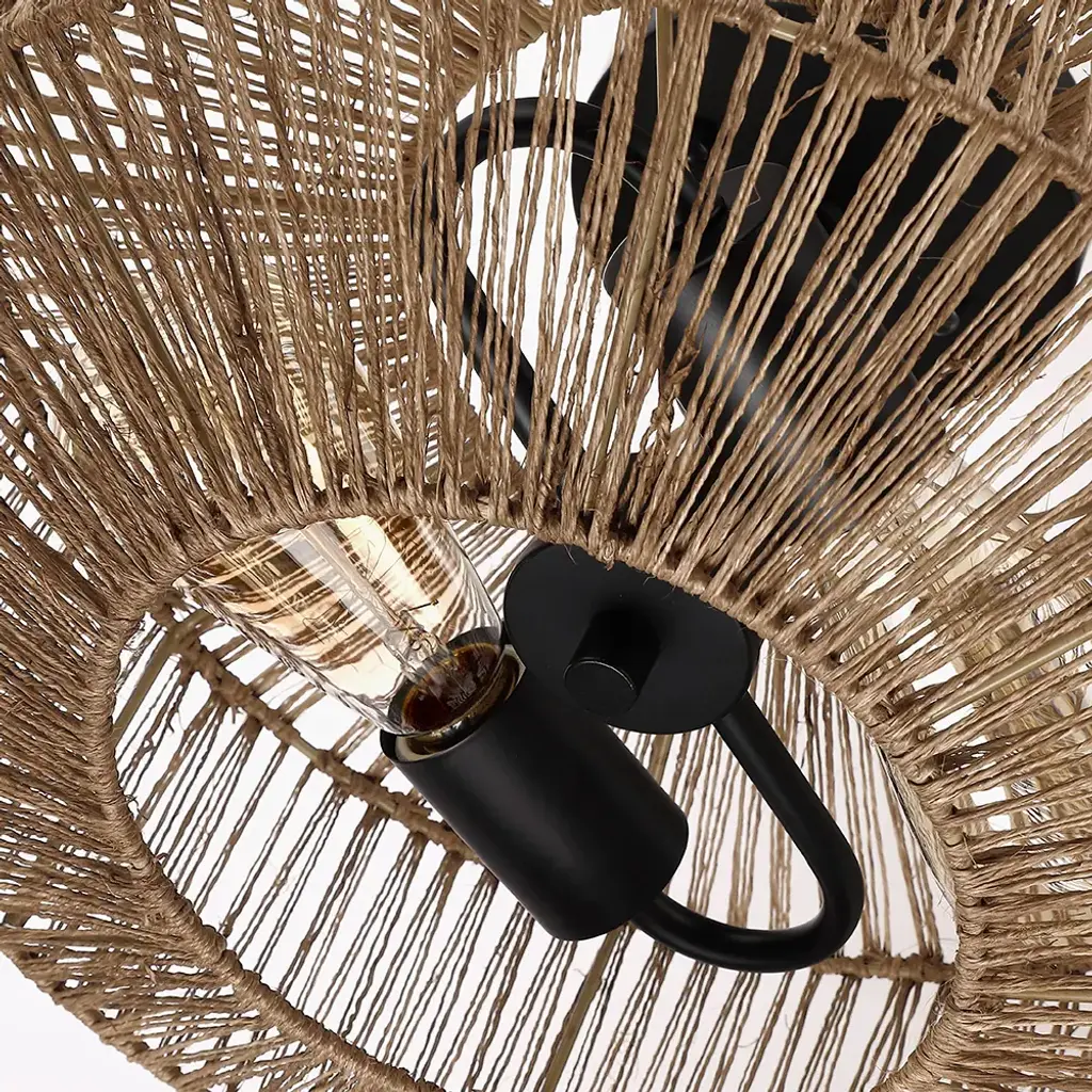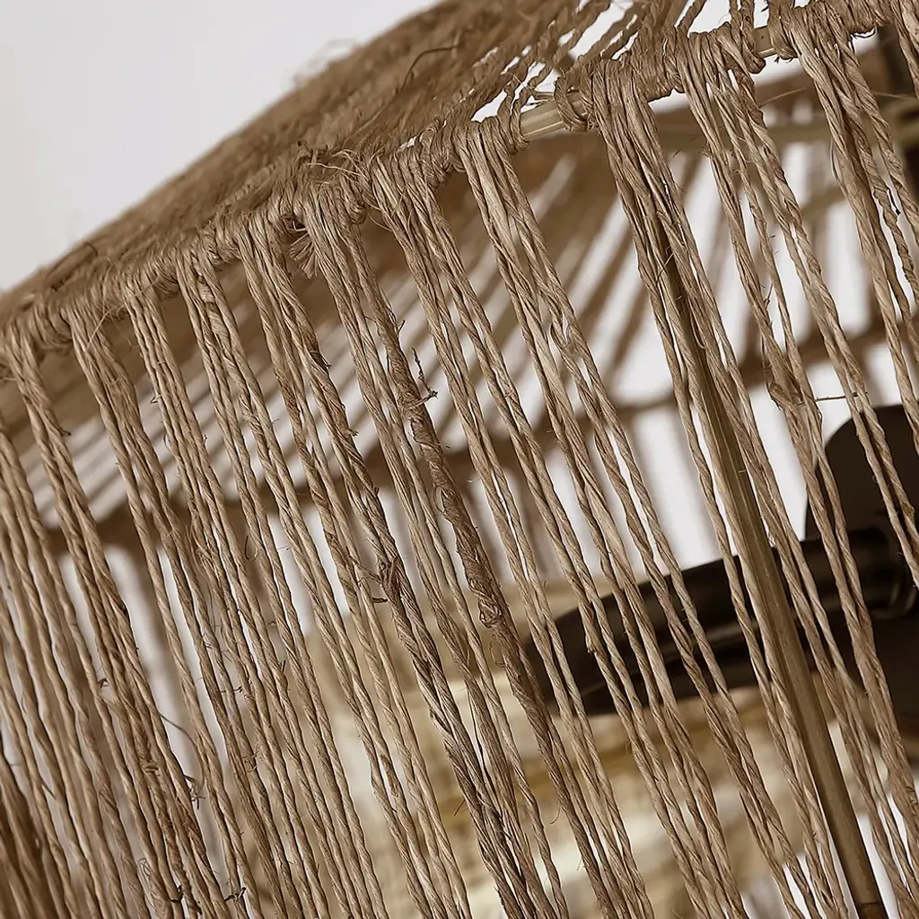 Coastal-inspired semi flush mount ceiling light fixture is crafted of natural rattan/hemp rope cage shade and matte black canopy, it's an unique blend of eclectic nautical and bohemian style. Filtering the light from within, each piece creates a play of light and shadow in a room, adding an inviting ambience. This collection can work with a variety of boho decors and even work in homes with coastal or farmhouse styling, which is an ideal selection for hallway, entryway, stairway, door way, or a foyer to bring warmth to a living room or bedroom