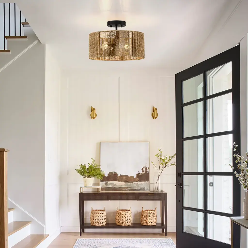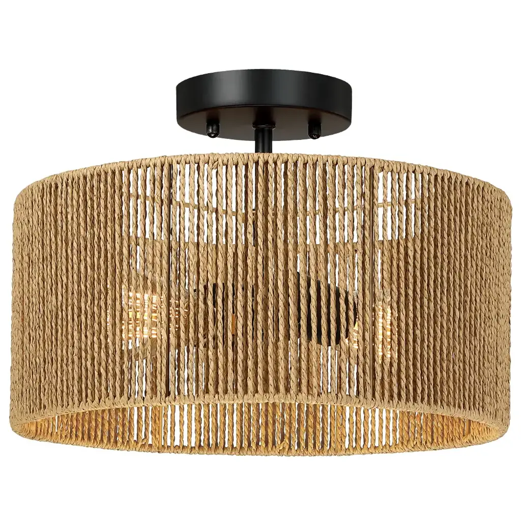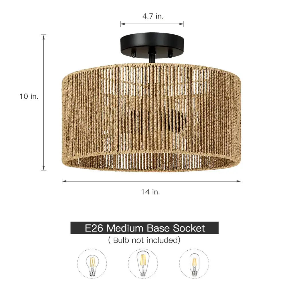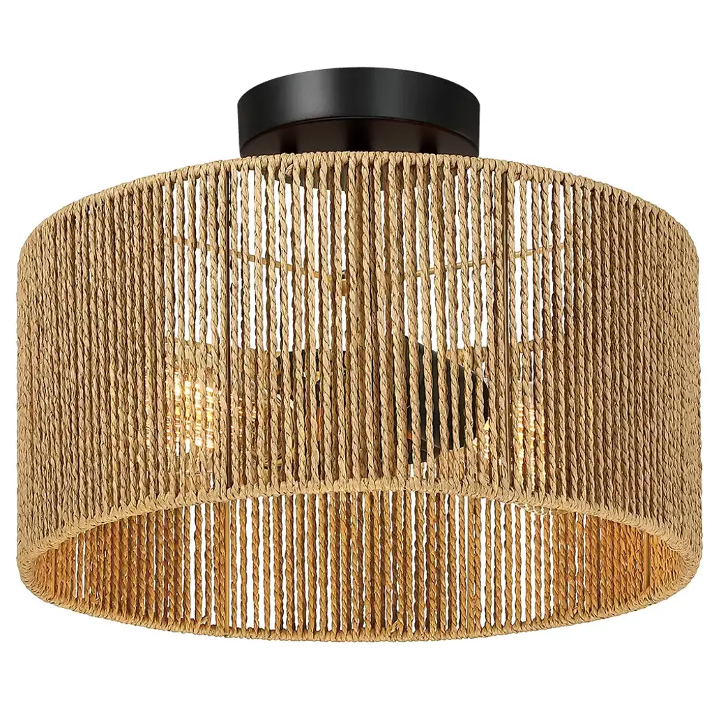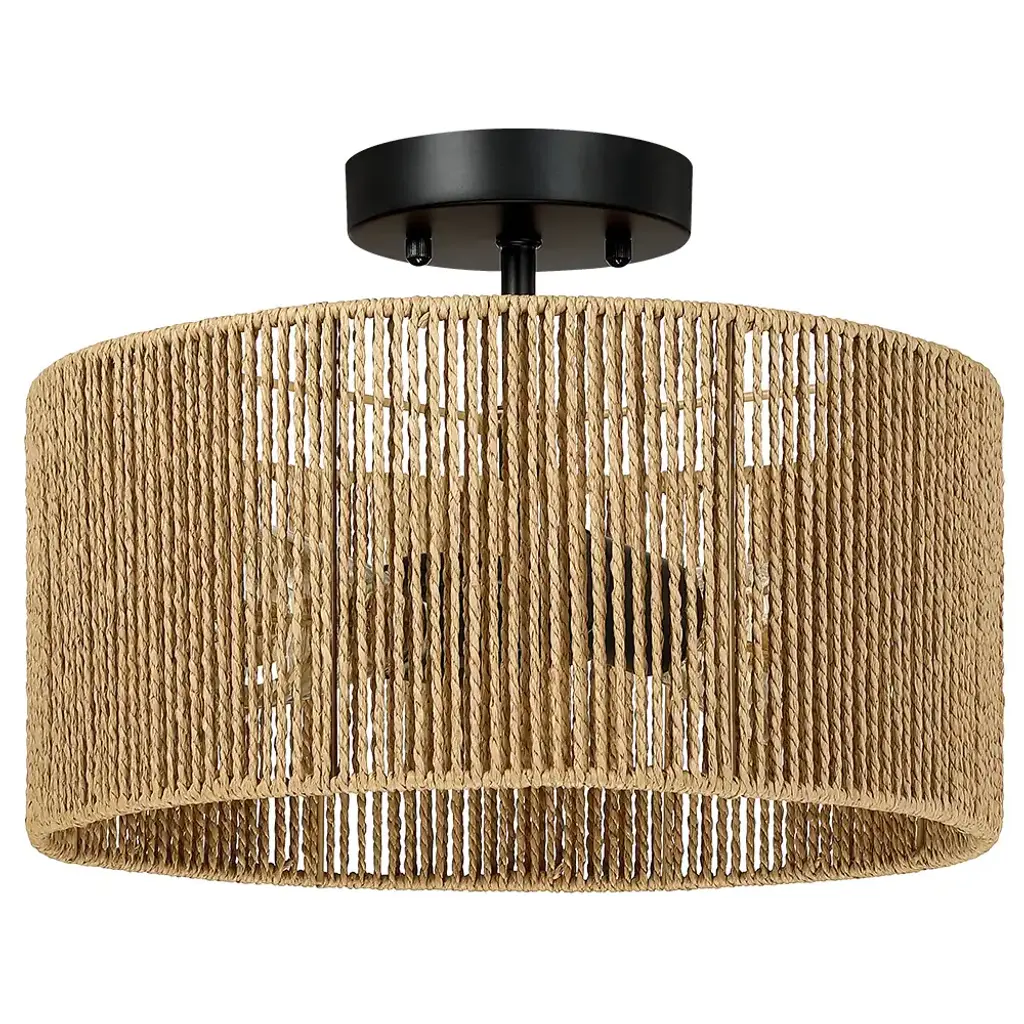 Drum semi flush mount ceiling light fixture with black hardware, is the unique blend of eclectic nautical and rustic vintage style. Cage shade is crafted of natural rattan/paper rope, making an addition to your space with natural ambience.Filtering the light from within, each piece creates a play of light and shadow in a room, adding an inviting ambience. This collection can work with a variety of boho decors and even work in homes with coastal or farmhouse styling, which is an ideal selection for hallway, entryway, stairway, door way, or a foyer as a ceiling light.