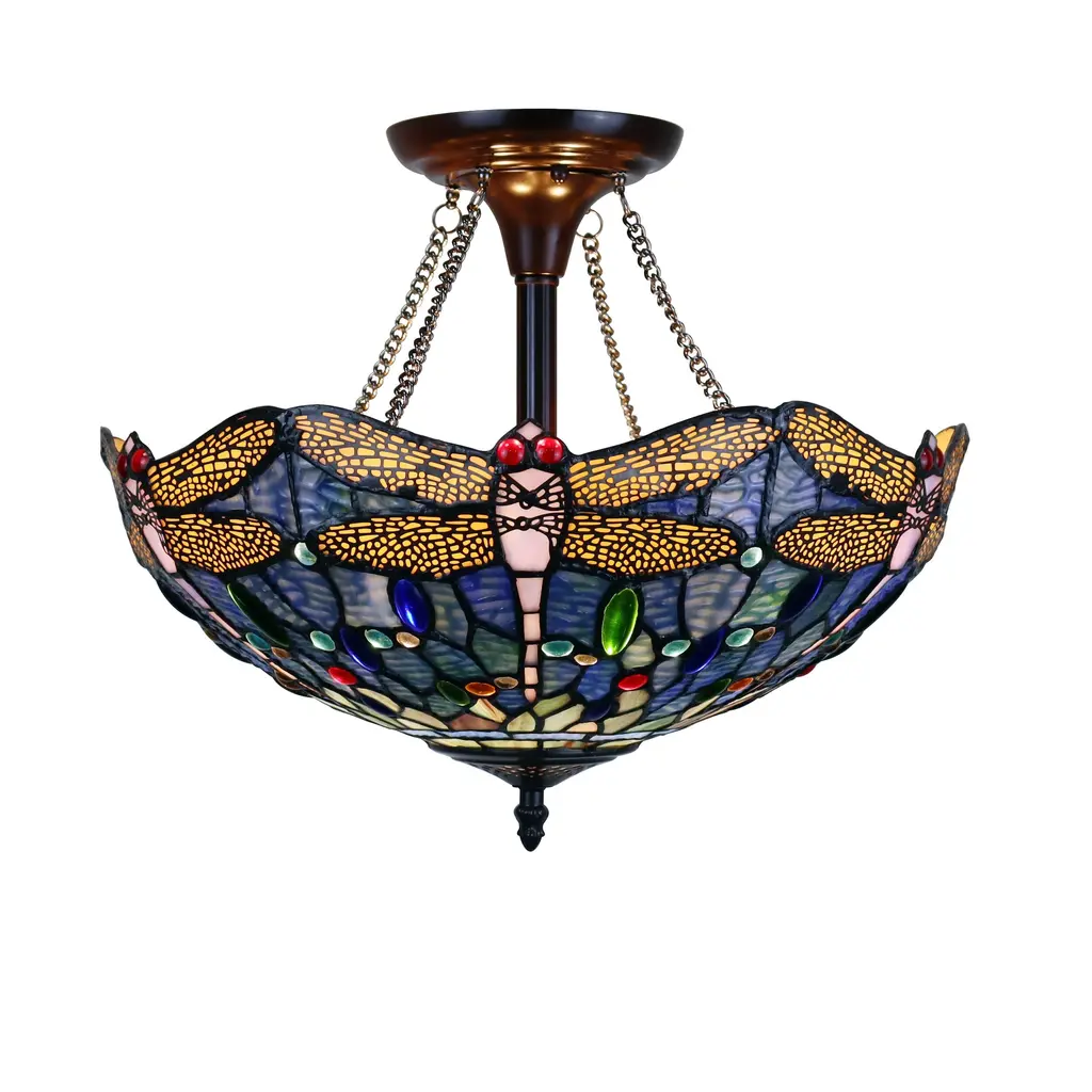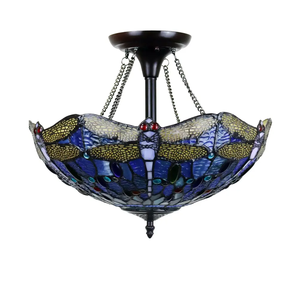 This Tiffany-style, Dragonfly design 2-light semi-flush mount fixture features a dark bronze finish that will complement many decors throughout your home. Crafted from 258 pieces of hand cut art glass and 96 glass beads, this piece will add color and beauty to any space. Features: Shade: Tones of Blue and Yellow art glass. Requires: Two (2) 60 Watt max E26 medium base Type A Bulbs (Not Included). Fixture Dimensions: 13.5 inches high x 16.1 inch diameter. Since these are hand crafted products, the exact color of glass pieces may vary. Colors of the glass will appear darker and less vibrant when not illuminated. Handmade glass will vary from one piece to the other; glass made at different times will also vary. Light bulbs used in lamps or ambient lighting may affect the appearance of the products. Stained glass product has been protected with mineral oil as part of the finishing process. Please use a soft dry cloth to remove any excess oil.