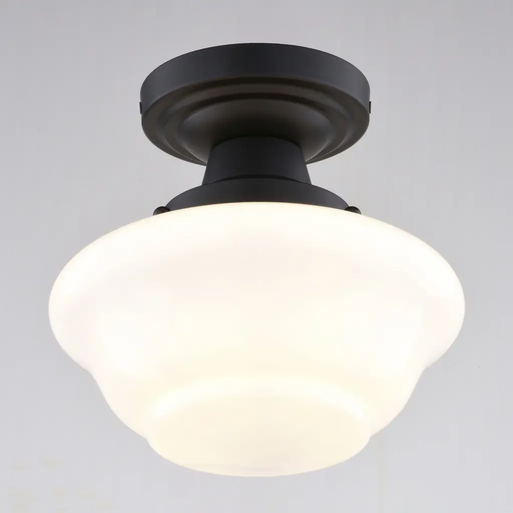 Add a touch of vintage charm to your home with the Eastgate semi-flush light's classic schoolhouse design. Its timeless shape and versatile matte black finish make it a perfect addition to bedrooms, bathrooms, hallways, or entryways. Enjoy the warm and inviting illumination as the Eastgate light enhances your space with its nostalgic glow.