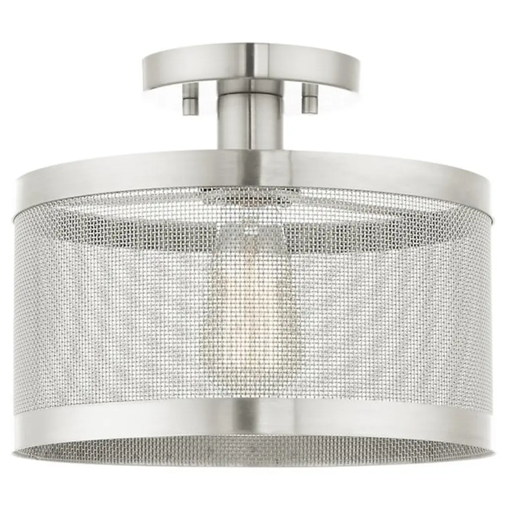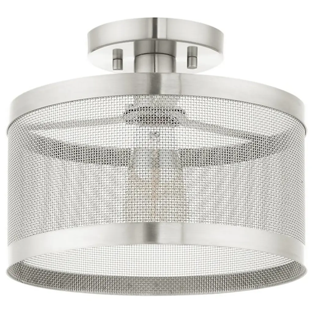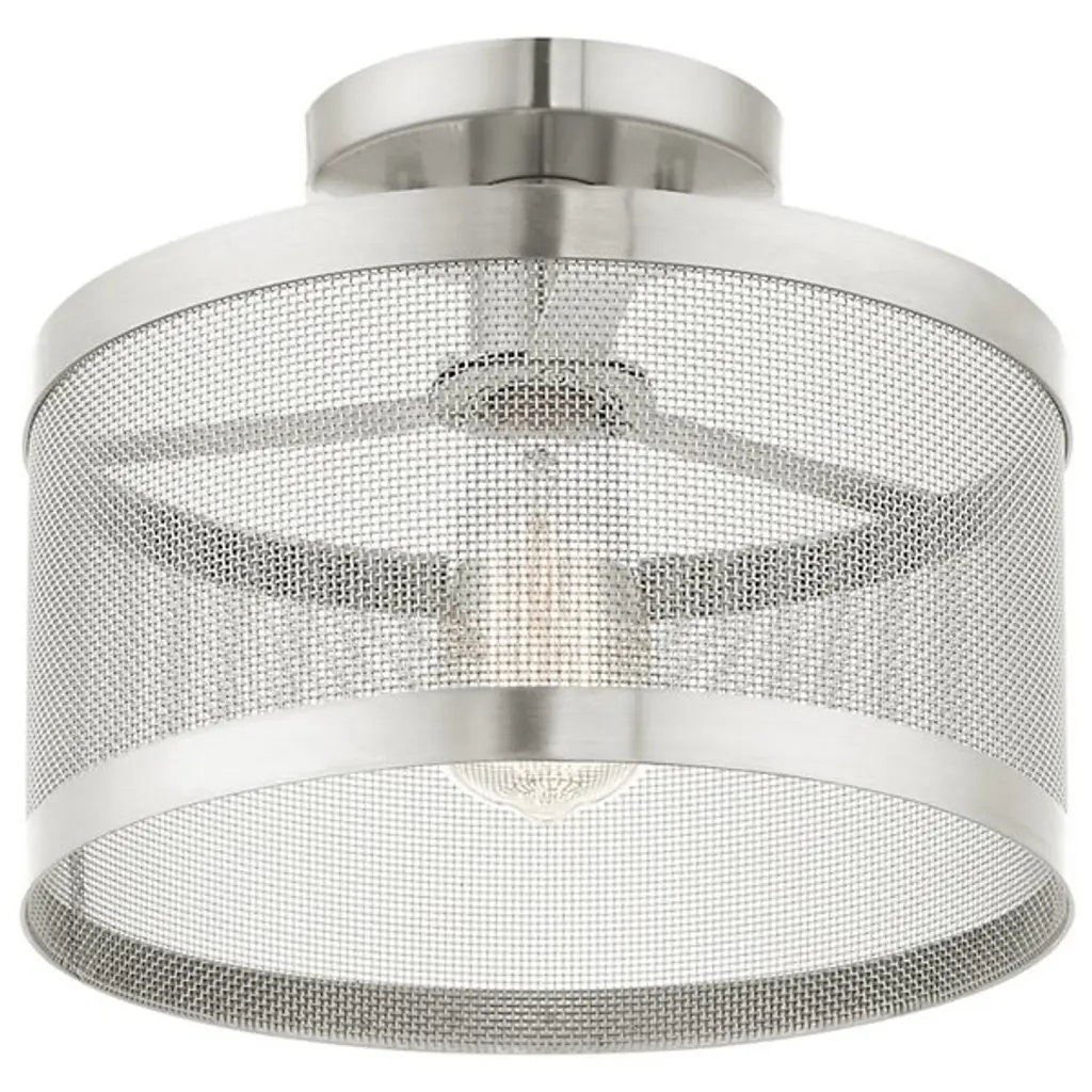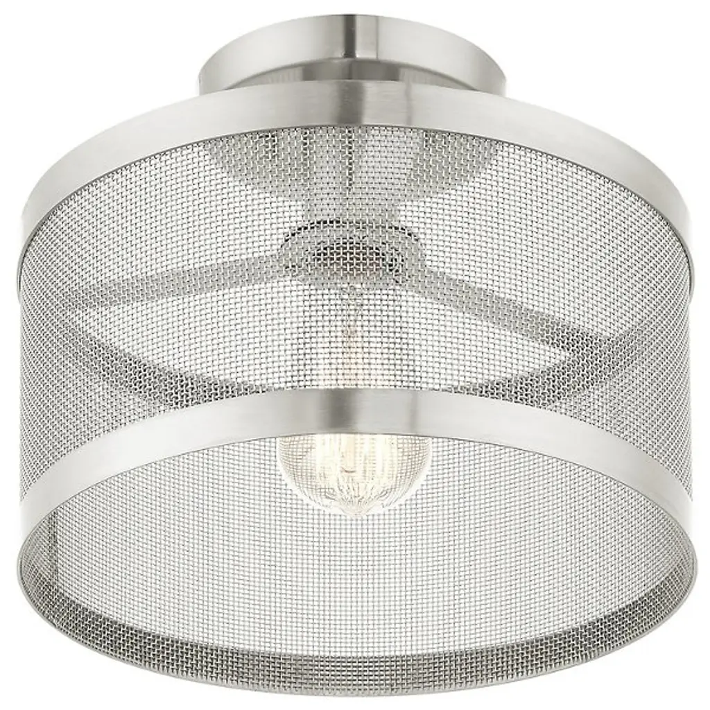 Go back to basics with the open, elegant structure of the Echo Semi-Flushmount from Alder & Ore. Ideal for low-ceilinged spaces, this robust steel fixture relies on a low-profile disc canopy to secure itself and a downward-facing single socket at its center. A broad drum shade of steel mesh with thin, vertical ring accents at its upper and lower ends extends down around the fixture’s damp-listed lamping, gentling bright light into a mix of direct downlight paired with a warm layer of light that blazes out through the sides.