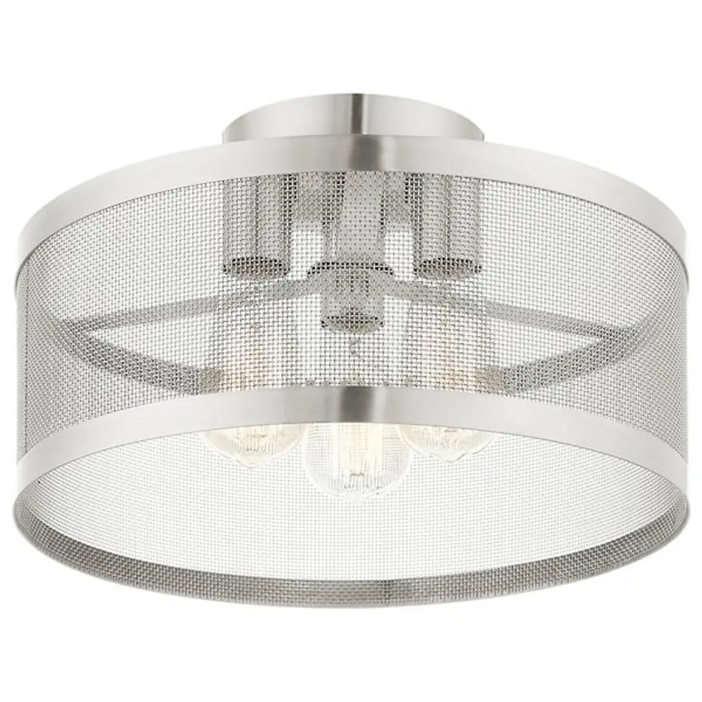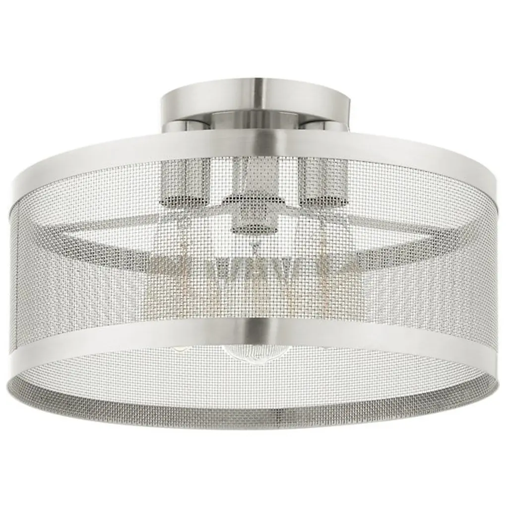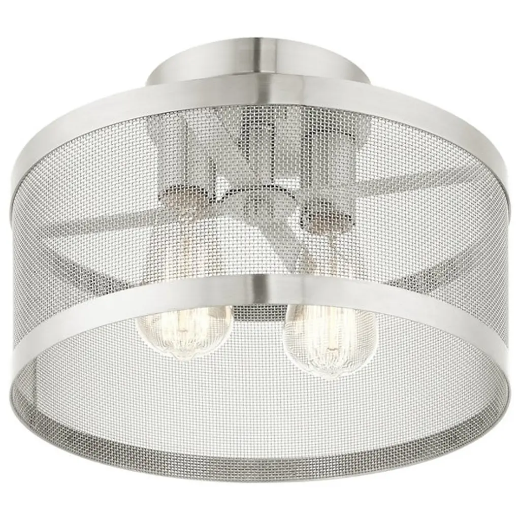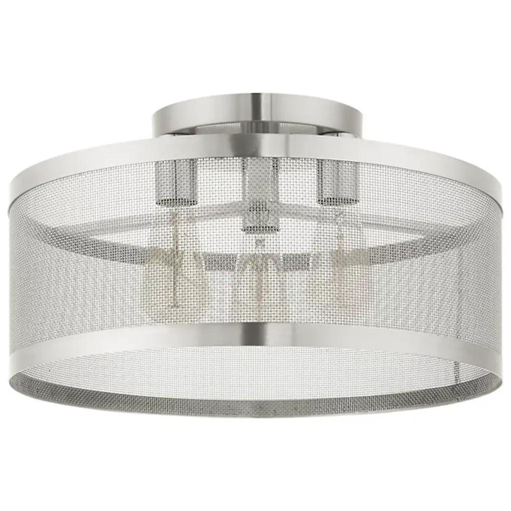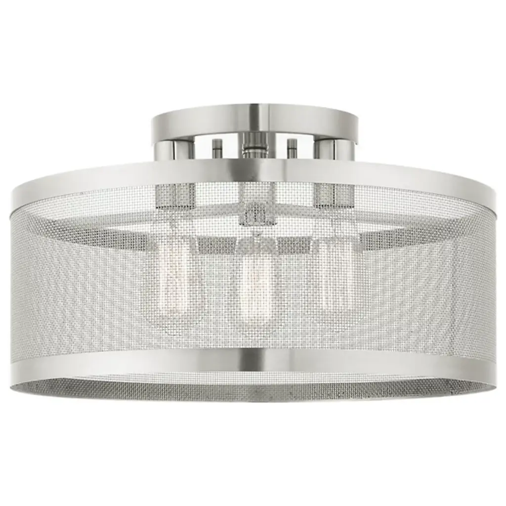Go back to basics with the open, elegant structure of the Echo Semi-Flushmount from Alder & Ore. Ideal for low-ceilinged spaces, this robust steel fixture relies on a low-profile disc canopy to secure itself and a downward-facing single socket at its center. A broad drum shade of steel mesh with thin, vertical ring accents at its upper and lower ends extends down around the fixture’s damp-listed lamping, gentling bright light into a mix of direct downlight paired with a warm layer of light that blazes out through the sides.