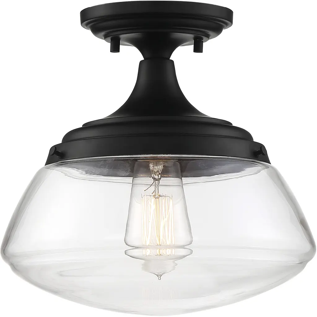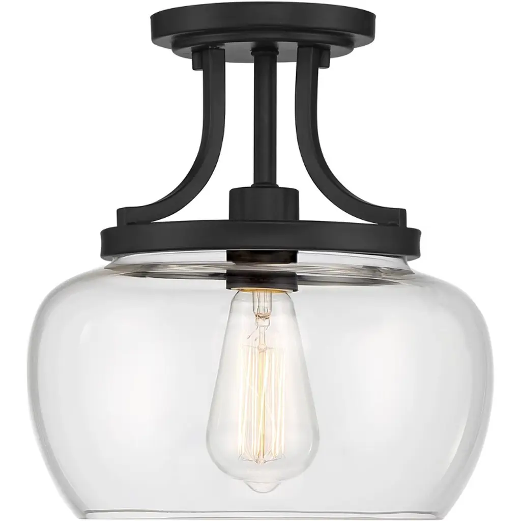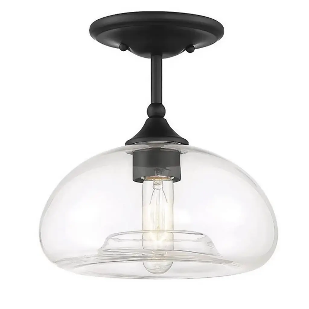 The Eleanor Semi-Flushmount from Alder & Ore puts a new spin on schoolhouse style. Extending from a clean-surfaced circle canopy, it blooms a contoured metal housing around a single socket lamp, securing a curvy clear glass shade completely around the lamping. The shaded surface captures direct light, translating it into a generous and gentle glow below.