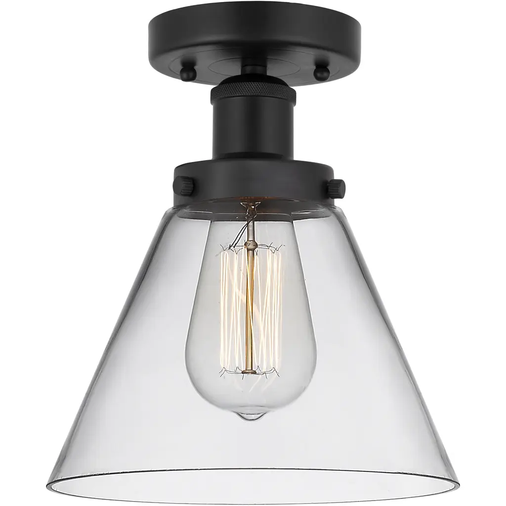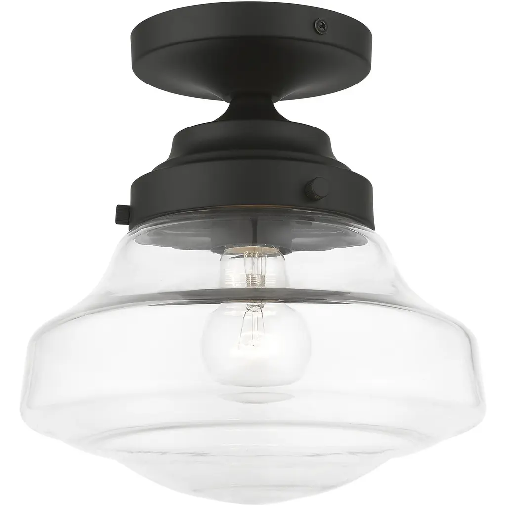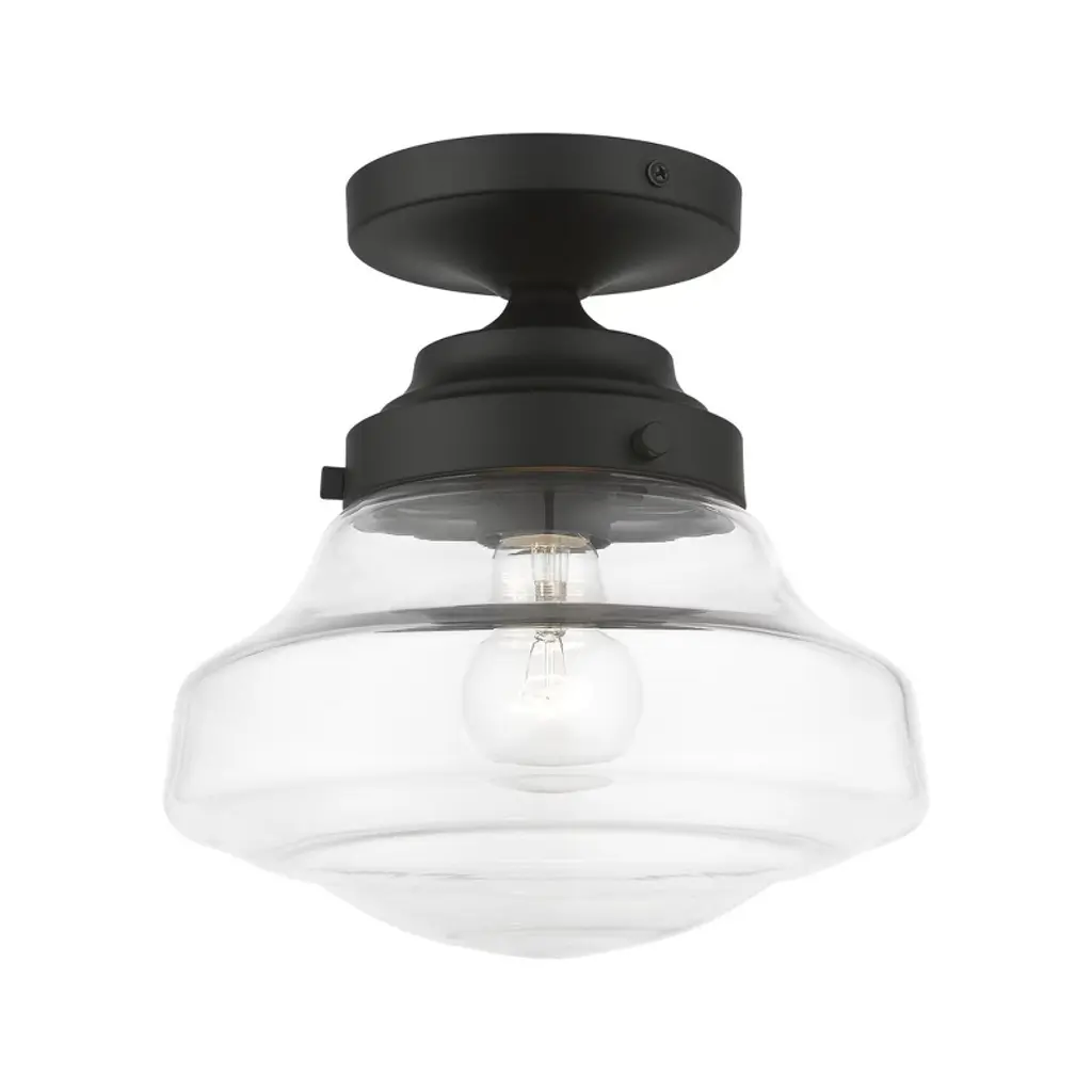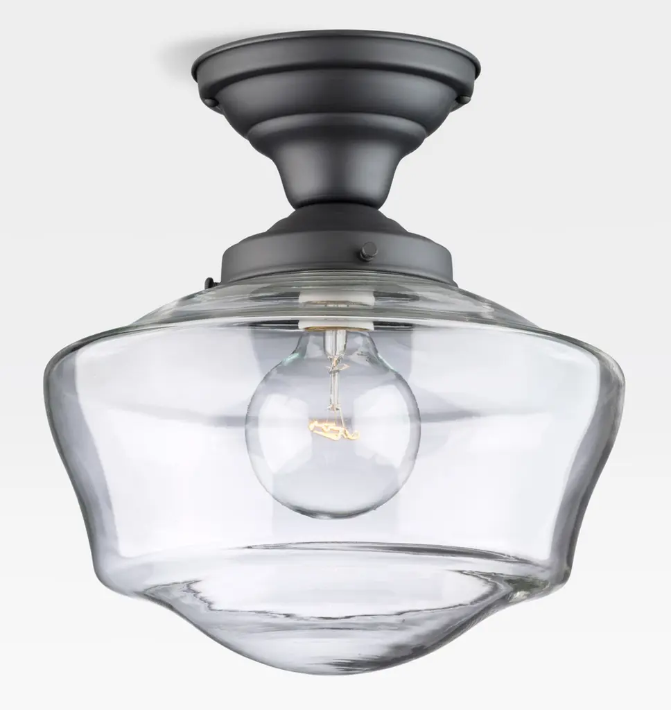 The Eleanor Semi-Flushmount from Alder & Ore puts a new spin on schoolhouse style. Extending from a clean-surfaced circle canopy, it blooms a contoured metal housing around a single socket lamp, securing a curvy clear glass shade completely around the lamping. The shaded surface captures direct light, translating it into a generous and gentle glow below.