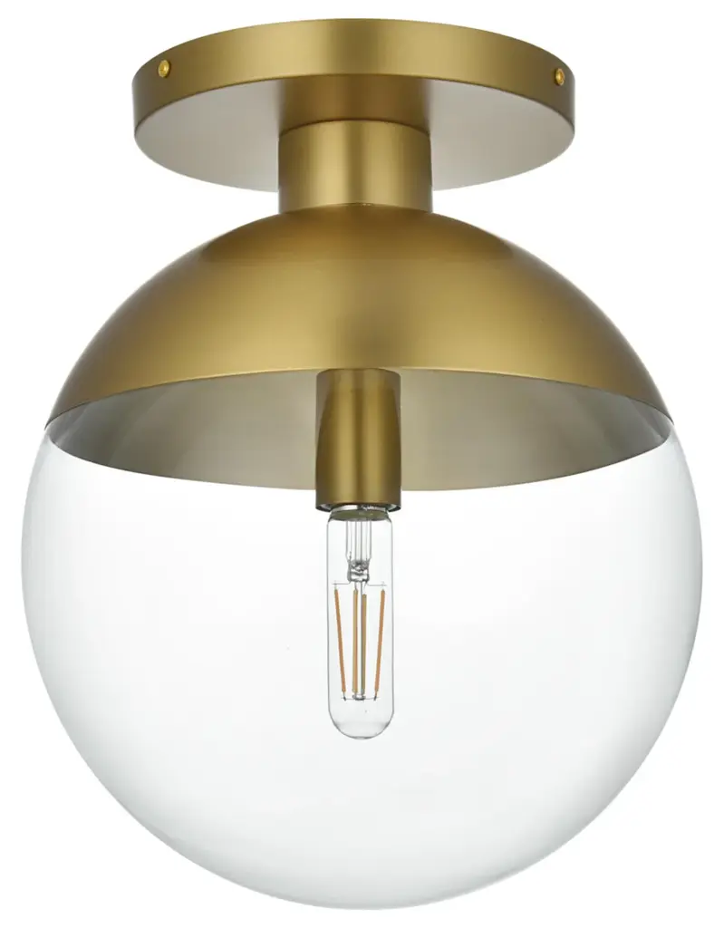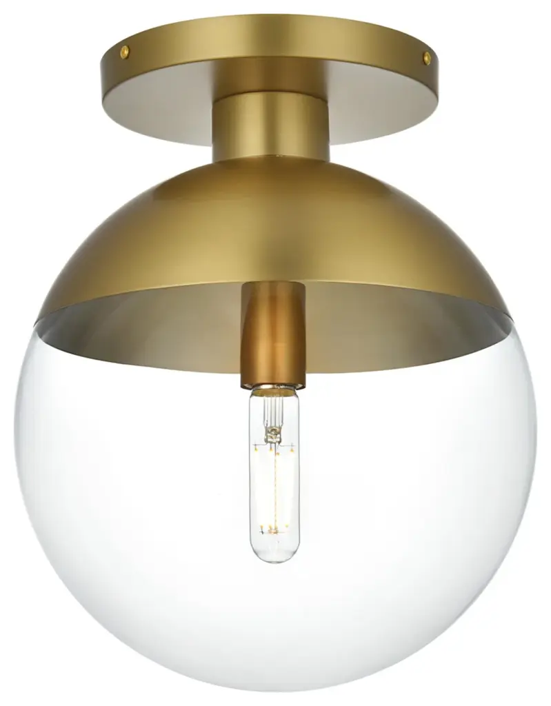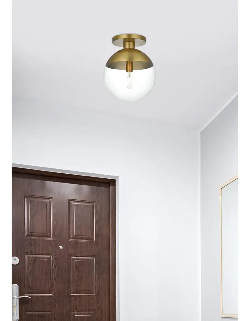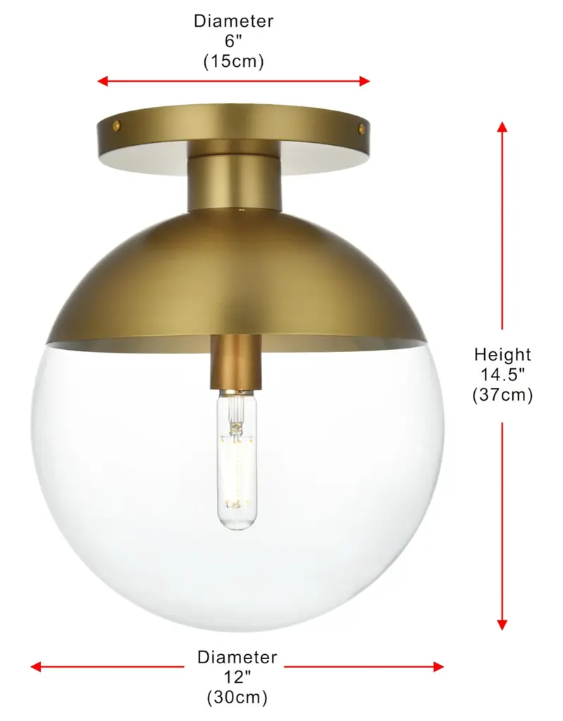 Refined style with a practical design, Eclipse flush mount bring cosmopolitan sophistication anywhere, especially to an entryway, office, bathroom, bedroom, or kitchen. The smooth iron frame features a disk-shaped canopy and comes in a finish. A touch of color on top of the spherical glass shade brings character to this classic style. Living in the big city has never been this easy. Features: Constructed from glass and iron Comes with a clear glass shade Requires (1) medium (E26) 40 watt bulb (not included) Capable of being dimmed Title 24 compliant Covered by Elegant Lighting's 1 year limited manufacturer warranty Dimensions: Height: 14-1/2" Width: 12" Depth: 12" Product Weight: 5 lbs Wire Length: 10" Shade Height: 11-1/2" Shade Width: 12" Canopy Height: 1" Canopy Width: 8" Canopy Depth: 8" Electrical Specifications: Max Wattage: 40 watts Number of Bulbs: 1 Watts Per Bulb: 40 watts Bulb Base: Medium (E26) Voltage: 110 volts Bulb Included: No
