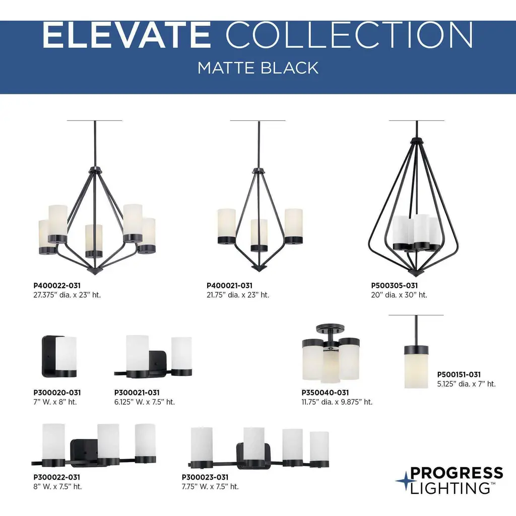 Achieve a Modern look with the Elevate Collection three-light flush mount. Etched glass white shades provide a striking contrast to the Matte Black finish. Fixtures can be installed with glass facing up or down for added customization.