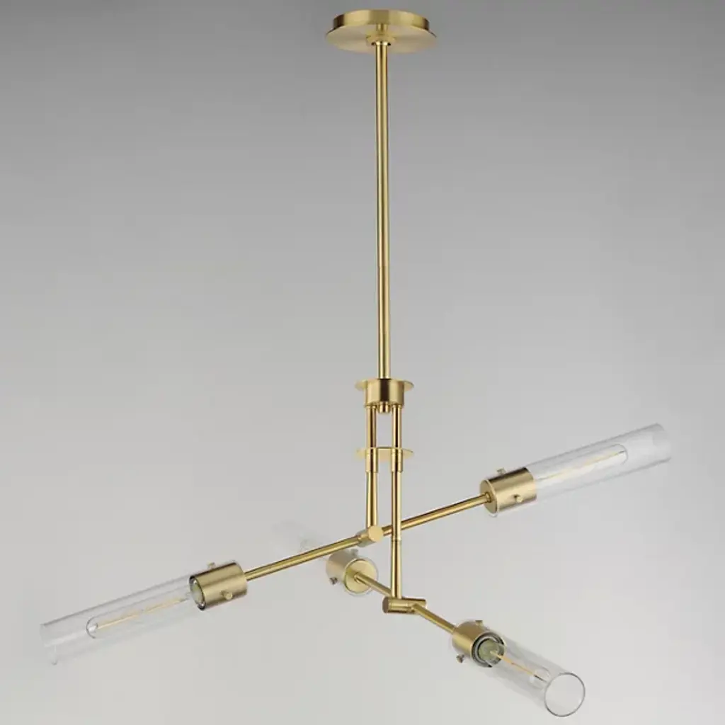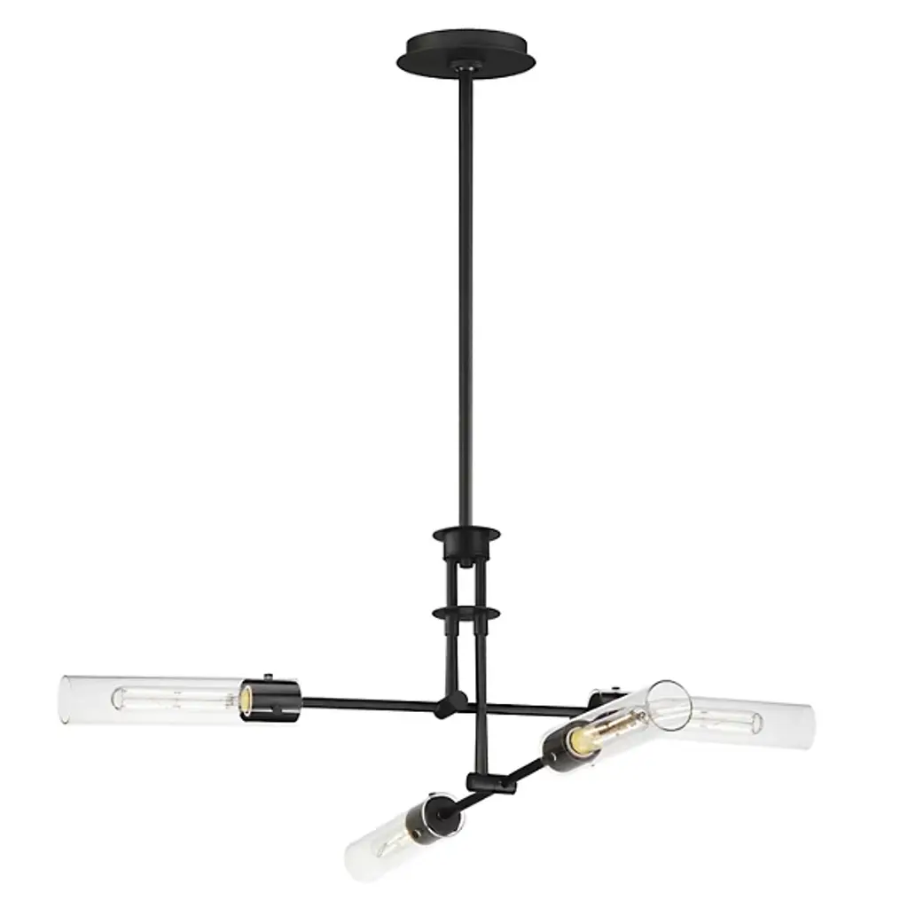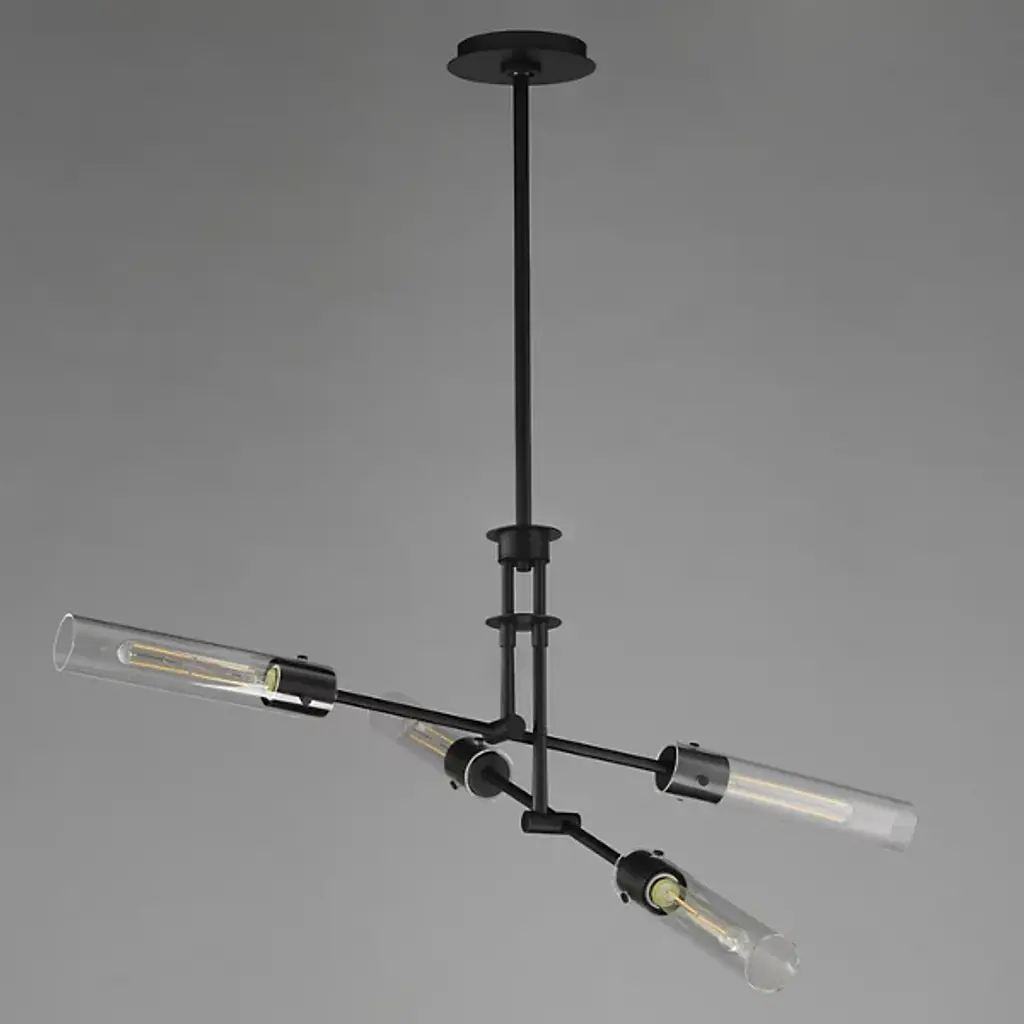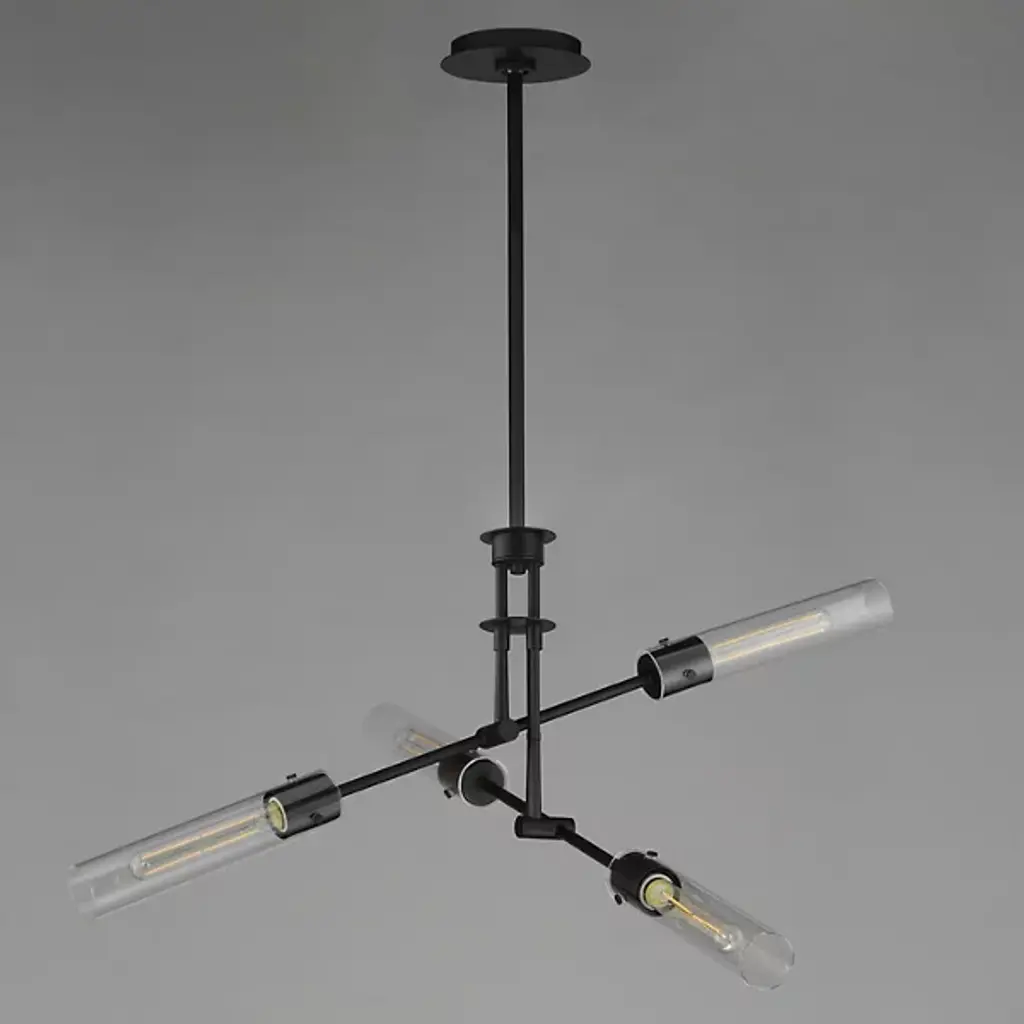 The Equilibrium Pendant / Semi-Flushmount from Maxim Lighting moves up or down and angles to create a silhouette and light spread that’s perfectly tailored. The piece makes a first impression through its modern antique style. It sports a downrod suspension that can be extended as a pendant or collapsed for a ceiling-hugging semi-flushmount. Intricate metal hardware follows below with a pair of arms that tilt to one’s liking. Clear glass cylinders and tubular bulbs extend from each side like a crisp saber. Once on, the piece generates a far-reaching glow and beautiful highlights.