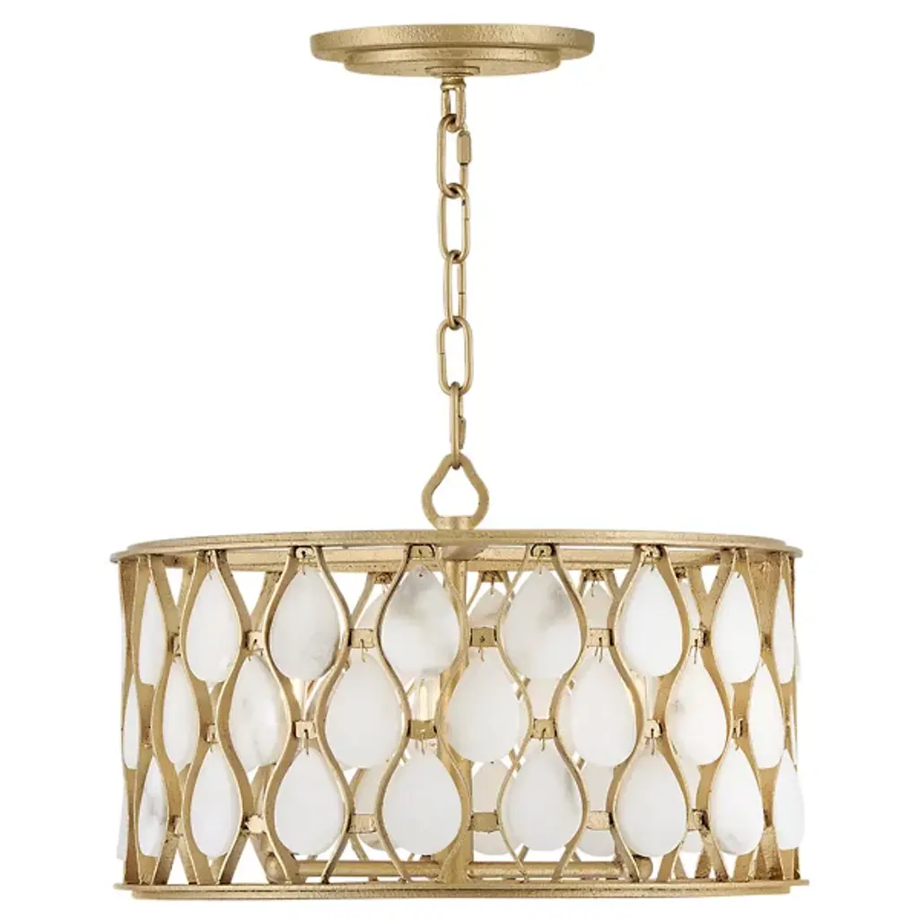 The Estie Semi-Flushmount / Chandelier from Fredrick Ramon introduces organic elegance to any space with natural alabaster stones held within a traditional latticework shade. The intricately curved metalwork beautifully complements the frame, chain, and canopy, adding a touch of sophistication to this luminaire. With its blend of luxurious materials and timeless design, Estie becomes a statement piece, seamlessly merging traditional craftsmanship with natural beauty to create an inviting and refined ambiance in any setting.