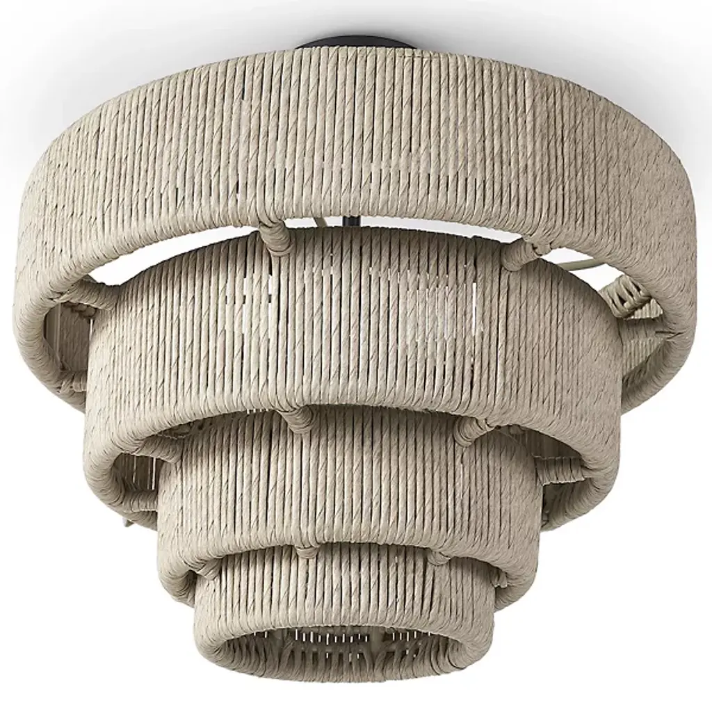 The Everly Outdoor Semi-Flushmount from Palecek features a synthetic abaca weave around a metal frame designed for withstanding weather exposure. The tiered, woven shade and a glass globe within protect the bulb from damage in all weather conditions. All-weather synthetic fibers retain their appearance despite varying outdoor conditions, while the metal framework provides structural support. This fixture works in covered porches where both protection from elements and decorative appeal are important considerations for outdoor lighting needs in entertaining areas.