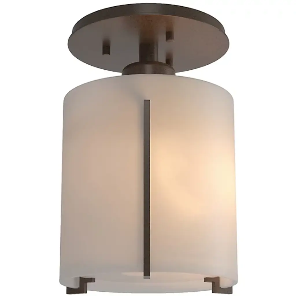 The Hubbardton Forge Exos Round Semi-Flushmount creates a layer of warm illumination in a design inspired by the Arts and Crafts style. The Exos Round Semi-Flushmount features hand-forged wrought iron body, hand-blown glass shade and translucent finishes.