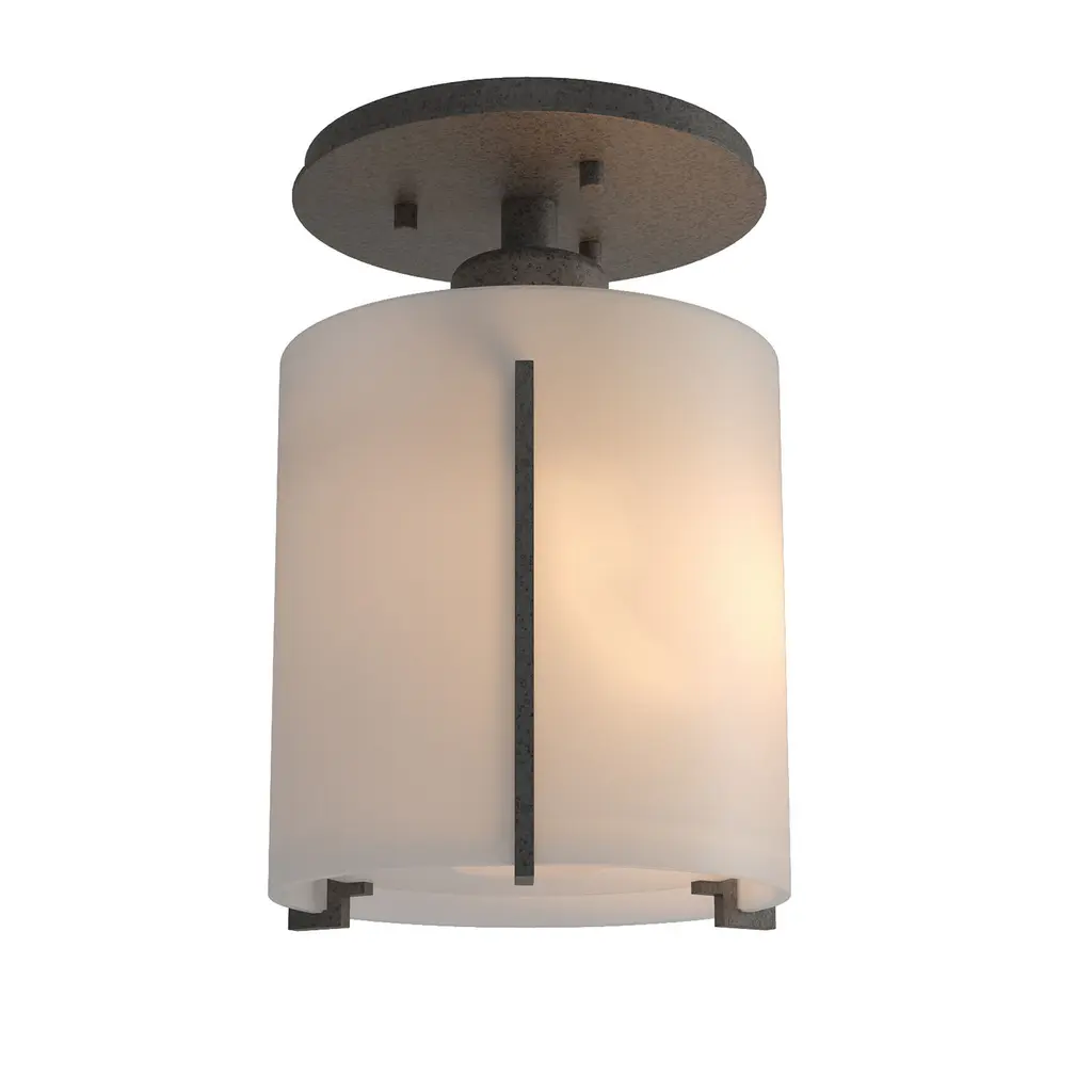 The Hubbardton Forge Exos Round Semi-Flushmount creates a layer of warm illumination in a design inspired by the Arts and Crafts style. The Exos Round Semi-Flushmount features hand-forged wrought iron body, hand-blown glass shade and translucent finishes.