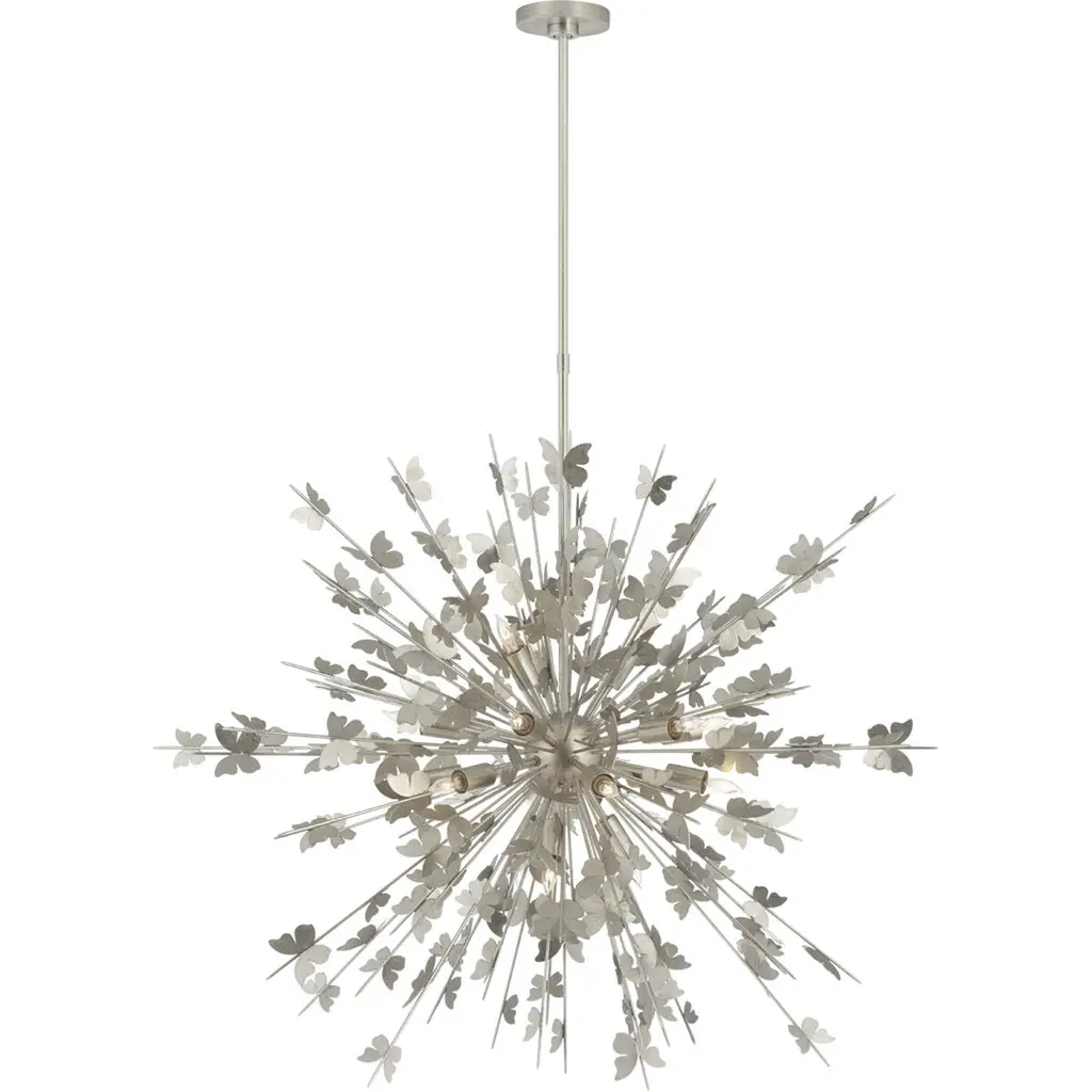 Indoor décor takes flight with the fabulous, fluid lines of the Farfalle Semi-Flushmount from Visual Comfort Signature, formerly known as Visual Comfort, A tasteful blend of transitional structure with a fantastical flight of butterflies, it uses a rounded disc canopy to suspend a slender central downrod below, steadying a crown of damp-listed candelabra-style lamps above the fixture’s flaring metal shade. Curling branches bedecked with contoured leaves of smooth metal shaped to imitate a flock of butterflies in flight reduce direct glare, transforming light from the lamping into a glittering glow that extends out from every opening in the shade.