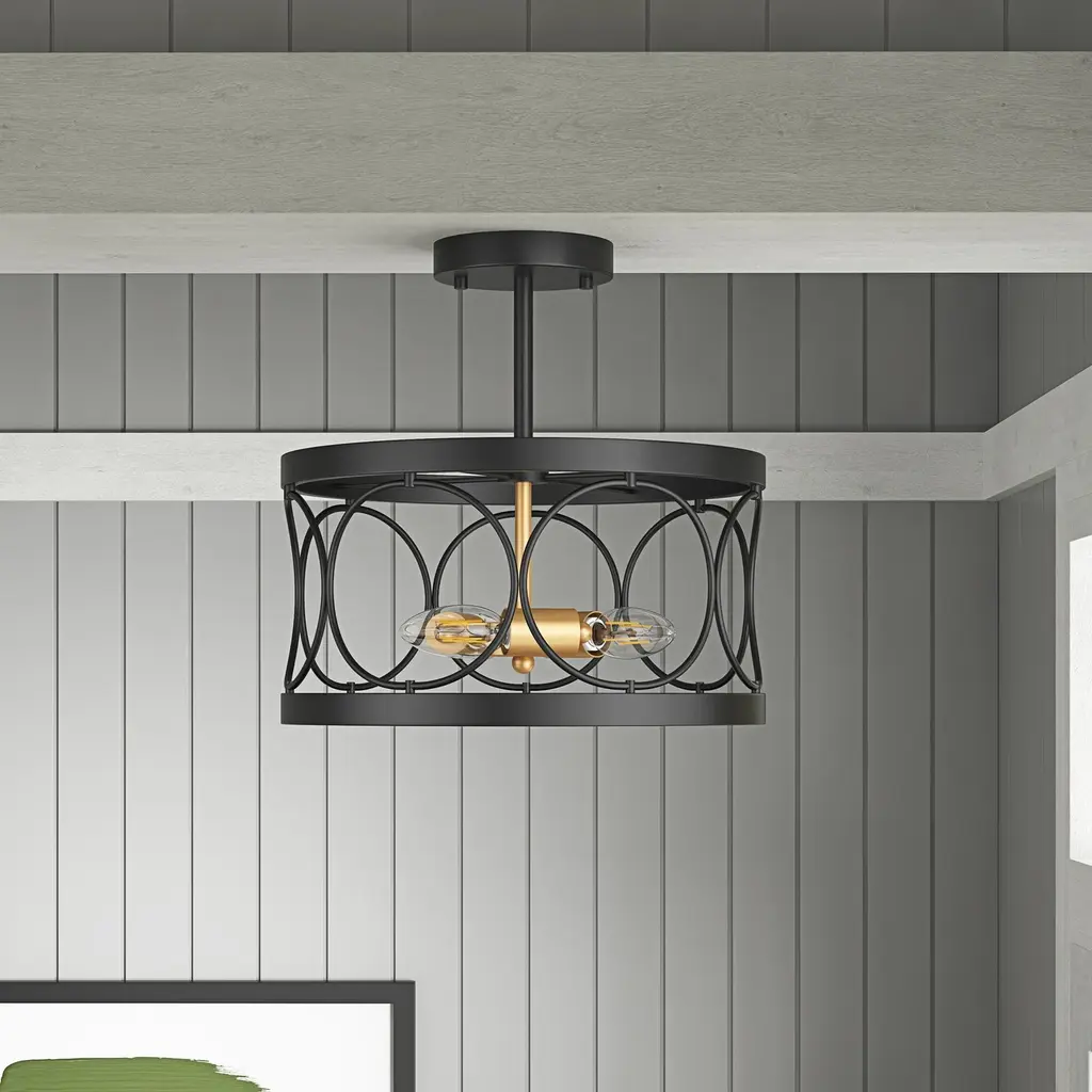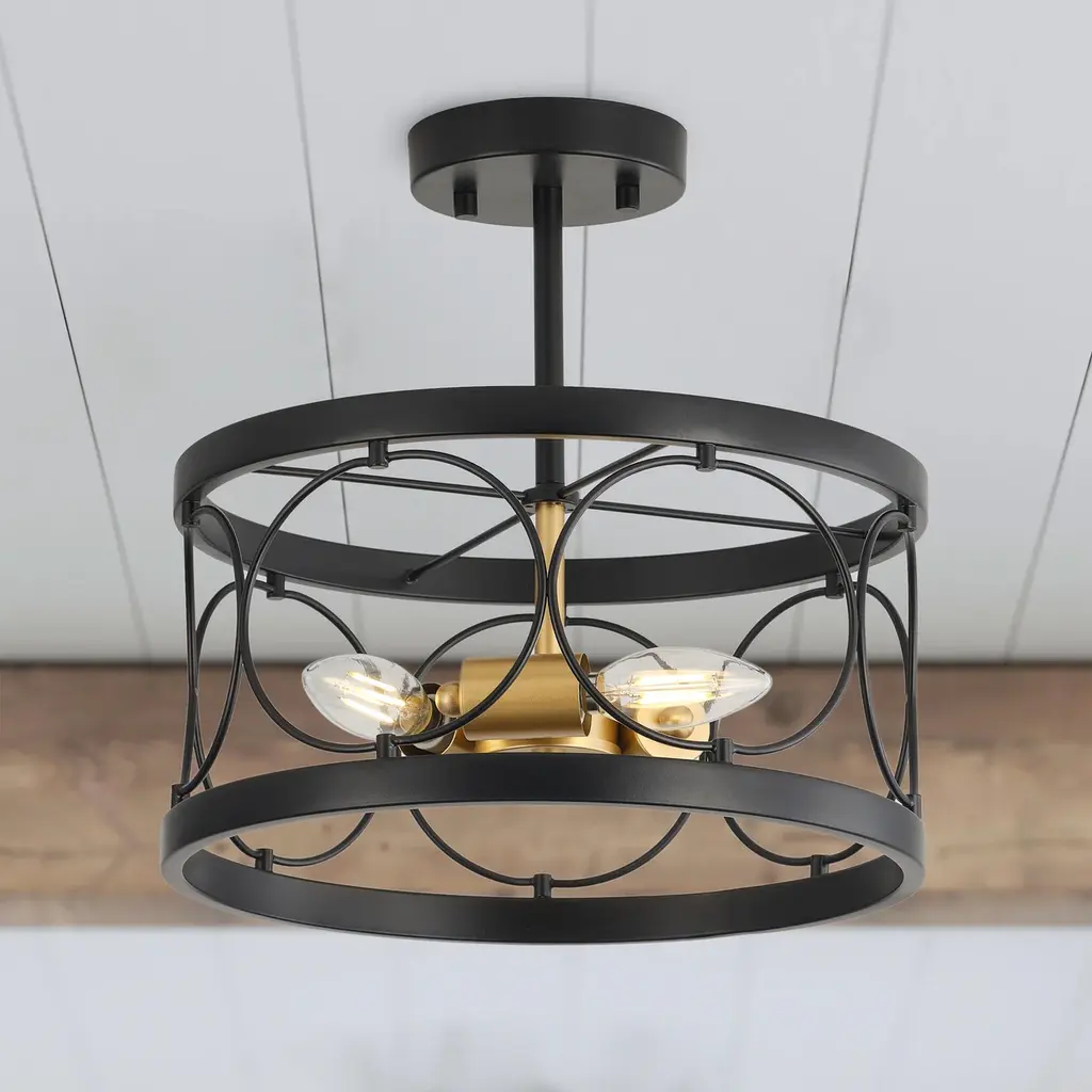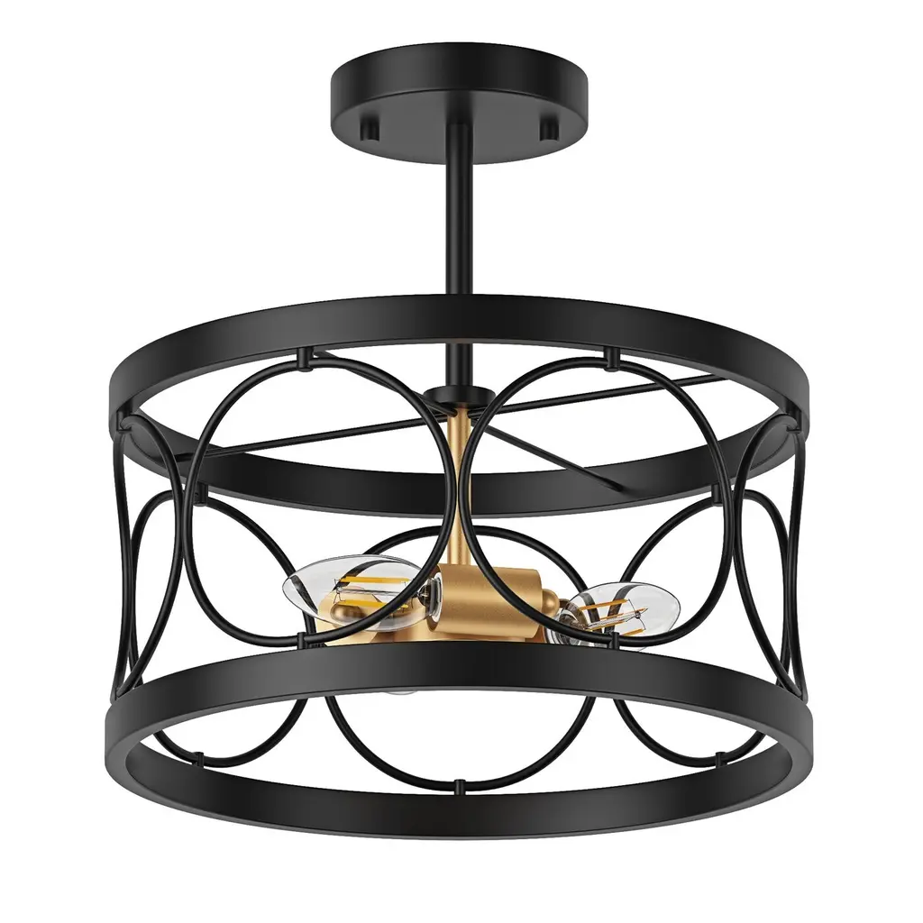 Farmhouse 3-Light Openwork Metal Drum Shade Semi-Flush Mount Ceiling Light - Black