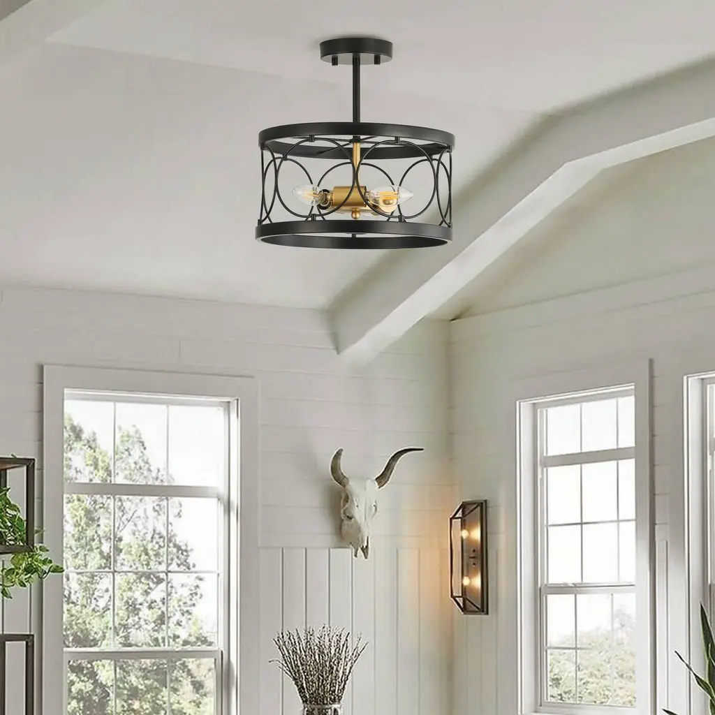 Specifications: Farmhouse Style: The farmhouse ceiling light fixture is crafted from metal, creating a rustic look, it showcases both classic and striking design elements with its openwork, perfect for home decoration, and suitable for tasteful people.Quality Assurance: High-quality iron was used to craft the ceiling light. All products in the factory have to undergo rigorous safety monitoring, to ensure quality and safety, which is beautiful, corrosion-resistant, and durable for a long time.Easy to Install: All installation hardware and installation instructions are included in the package for you. We simplify all the complex steps to ensure an easy & quick installation process for you. If you have any problems please feel freely to contact us.ETL Listed & Bulb Requirement: ETL Listed for your safety. The ceiling light is a built-in standard E12 socket, suggest using the dimmable E12*3 base bulb (Max 40W, 120V), it could be fully dimmable and compatible dimmer switch. Bulbs and dimmer switch not included.Perfect Decoration: The farmhouse and simple design of the ceiling makes it easily goes with your home. It can be used in the kitchen, bedroom, dining room, living room, hallway, porch, entrance, stairs, study, office, cafeteria, farmhouse, club, bar, etc.