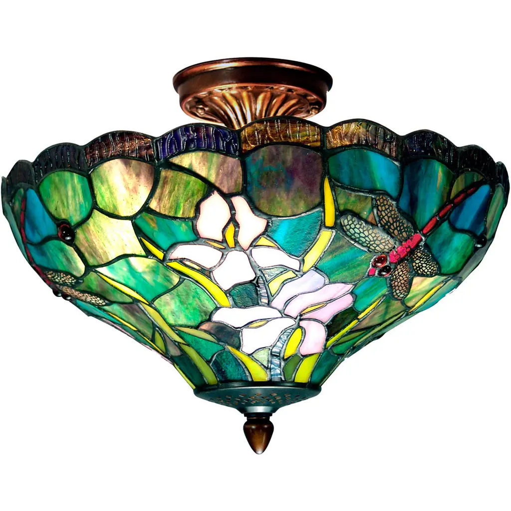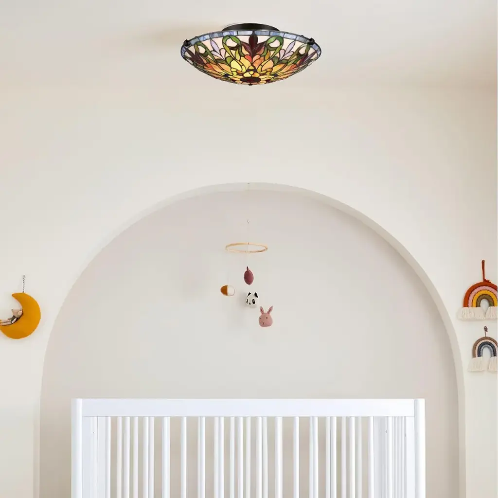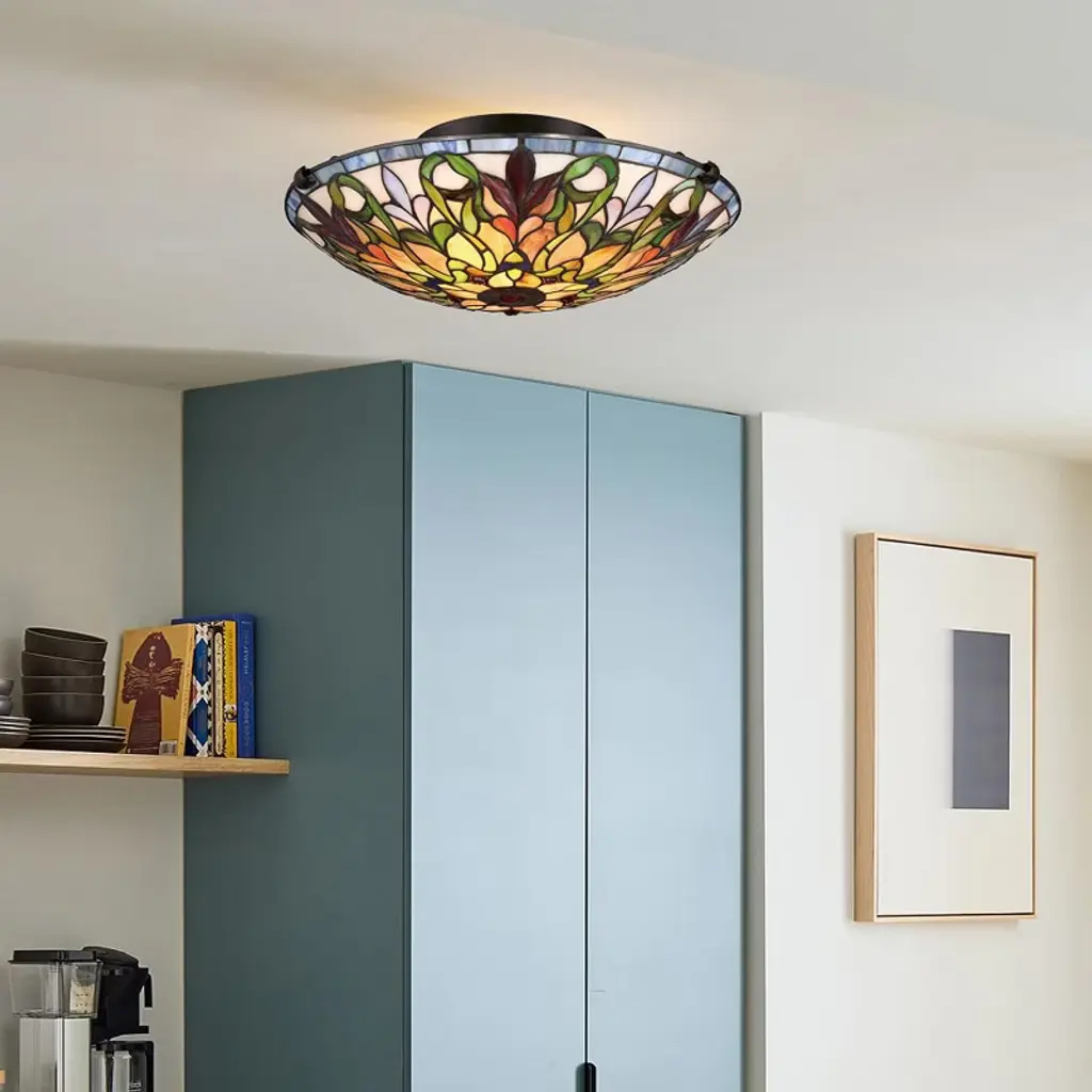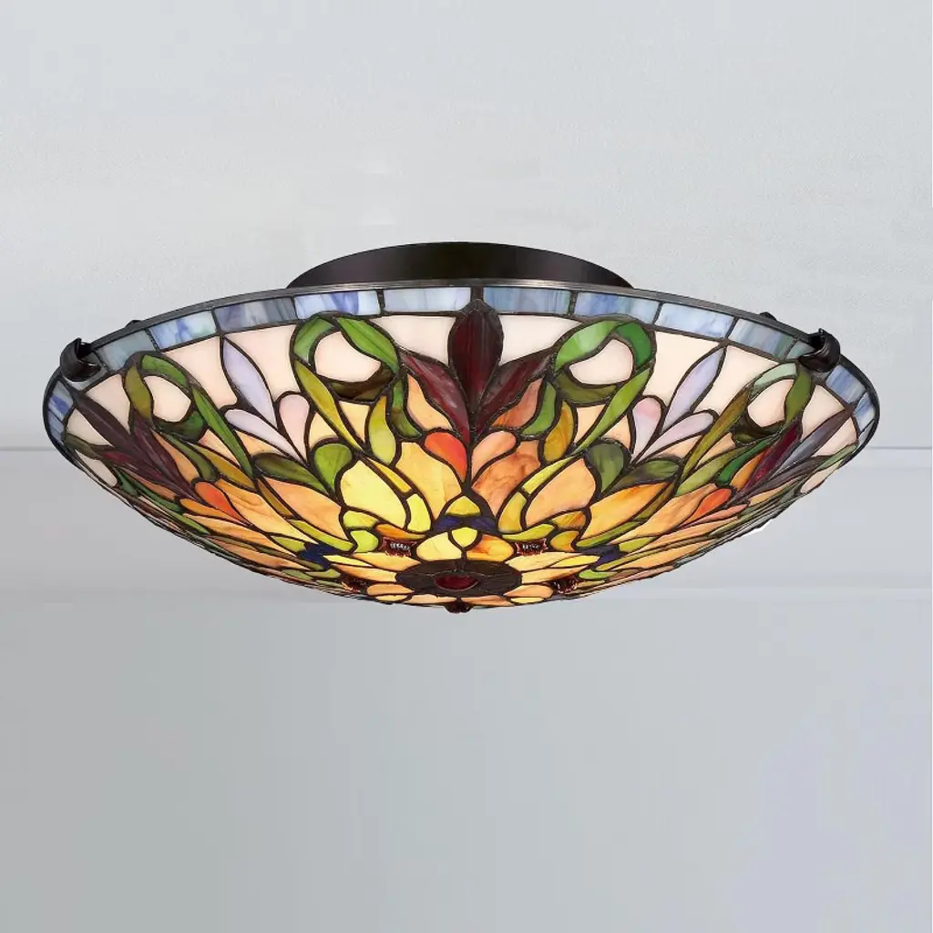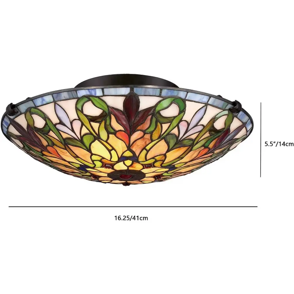 The Fine Art Lighting Semi-Flush Mount Tiffany Ceiling Lamp is a stunning piece of craftsmanship that combines elegance and functionality. It features a handcrafted stained-glass shade made from 330 pieces of genuine stained glass, showcasing a geometric floral design. When illuminated, the vibrant colors create a warm and inviting ambiance, making it a focal point in any room. This lamp is versatile and can be used in bedrooms, living rooms, or offices. It requires two A19 bulbs (75W each, not included) and has a sturdy base with a dark finish for stability and safety. Key Benefits Elegant Low-Profile Fixture: Adds beauty without needing high ceilings Art Glass Craftsmanship: Hand-cut stained glass creates one-of-a-kind glow Vintage Aesthetic: Brings timeless Tiffany charm to any traditional or eclectic space Warm Lighting Effect: Stained glass diffuses light softly for cozy ambiance Easy Ceiling Upgrade: Perfect for replacing flush mounts with upgraded design