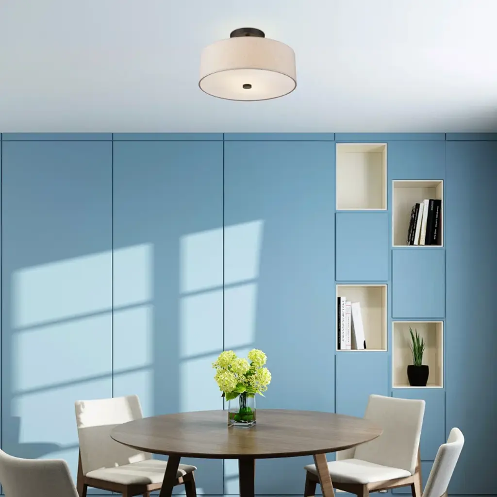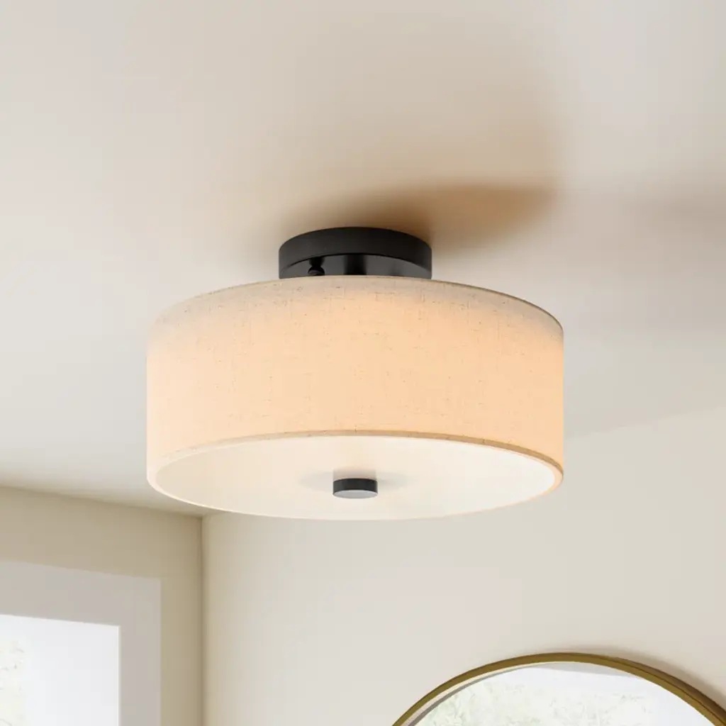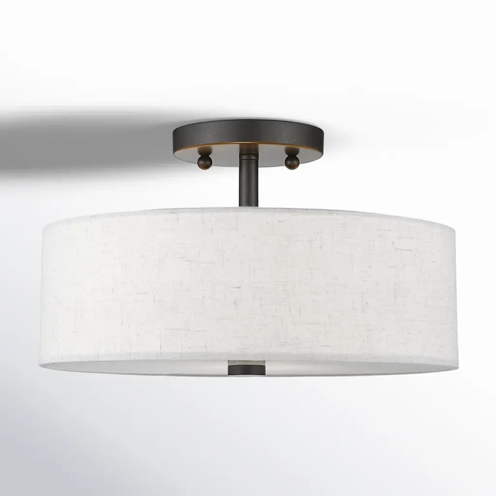 This Flaire 2-Light Semi-Flush Mount illuminates your home in a classic, contemporary design. The frame is made from metal and features a fabric drum shade that is capped with a plastic diffuser and a round finial in a metallic finish. Inside sit two 40W bulbs (not included) that cast a bright glow throughout your space. This fixture is compatible with a dimmer switch to effortlessly take you from day to night. Plus, it's rated for damp areas so you can add it to your bathroom with a steamy shower.