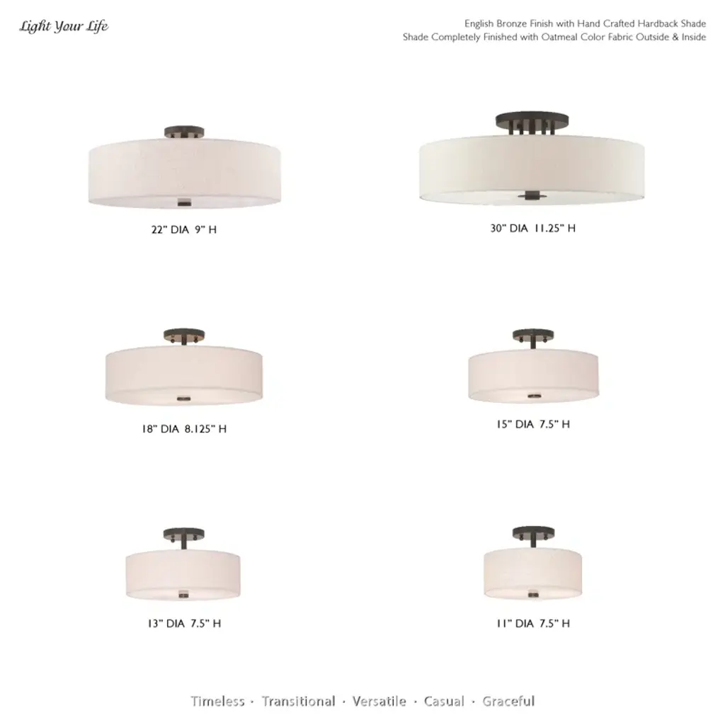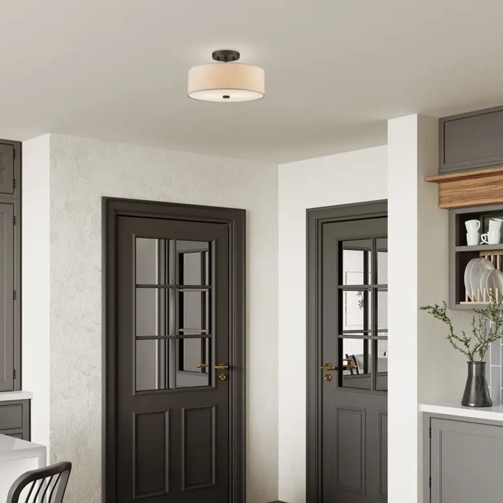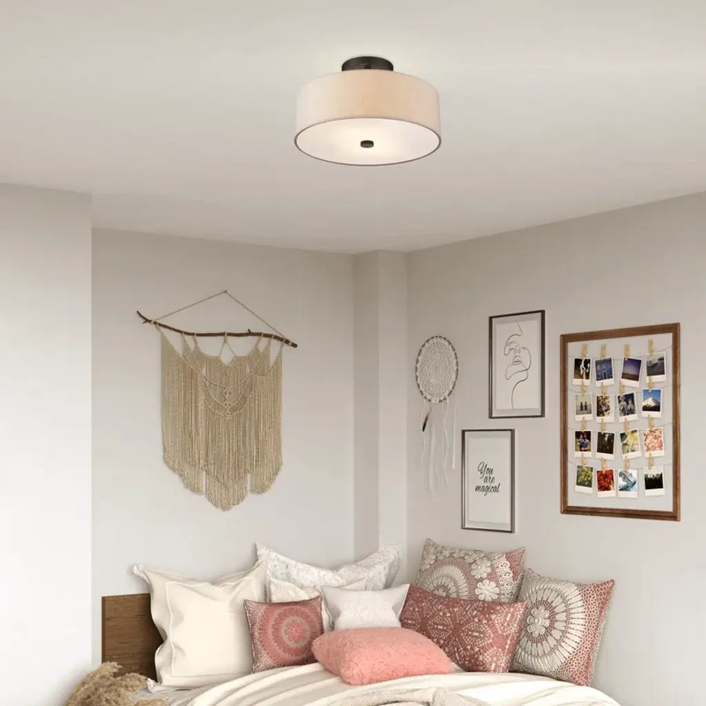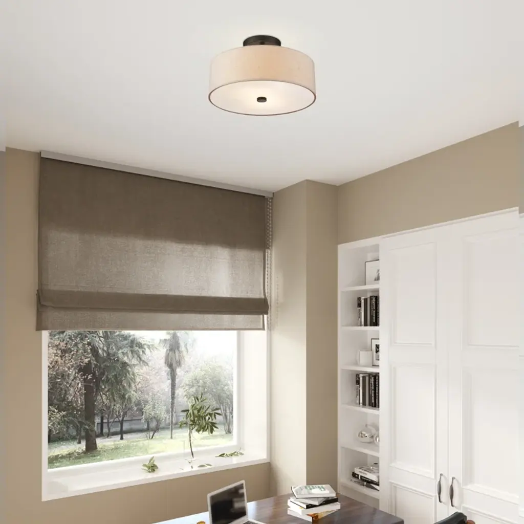 This Flaire 2-Light Semi-Flush Mount illuminates your home in a classic, contemporary design. The frame is made from metal and features a fabric drum shade that is capped with a plastic diffuser and a round finial in a metallic finish. Inside sit two 40W bulbs (not included) that cast a bright glow throughout your space. This fixture is compatible with a dimmer switch to effortlessly take you from day to night. Plus, it's rated for damp areas so you can add it to your bathroom with a steamy shower.