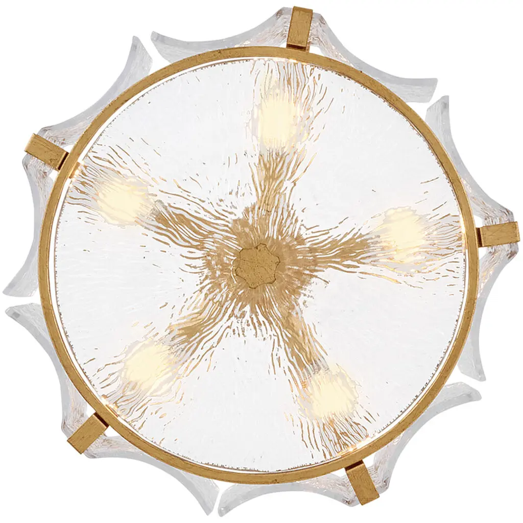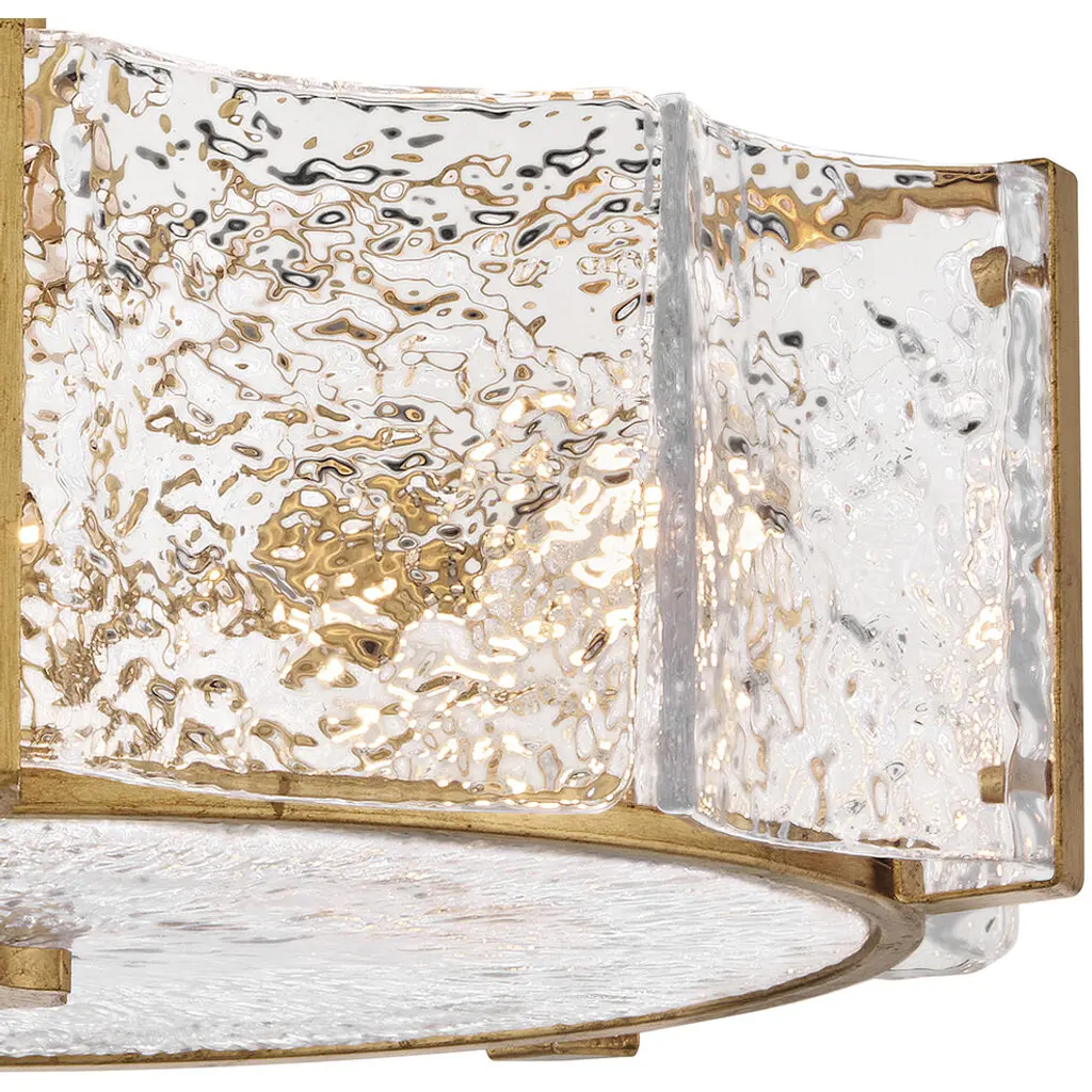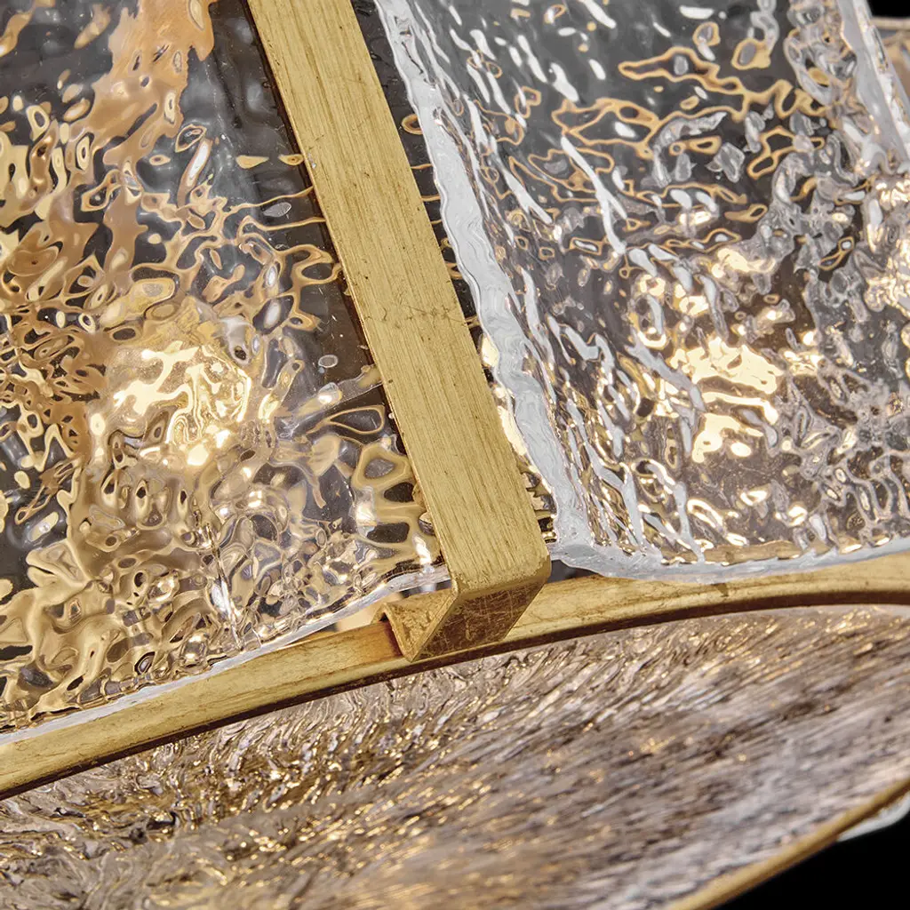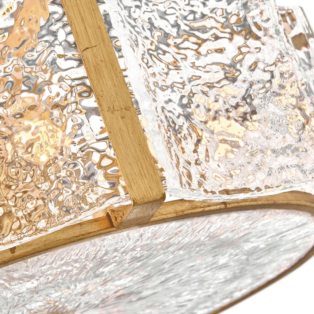 Exquisitely styled with a flowing, crystalline appearance, Florians clear pressed glass shade creates an almost aqueous illusion with a subtle texture that gently diffuses light from warm candelabra lamps. A polished metal frame reflects abundant illumination in radiant Distressed Brass or Glacial finishes without seeming too ostentatious.