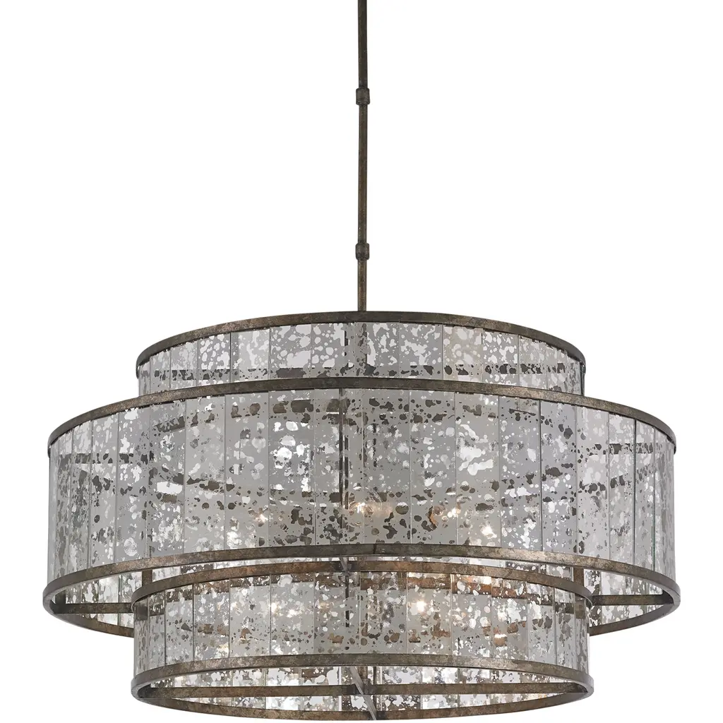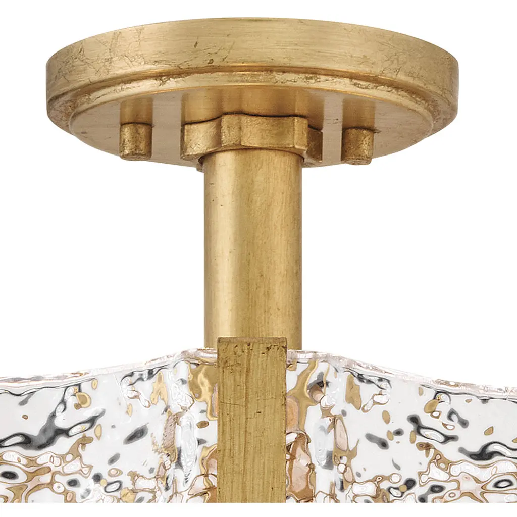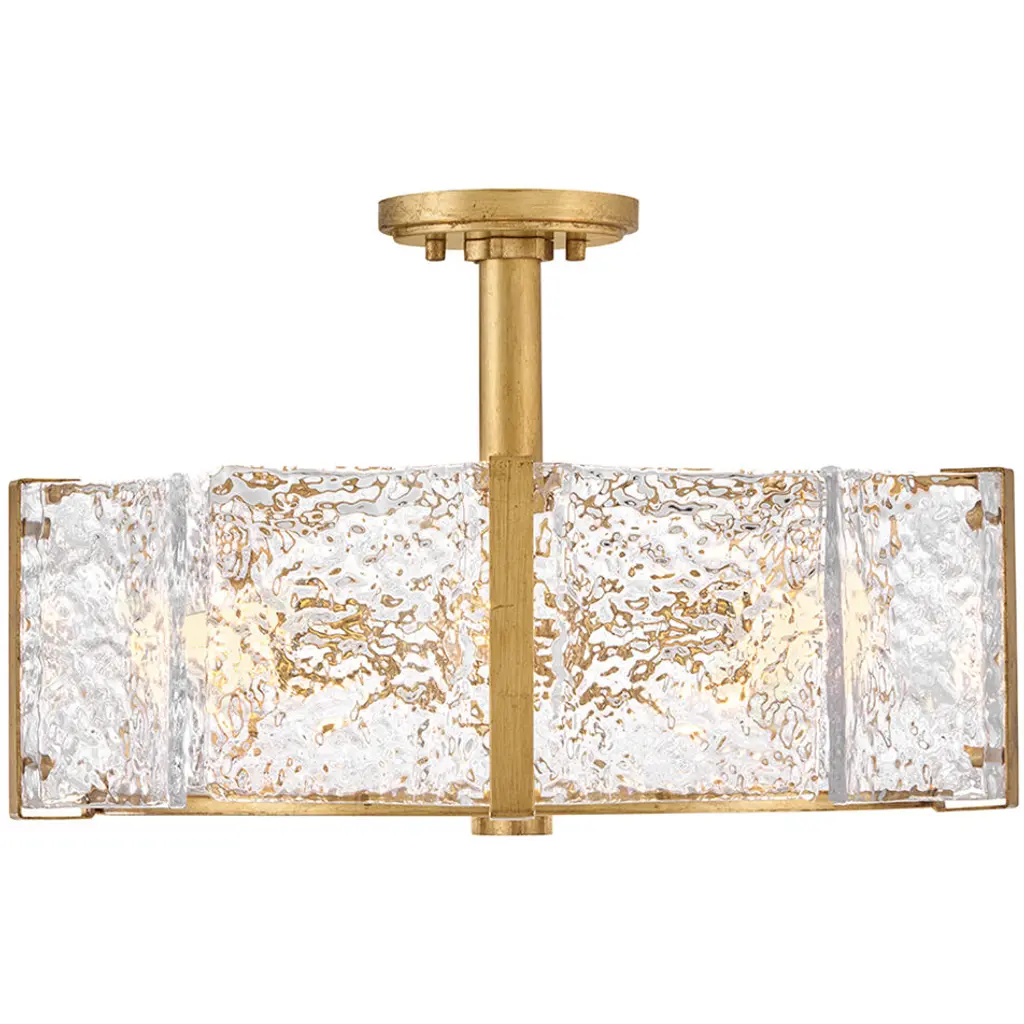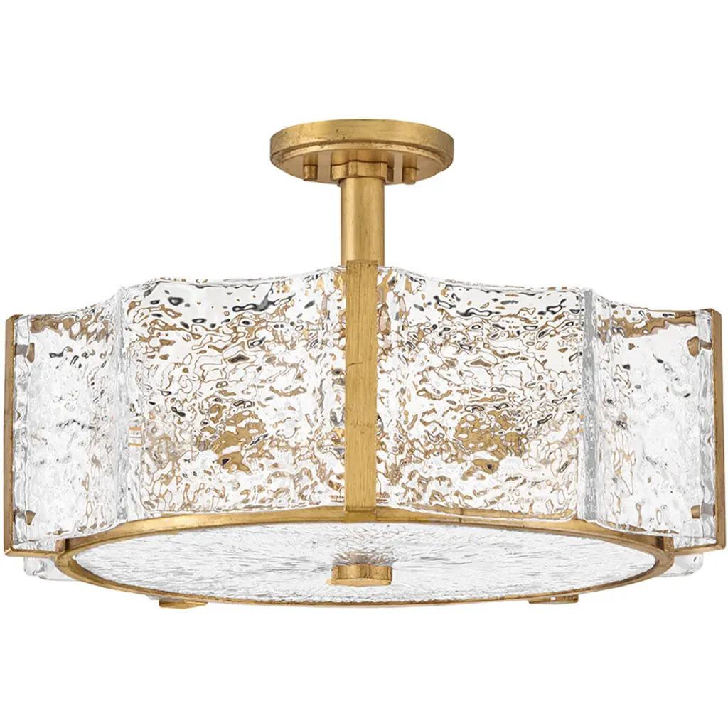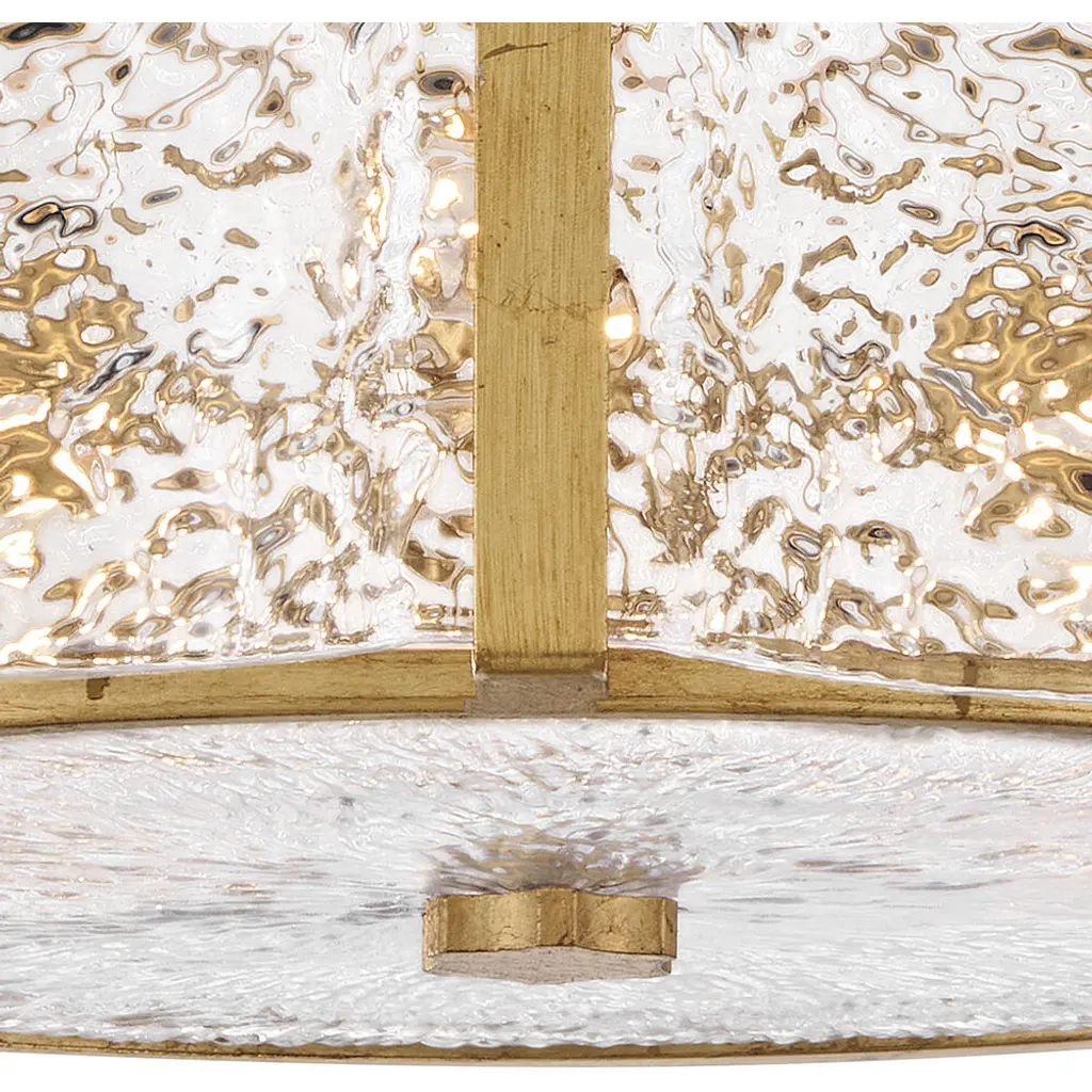 Exquisitely styled with a flowing, crystalline appearance, Florians clear pressed glass shade creates an almost aqueous illusion with a subtle texture that gently diffuses light from warm candelabra lamps. A polished metal frame reflects abundant illumination in radiant Distressed Brass or Glacial finishes without seeming too ostentatious.